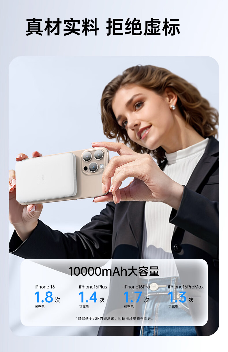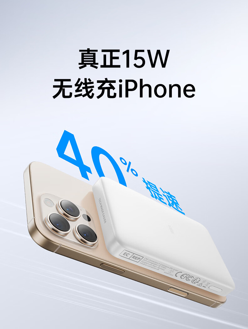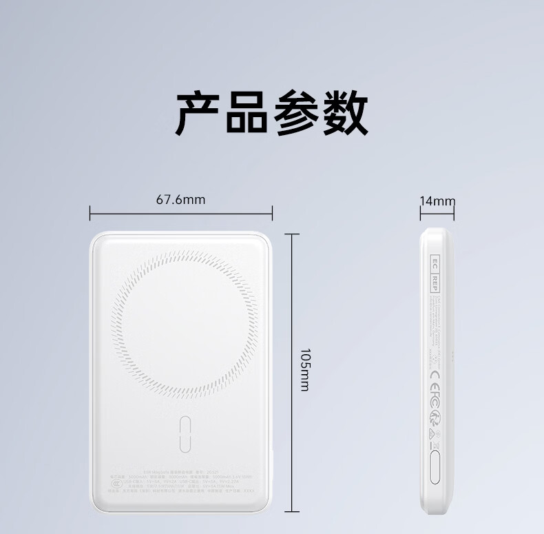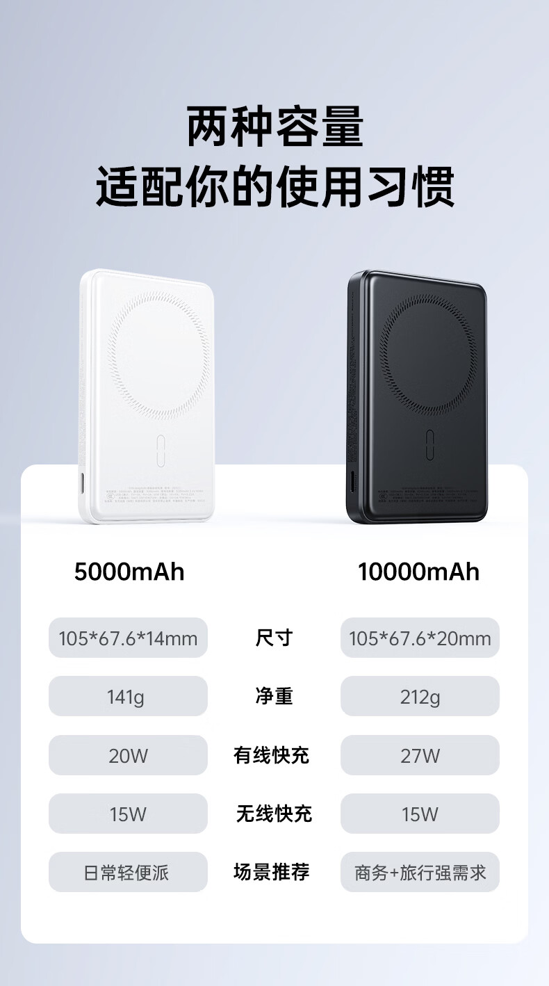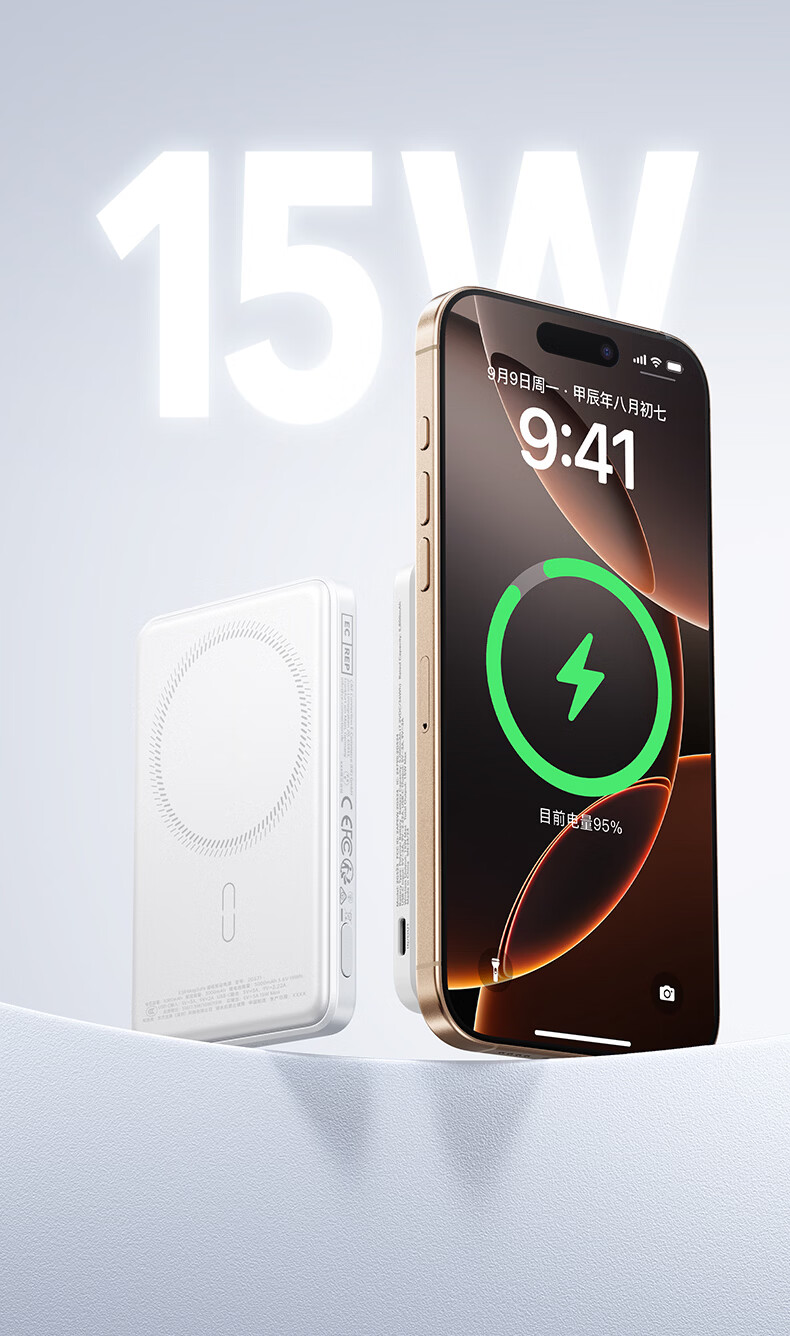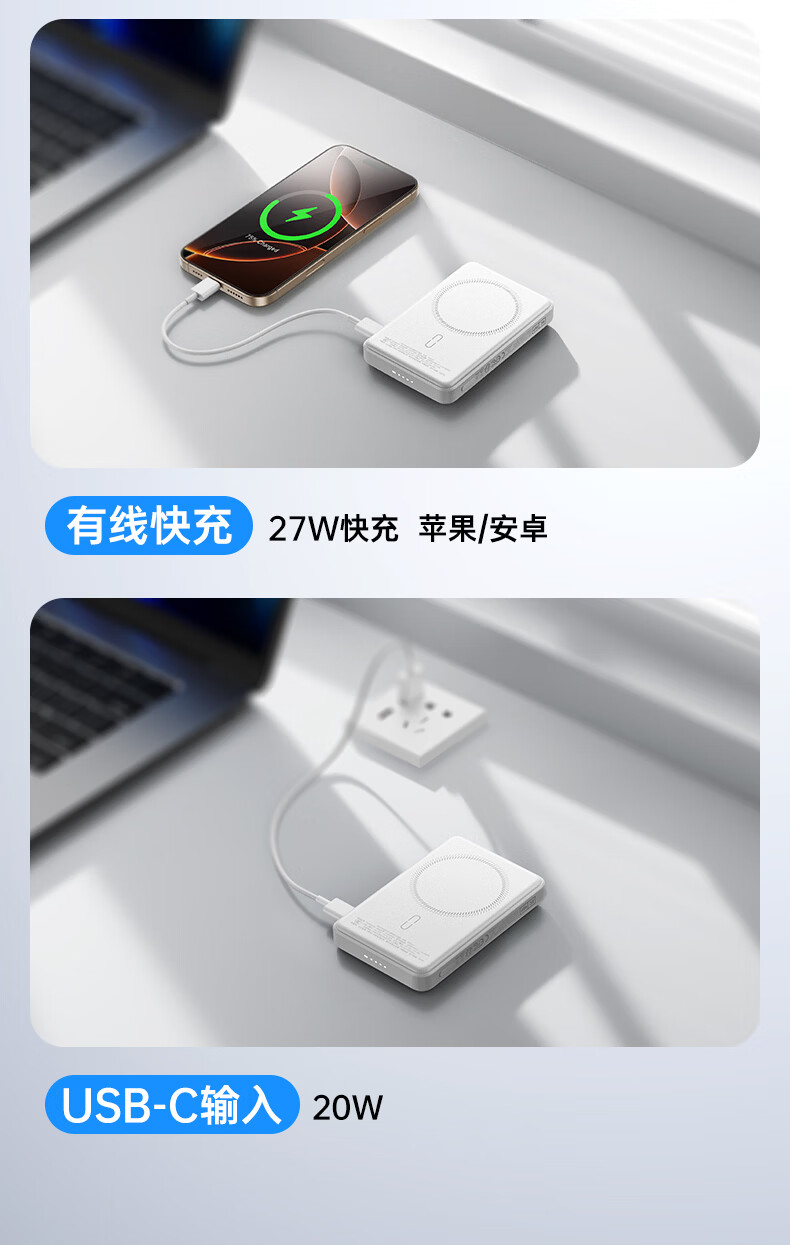 亿色【3C认证】磁吸充电宝Magsafe无线15W快充27W有线移动电源5千/1万毫安可上飞机适用于苹果华为小米 5000毫安【苹果15W无线充丨20W有线充】 典雅白