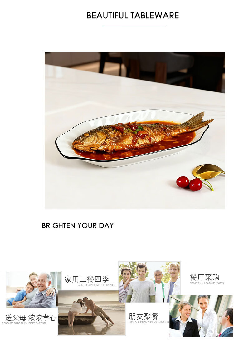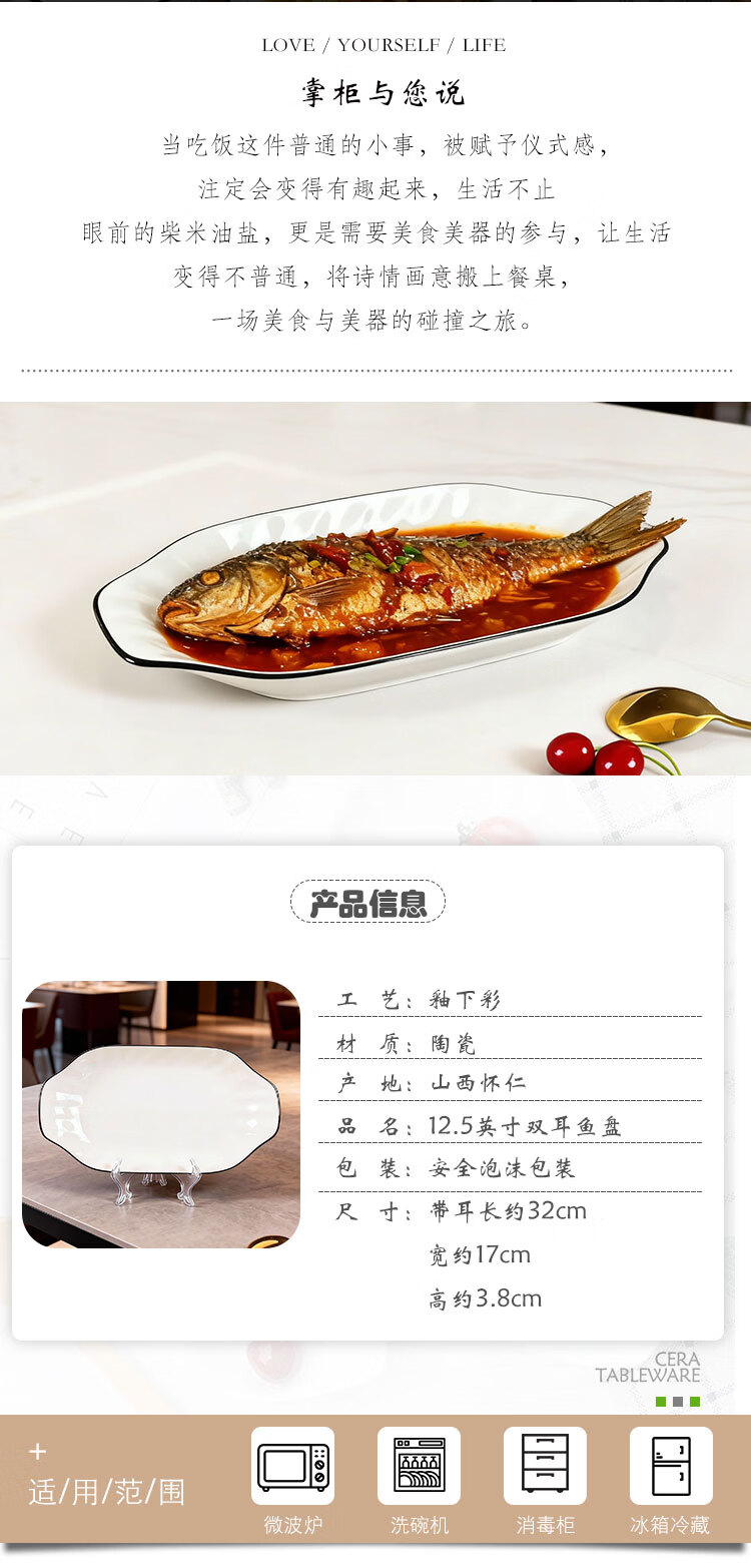 肃匠家用盘子陶瓷蒸鱼盘子釉下彩鱼盘子双耳蒸鱼专用盘餐具创意盘子 黑线12.5英寸双耳鱼盘 2个 32cm