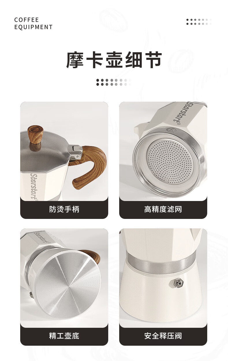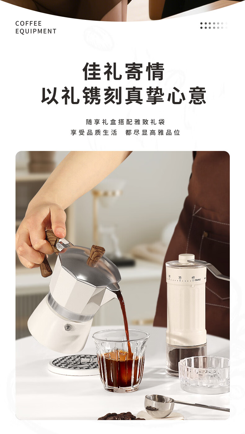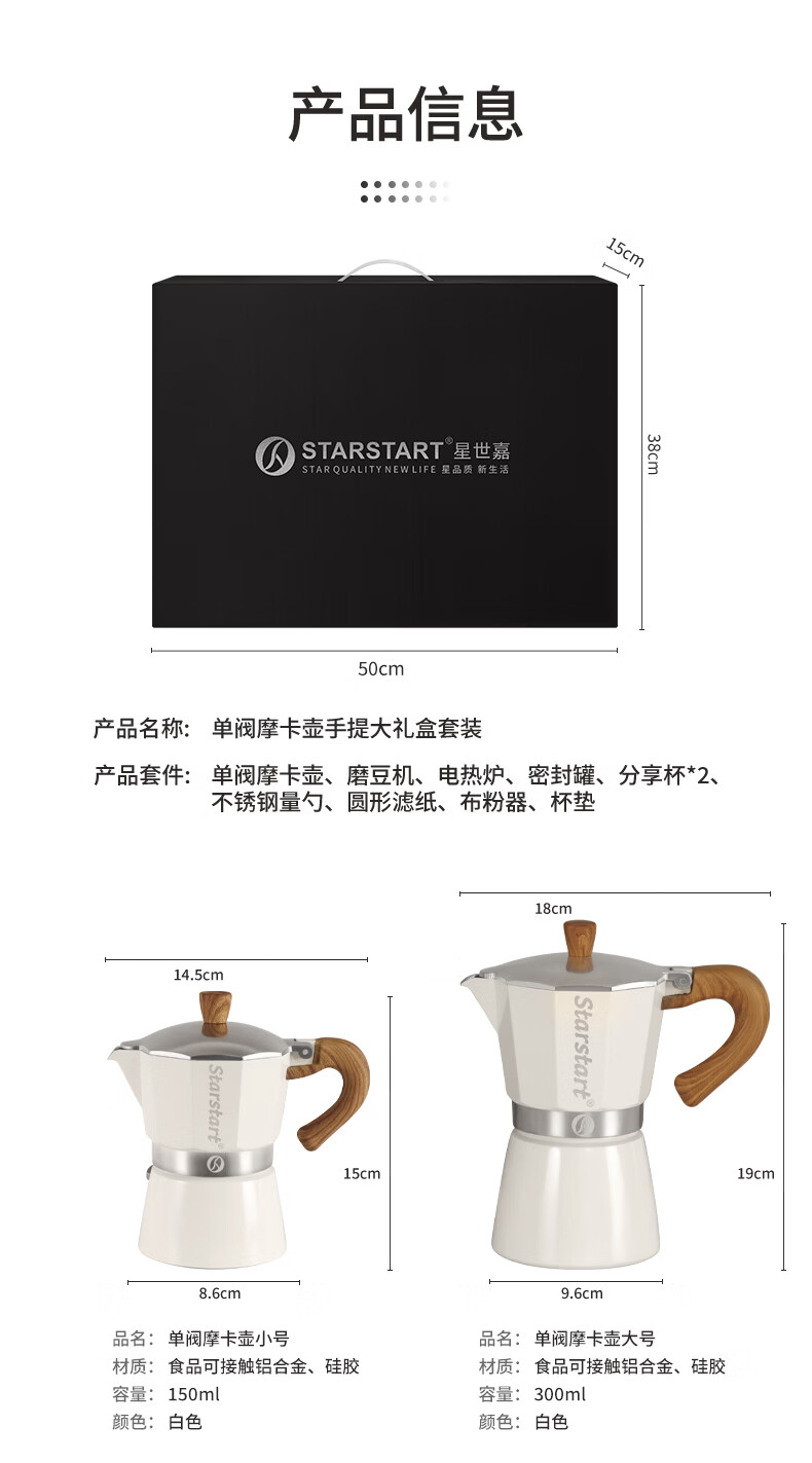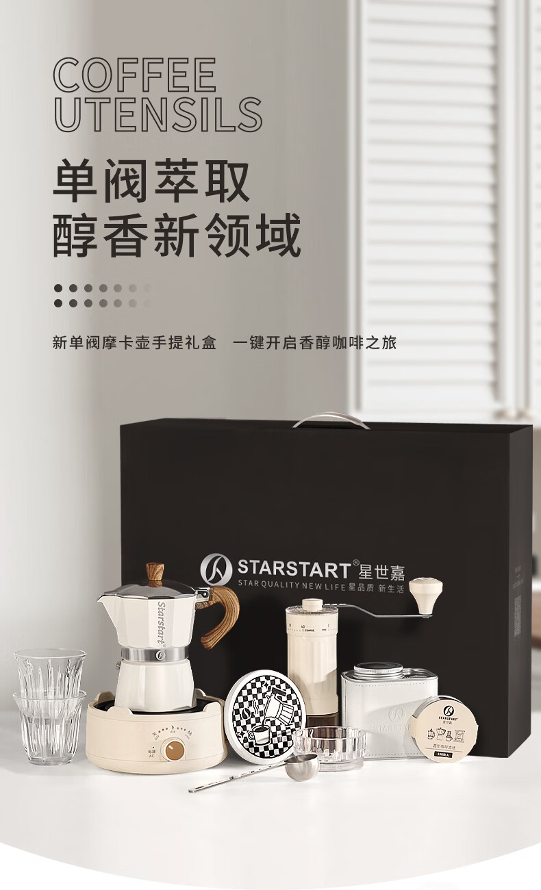 STAR-START咖啡磨豆机礼盒摩卡壶套装煮意式浓缩咖啡机生日礼品年会伴手礼 白色摩卡壶礼盒6人份单阀10件-手磨钢芯白