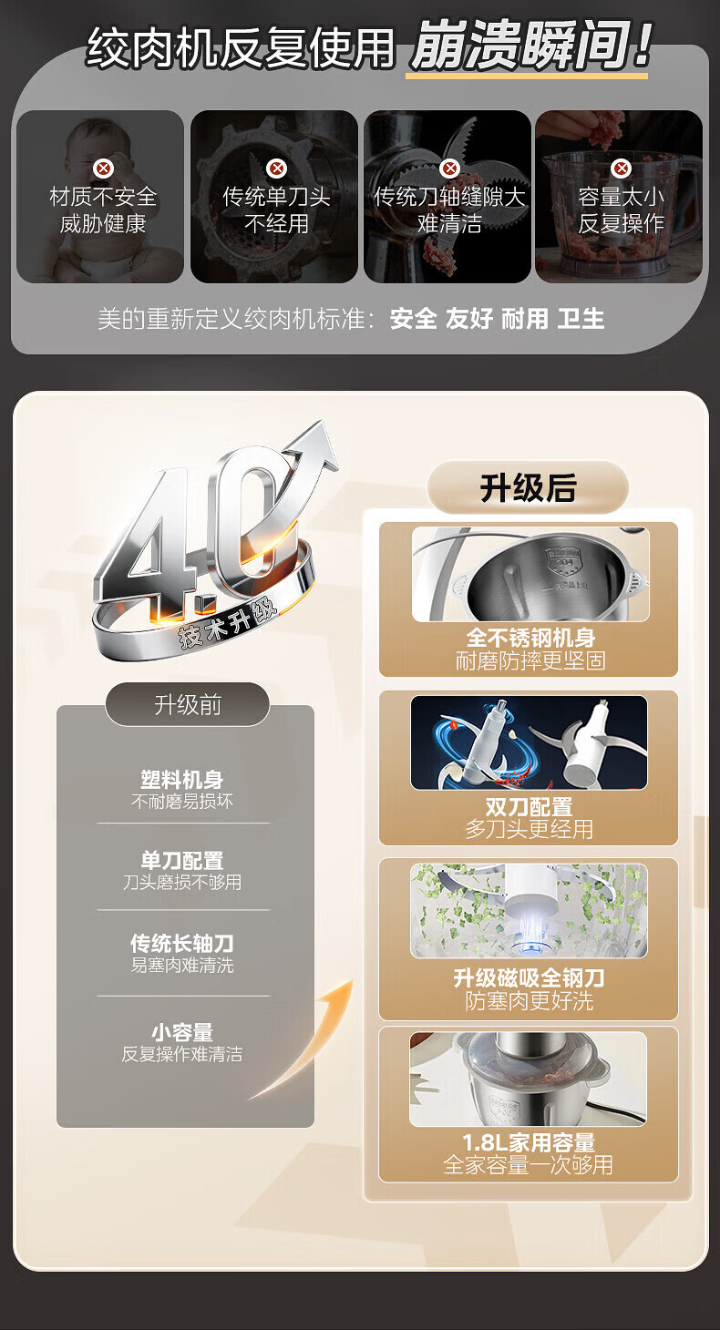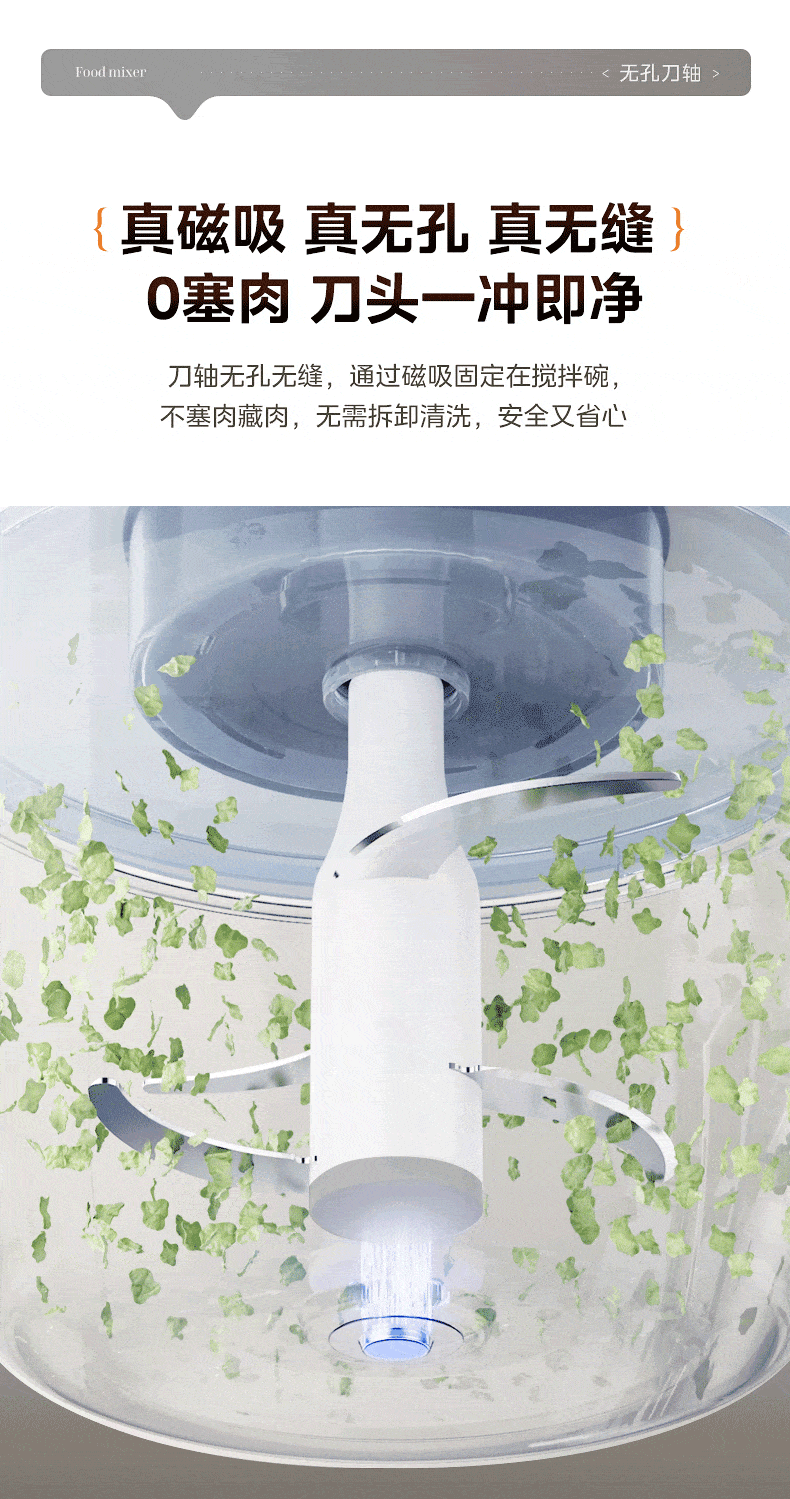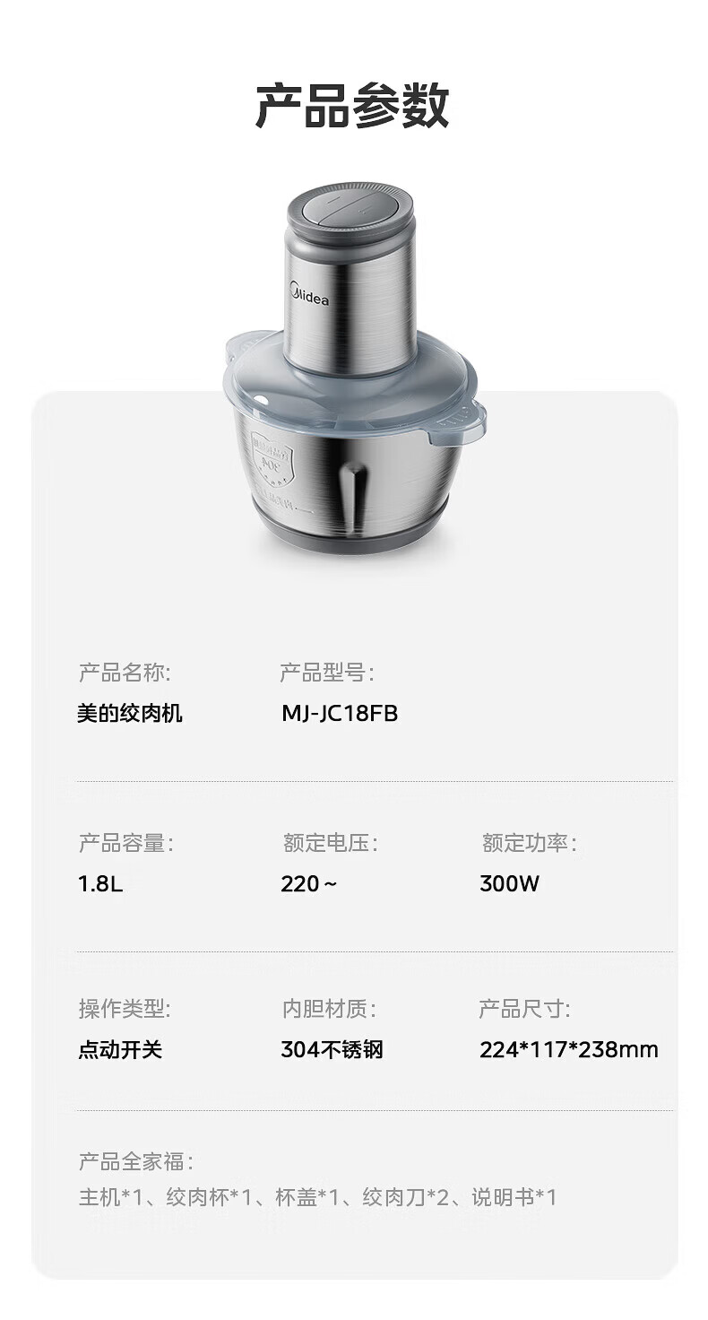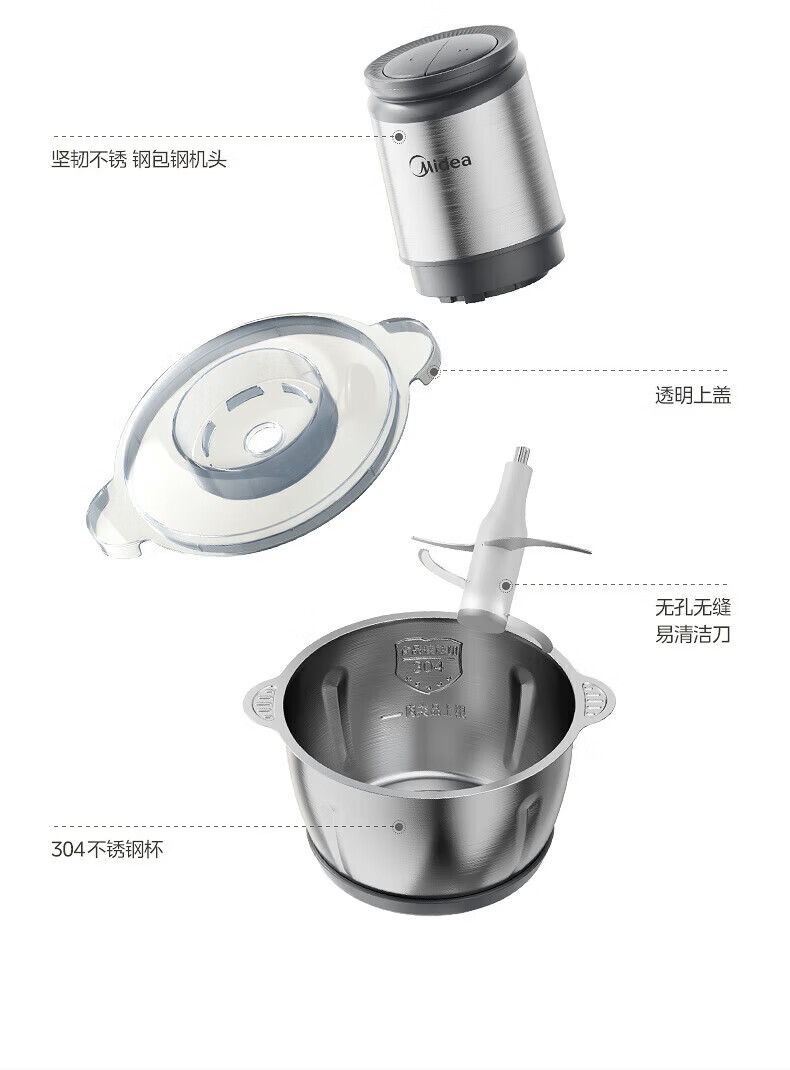 美的(Midea)绞肉机家用包钢机头不锈钢搅拌碗 绞肉馅多功能料理机绞馅机小型打蒜器 磁吸易洁刀头 【磁吸无孔精钢刀】 1.8L