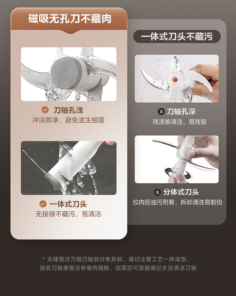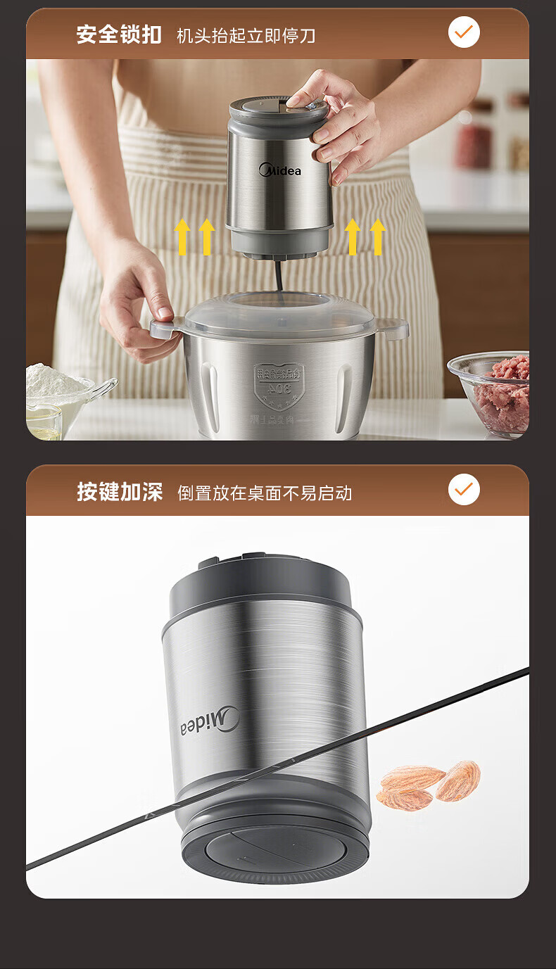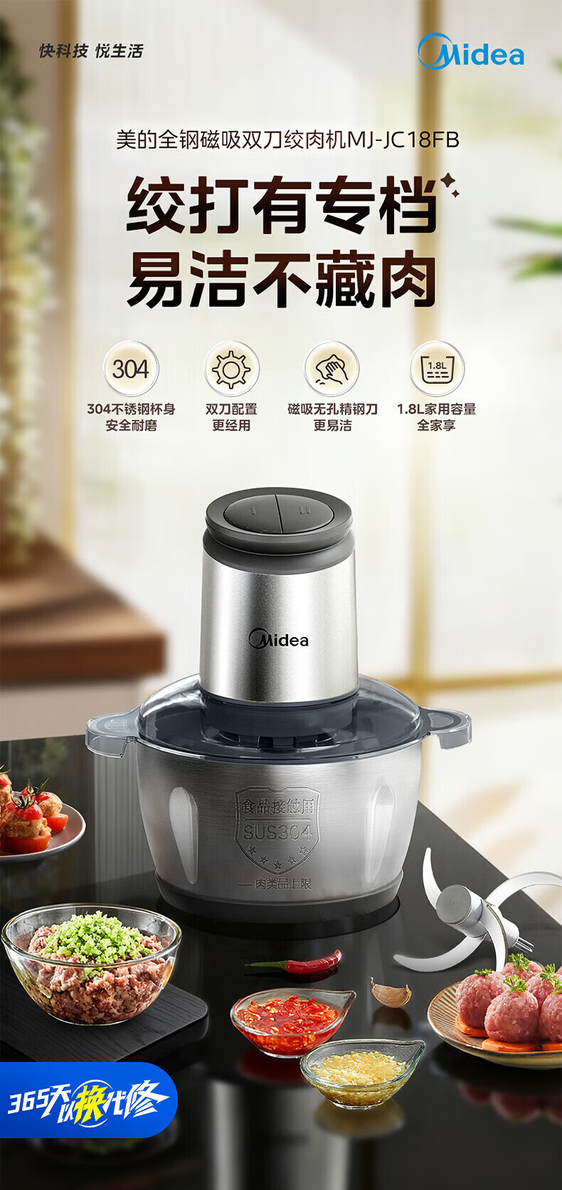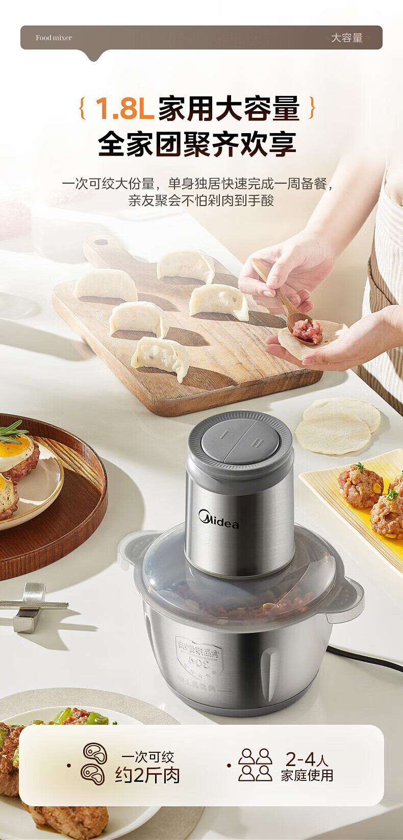 美的(Midea)绞肉机家用包钢机头不锈钢搅拌碗 绞肉馅多功能料理机绞馅机小型打蒜器 磁吸易洁刀头 【磁吸无孔精钢刀】 1.8L