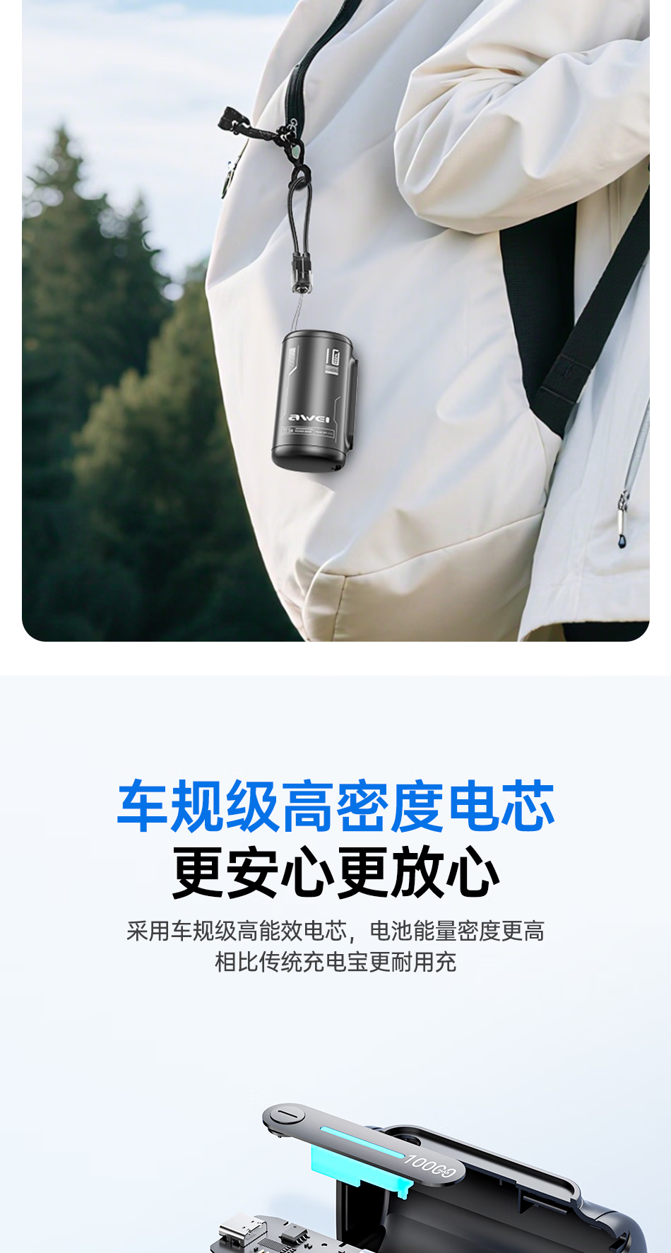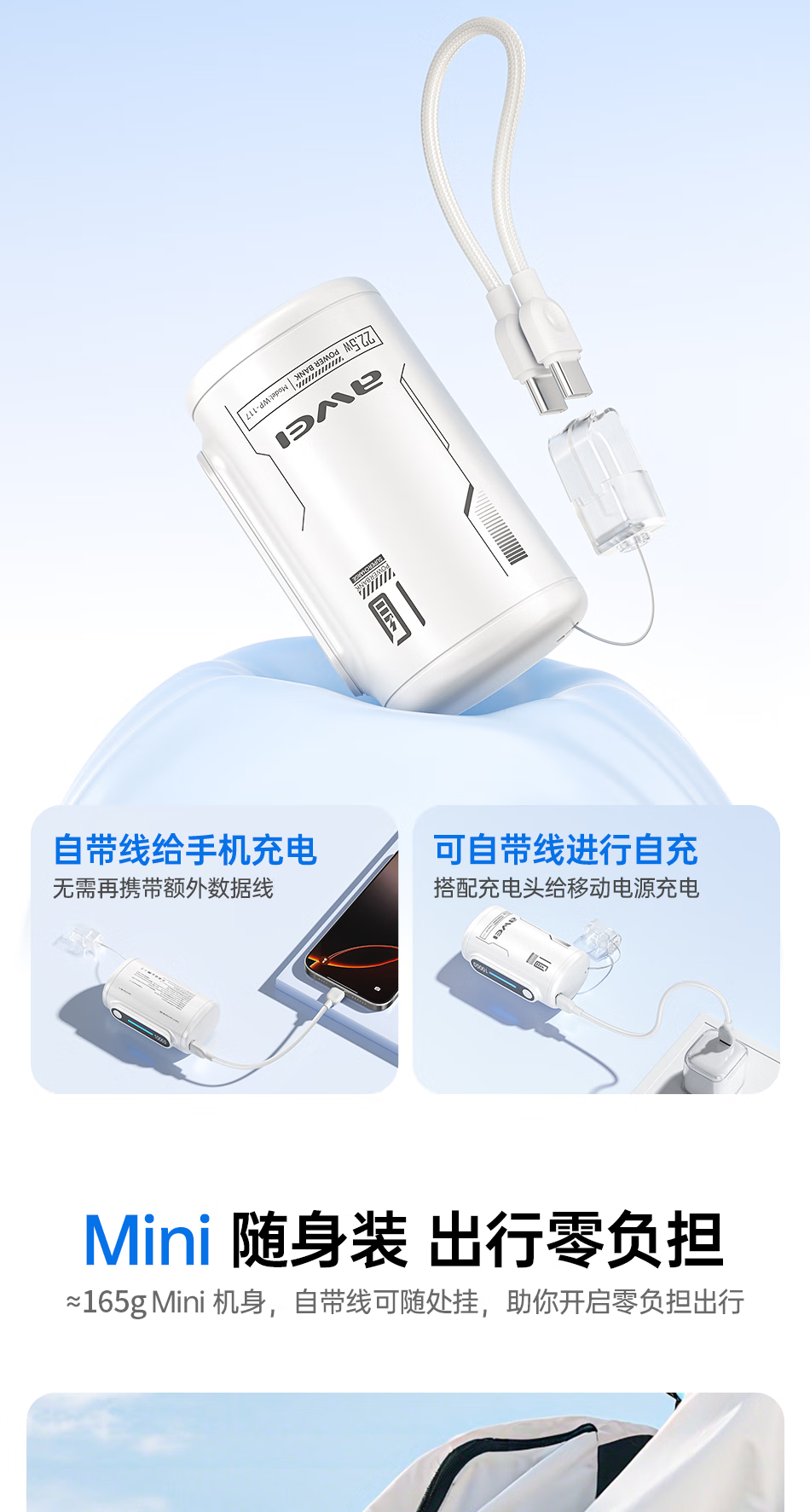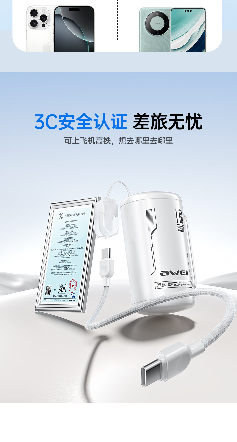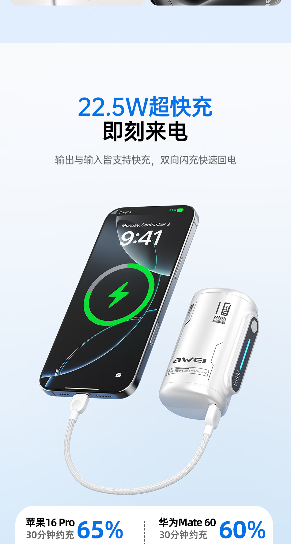 用维(AWEI)充电宝10000毫安大容量新款能量柱超薄迷你小巧快充移动电源适用苹果【国家3C认证可上飞机】 粉色【双向22.5W能量柱】送C-C挂绳线 10000mAh