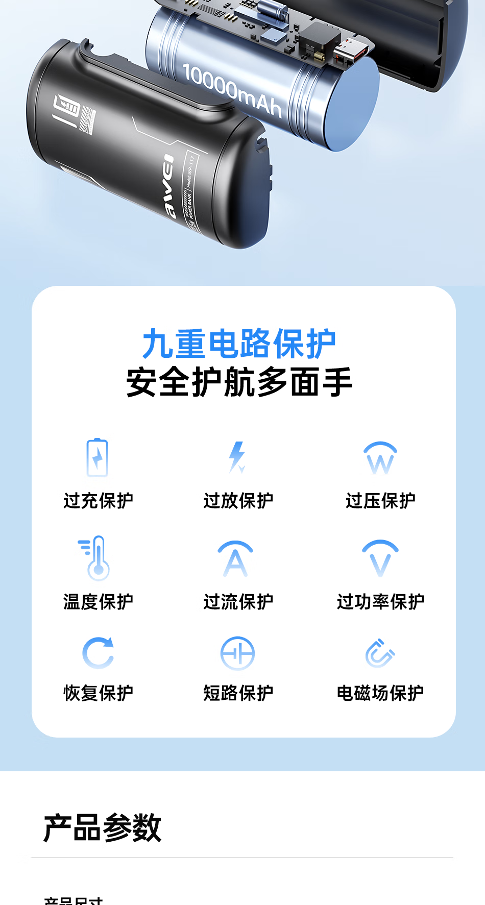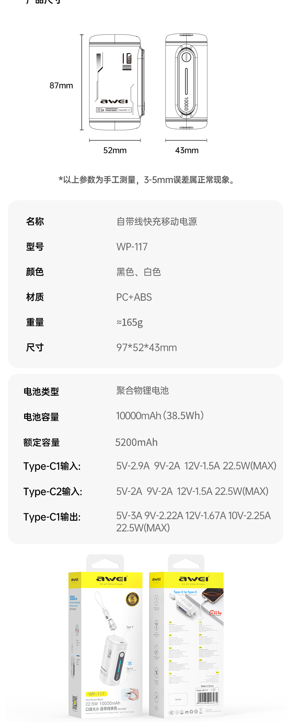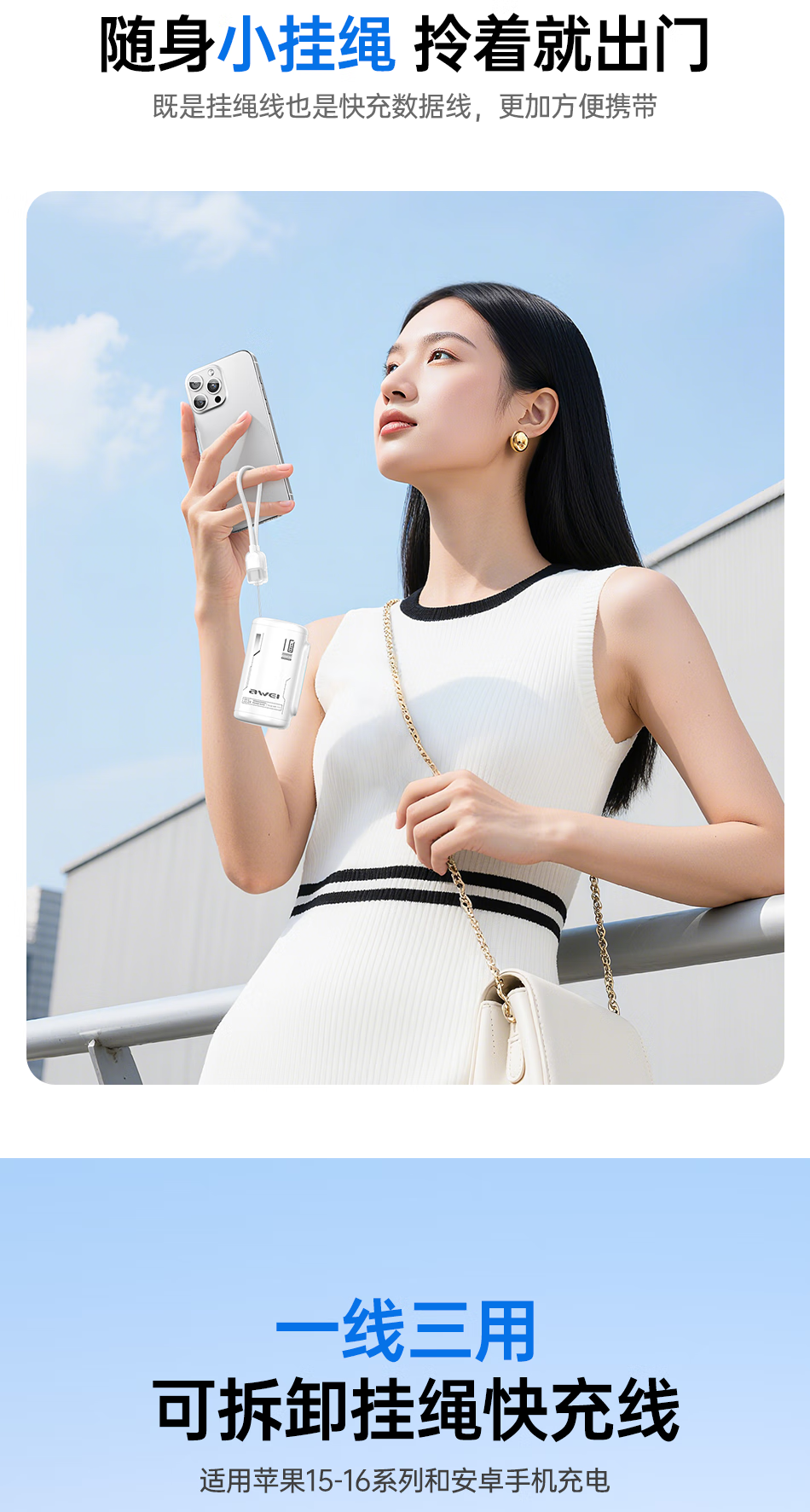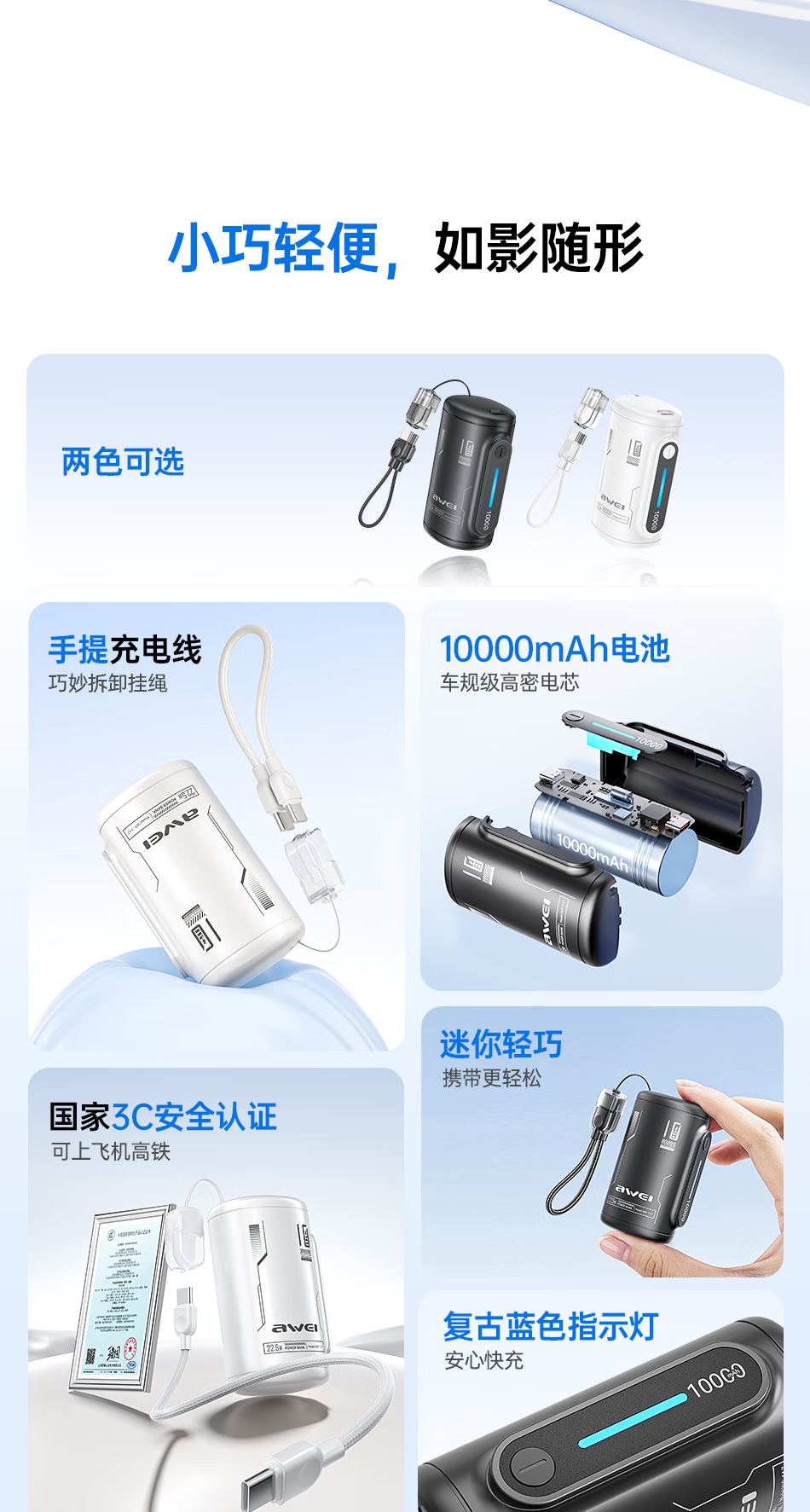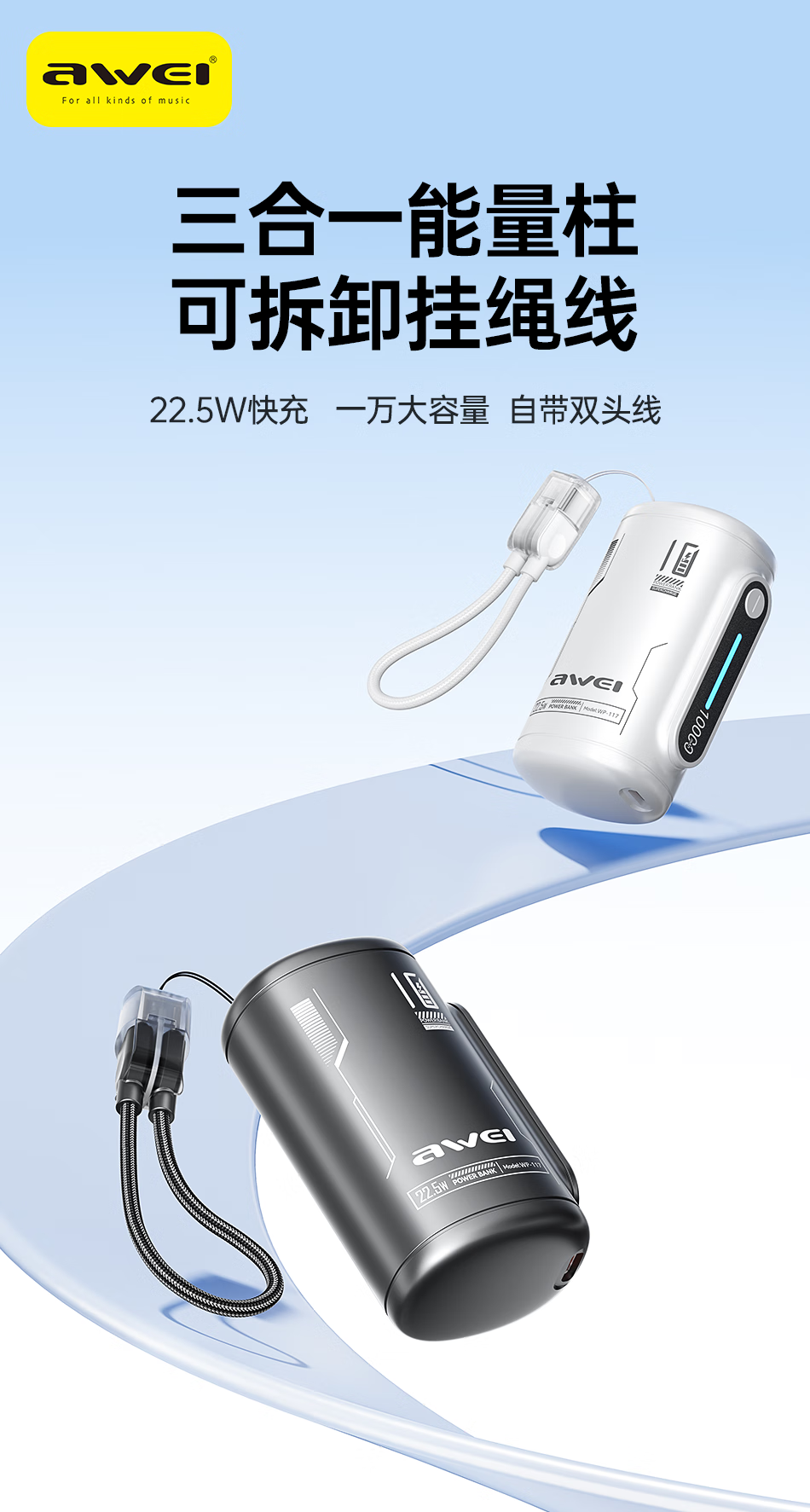 用维(AWEI)充电宝10000毫安大容量新款能量柱超薄迷你小巧快充移动电源适用苹果【国家3C认证可上飞机】 粉色【双向22.5W能量柱】送C-C挂绳线 10000mAh