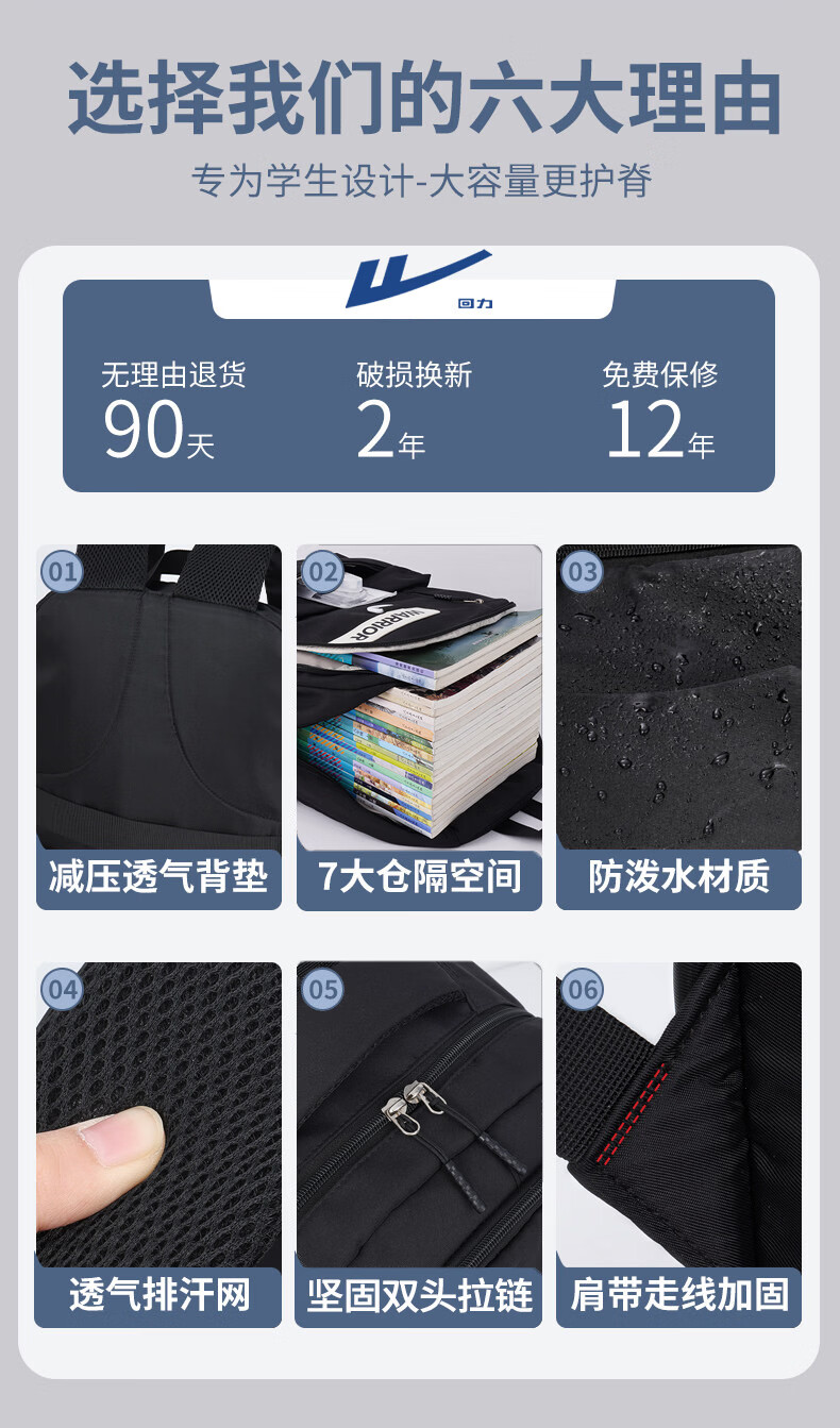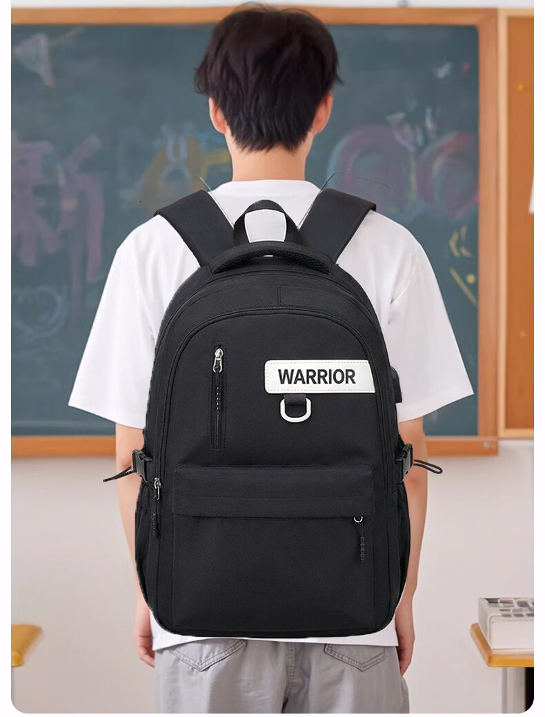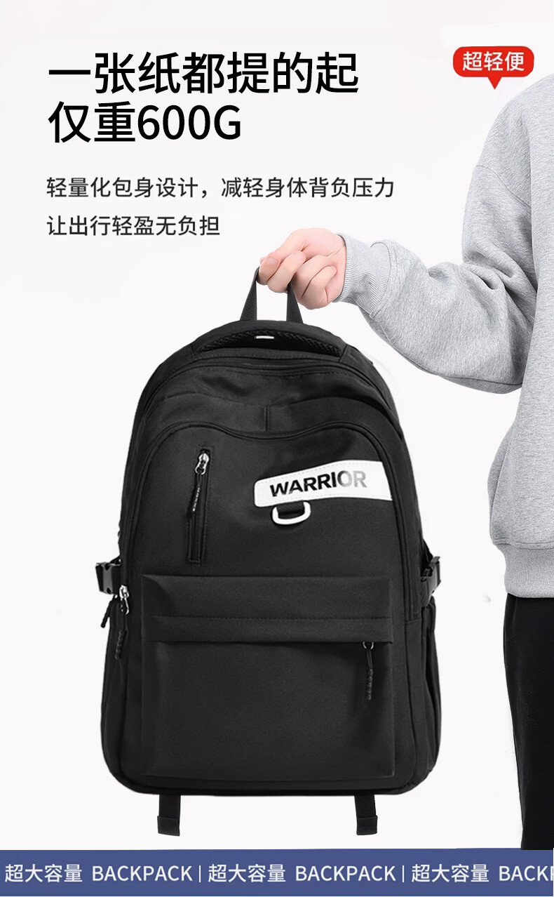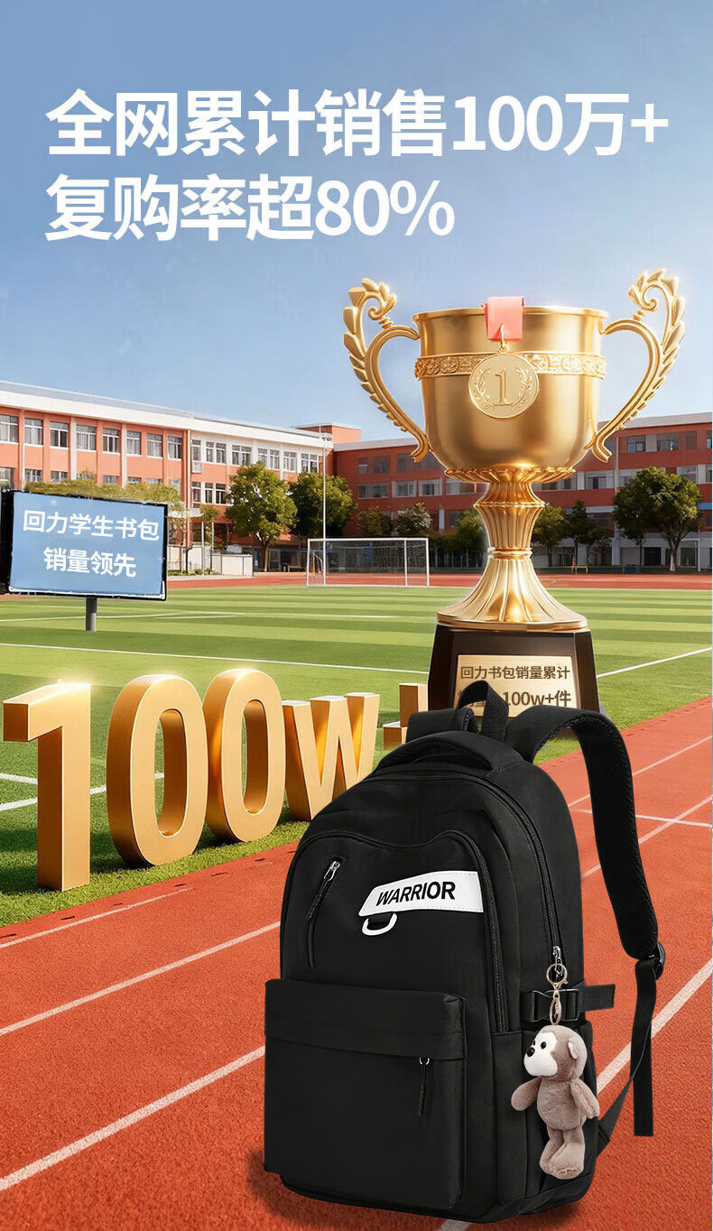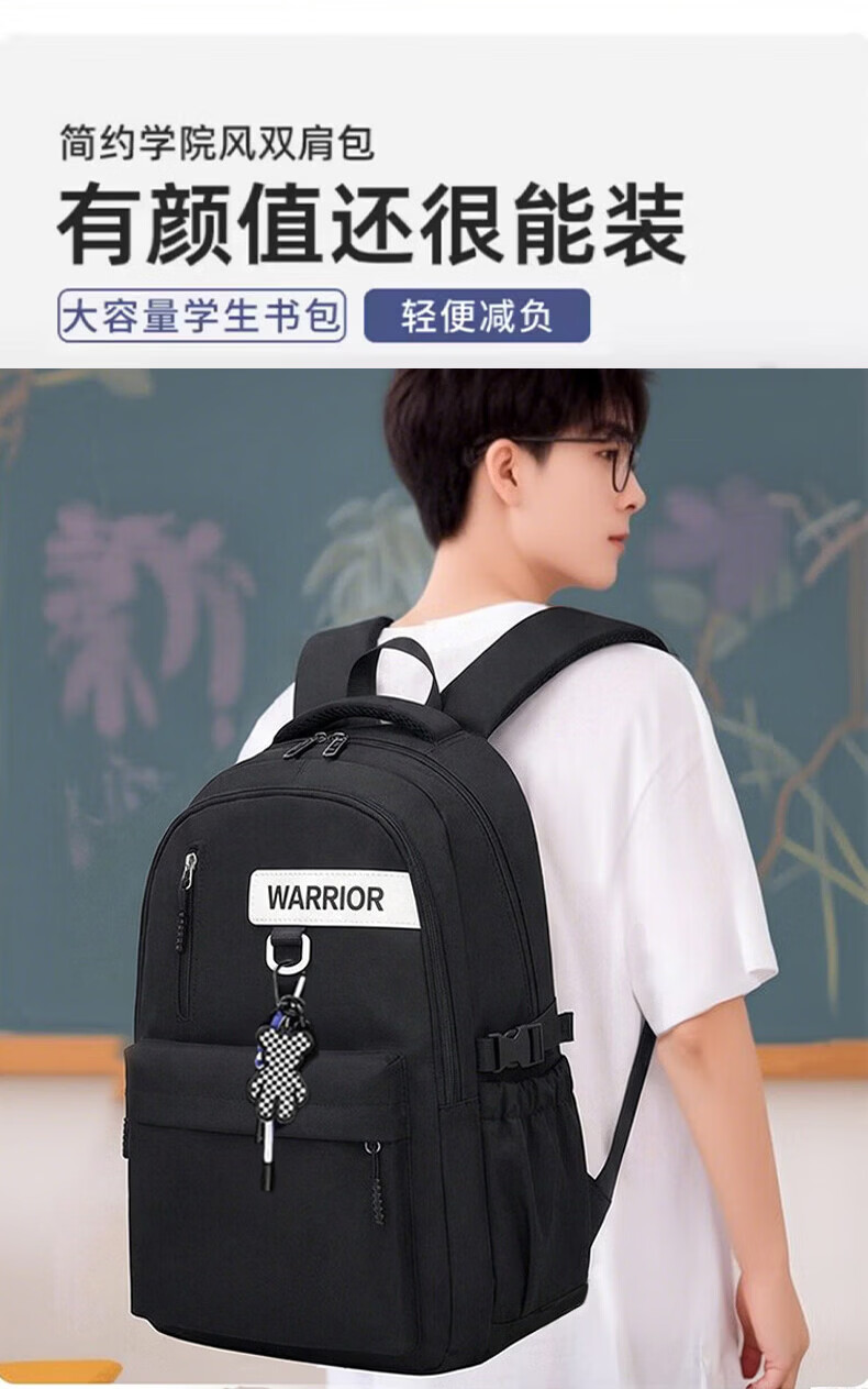 回力双肩包男士2026新款百搭大容量大学生背包女生简约初中生高中书包 黑色【带棋盘熊挂件】