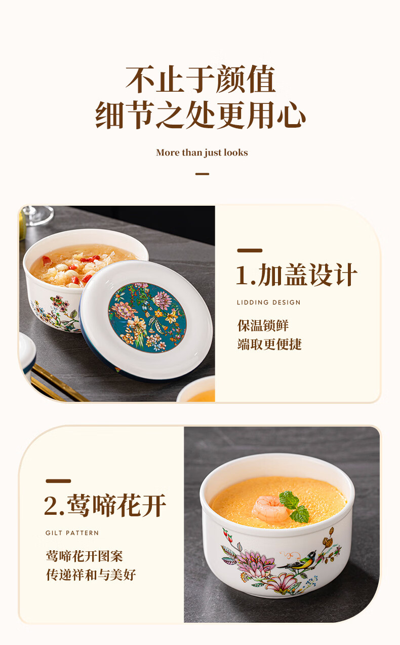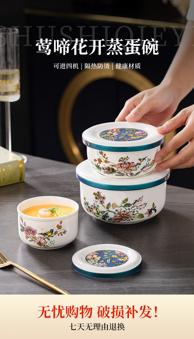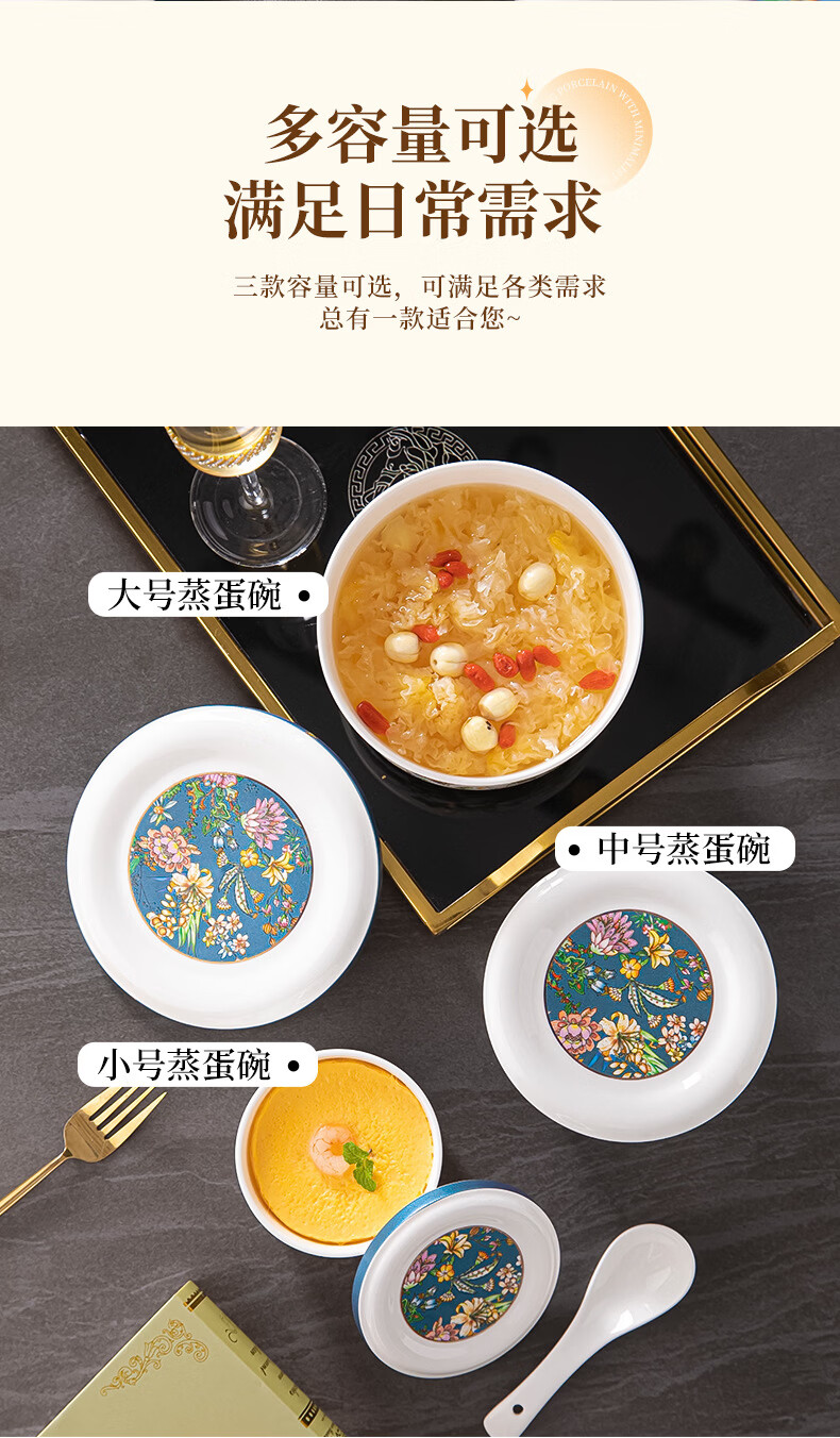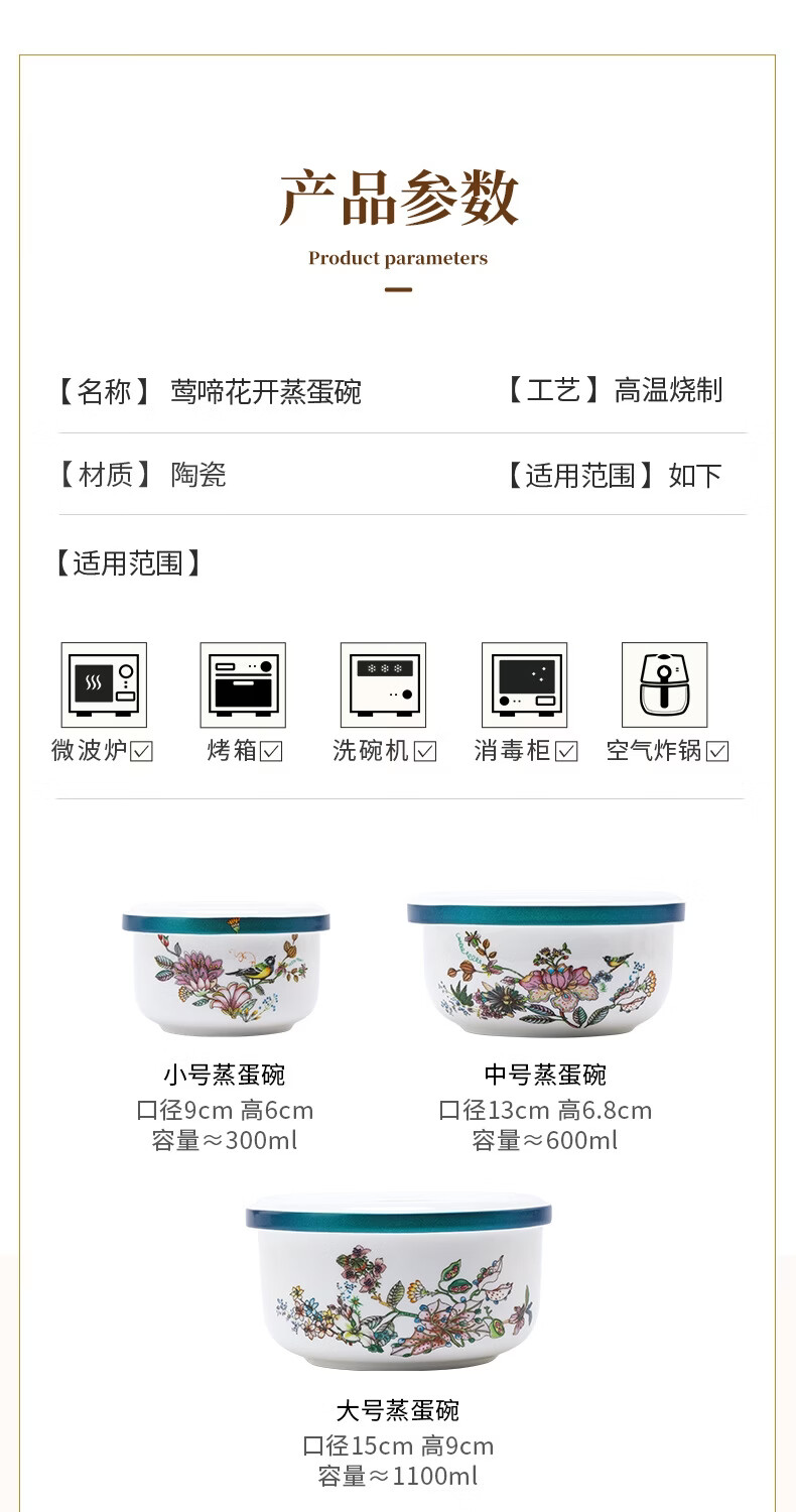 山头林村蒸鸡蛋羹专用碗带盖陶瓷家用 耐高温隔水炖盅可微波炉蒸碗汤碗 莺啼花开蒸蛋碗大号