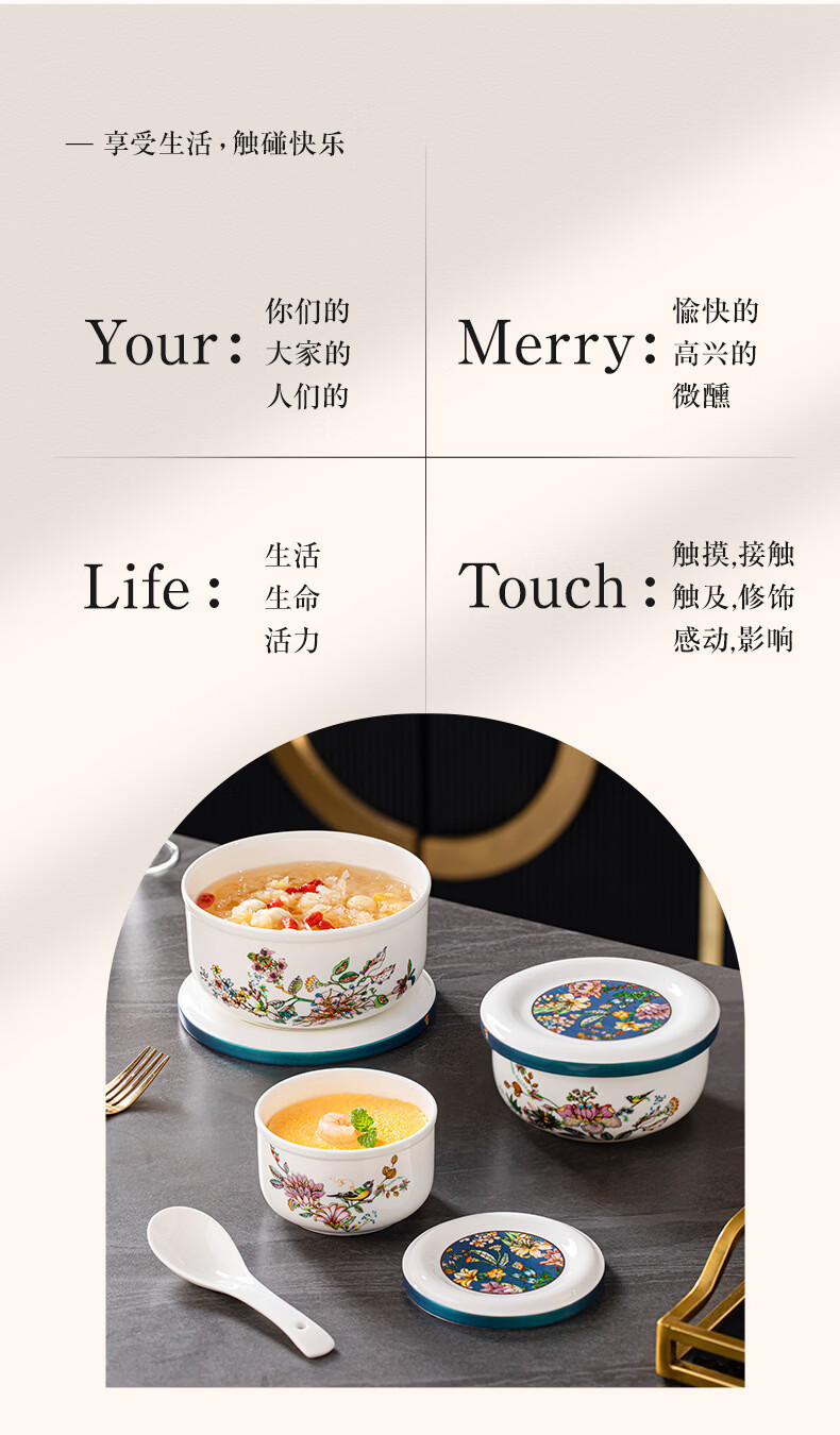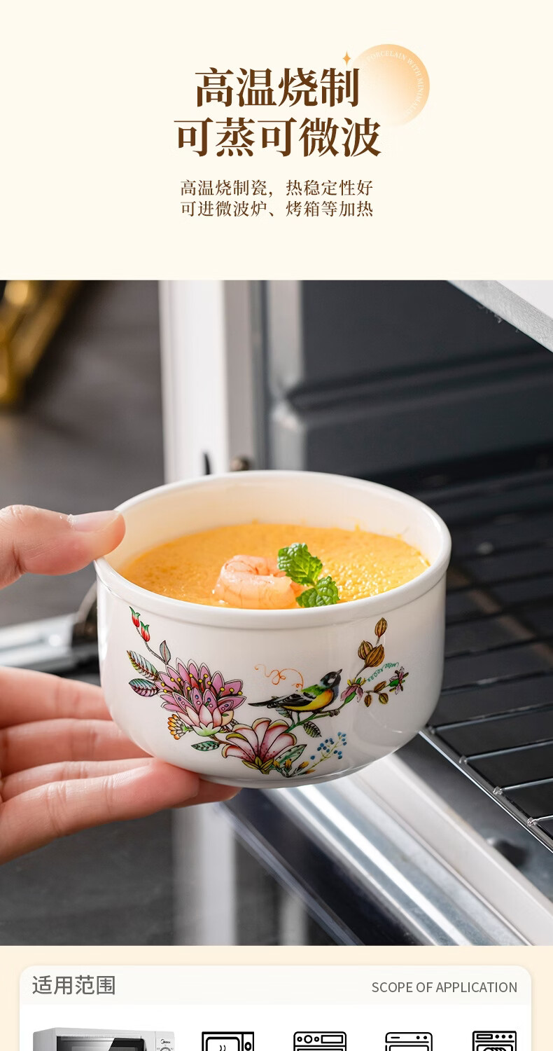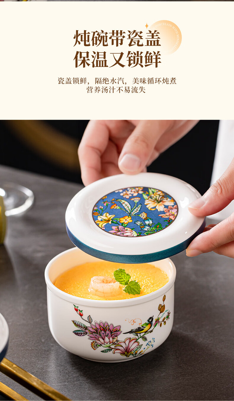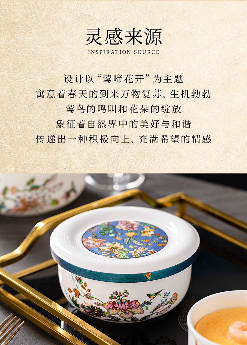 山头林村蒸鸡蛋羹专用碗带盖陶瓷家用 耐高温隔水炖盅可微波炉蒸碗汤碗 莺啼花开蒸蛋碗大号