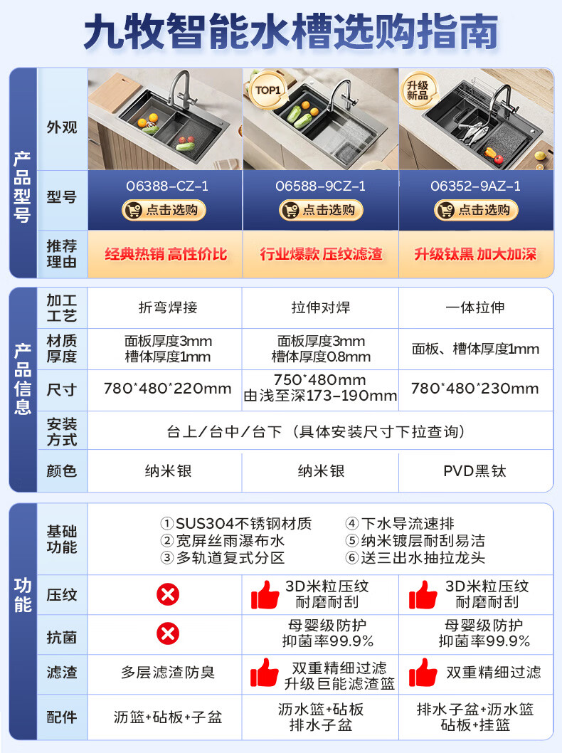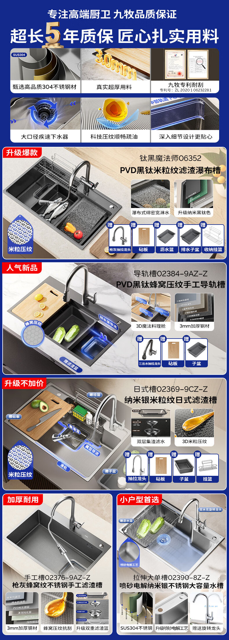九牧(JOMOO)不锈钢魔法师厨房水槽大单槽洗菜盆飞雨瀑布槽78*48抽拉龙头06388