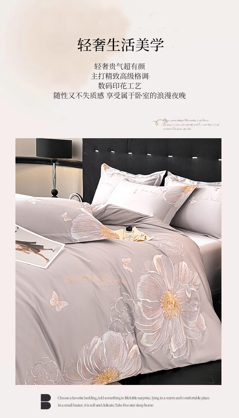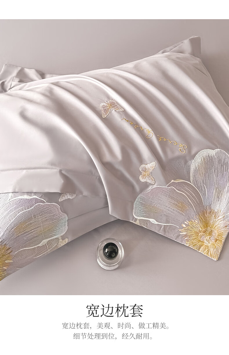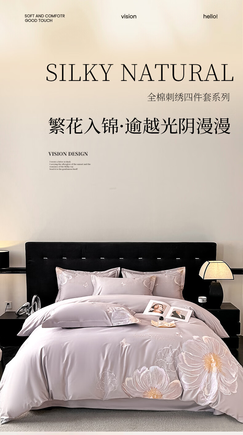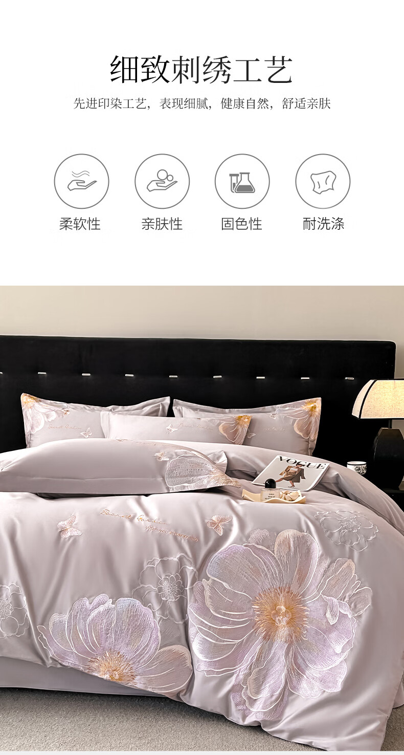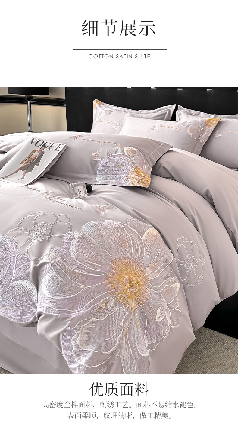 恒源祥床上四件套 里外全棉40支高密四件套亲肤舒适轻奢刺绣双人套件 奥莉妃-浅云蓝【全棉刺绣】 1.5米床 床单款 (被套200*230cm)