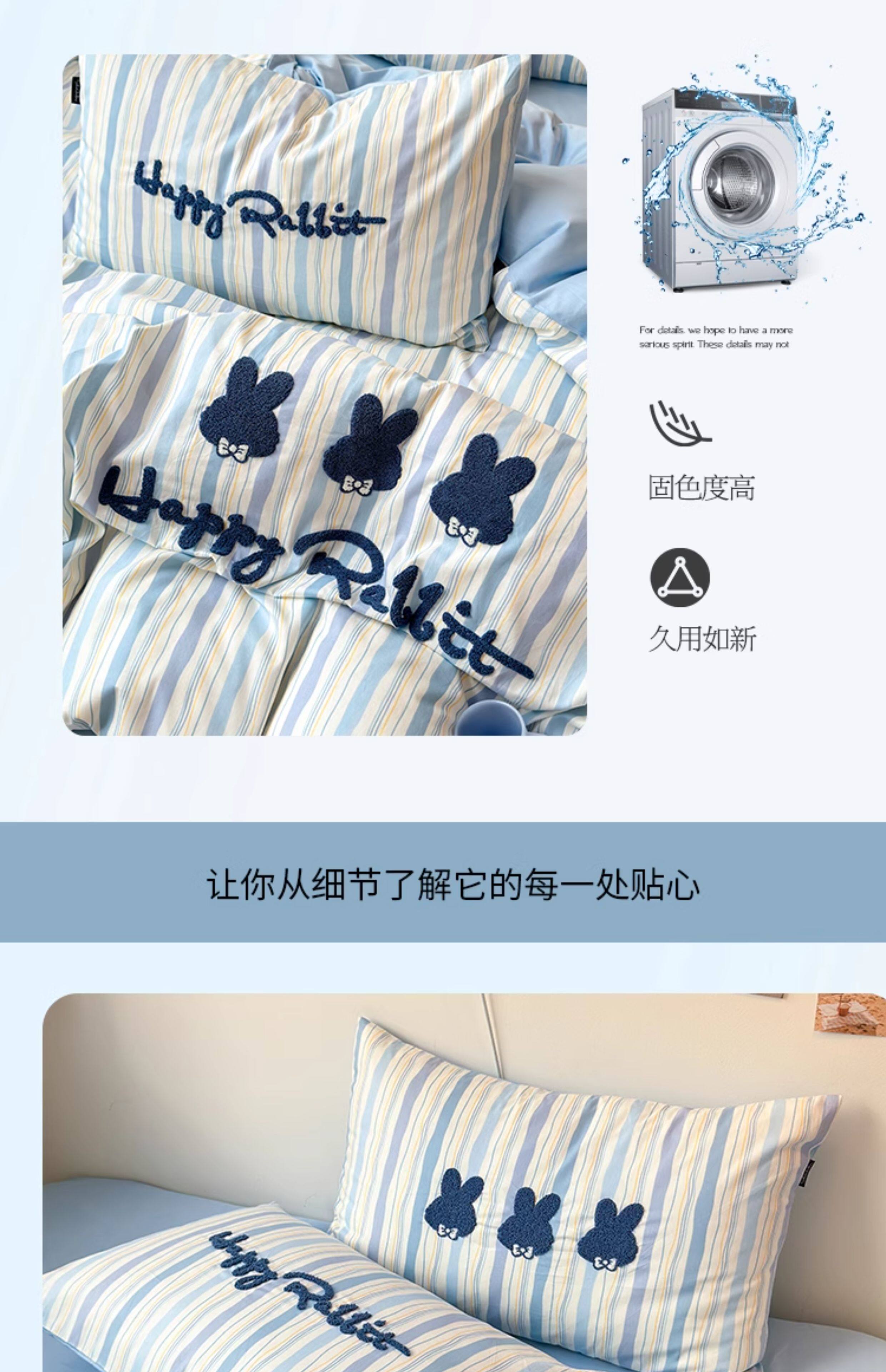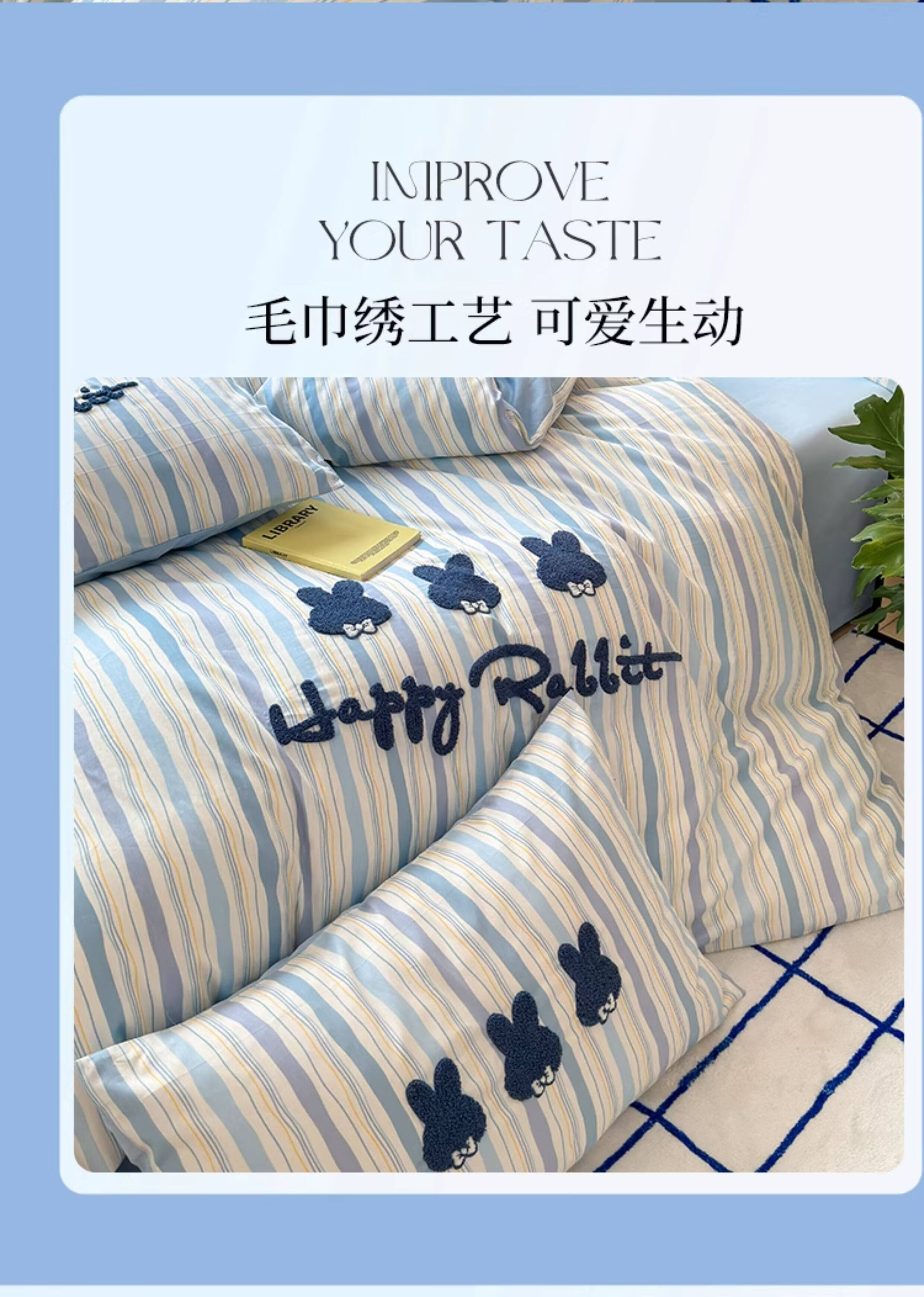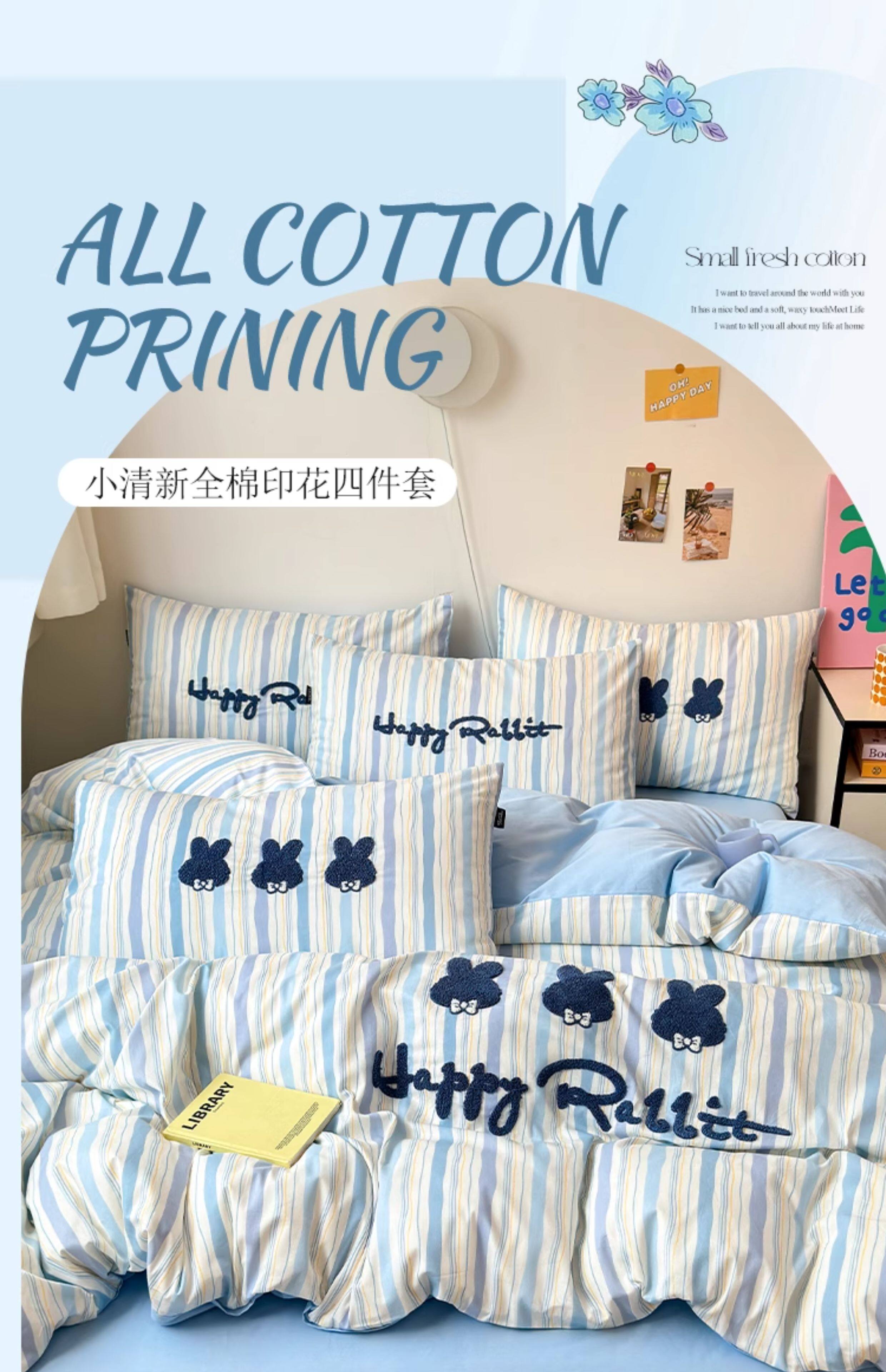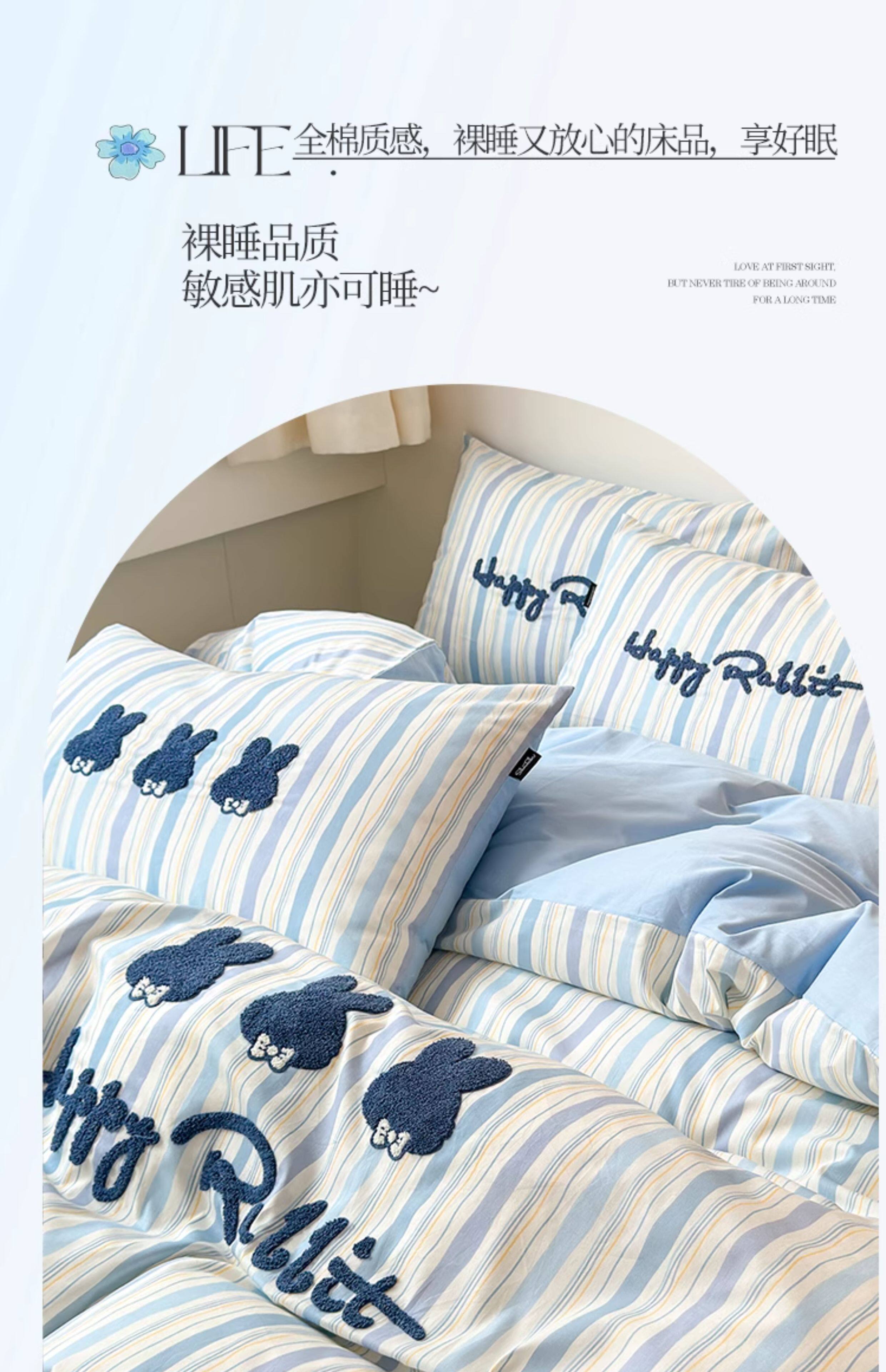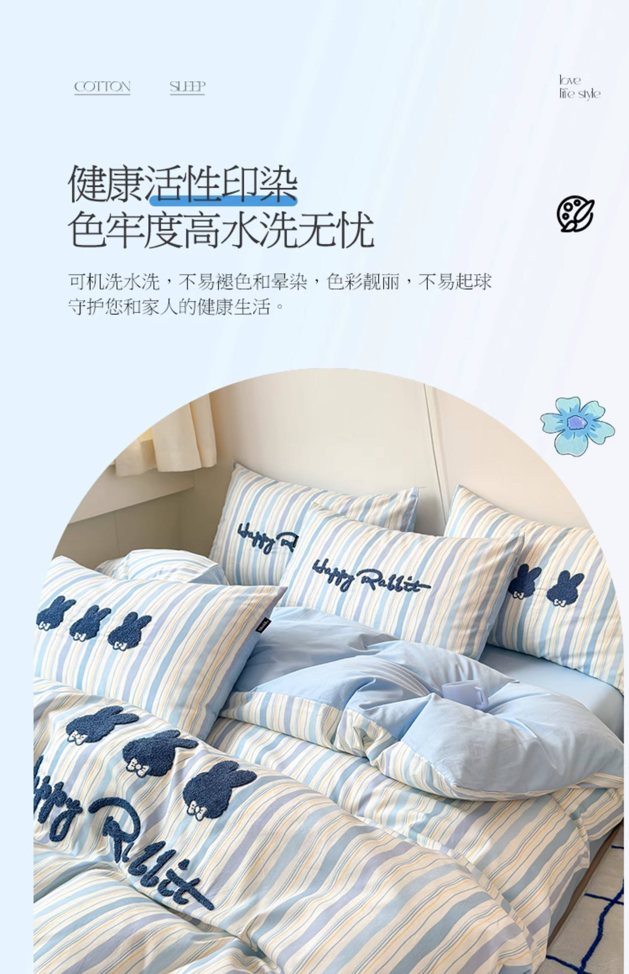 名创优品(MINISO)全棉毛巾绣床上四件套 纯棉被套床单宿舍单双人床品三件套 彩虹兔-蓝 2.0 床单款 四件套(被套220*240cm)