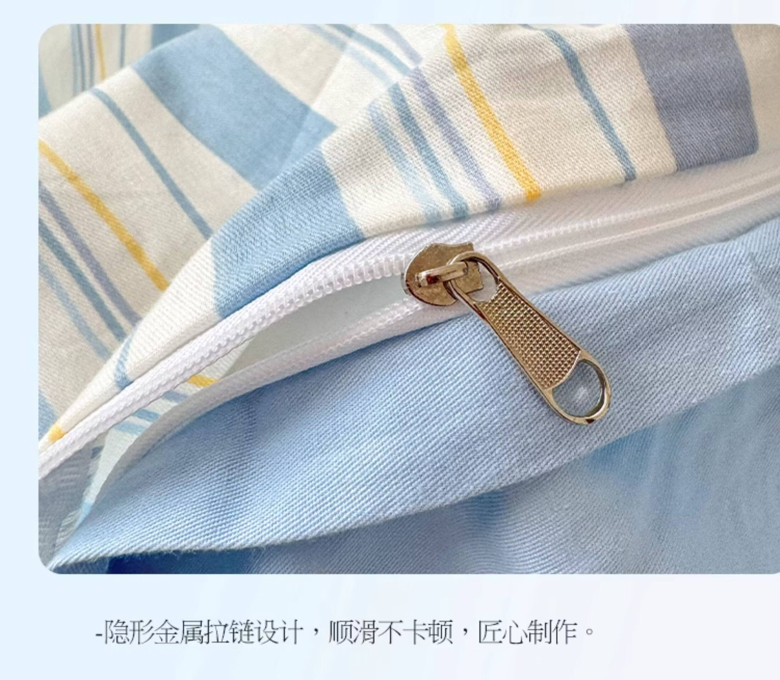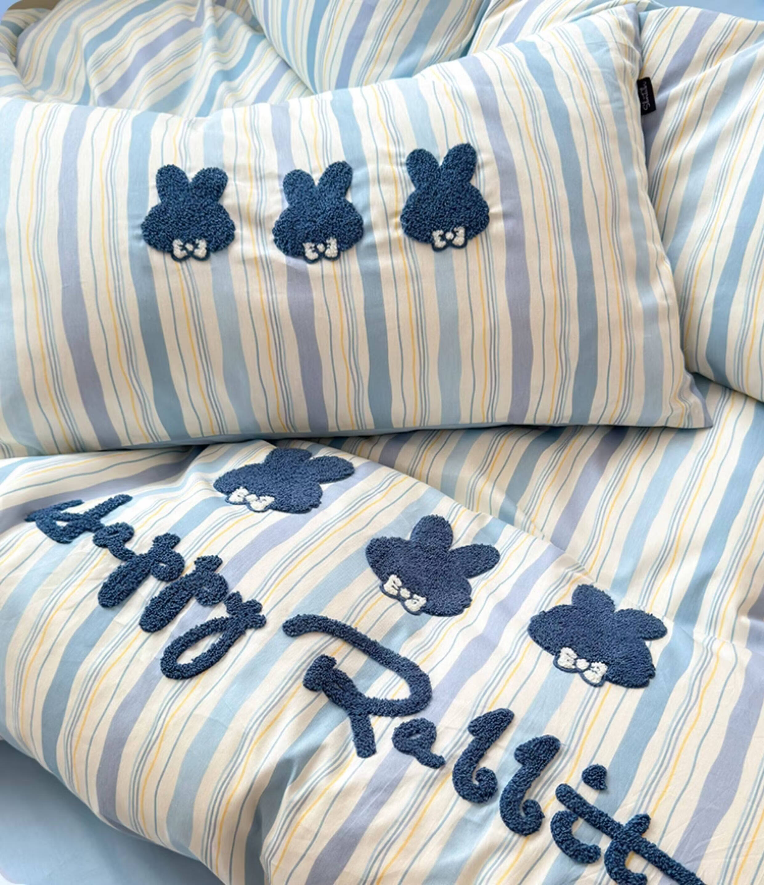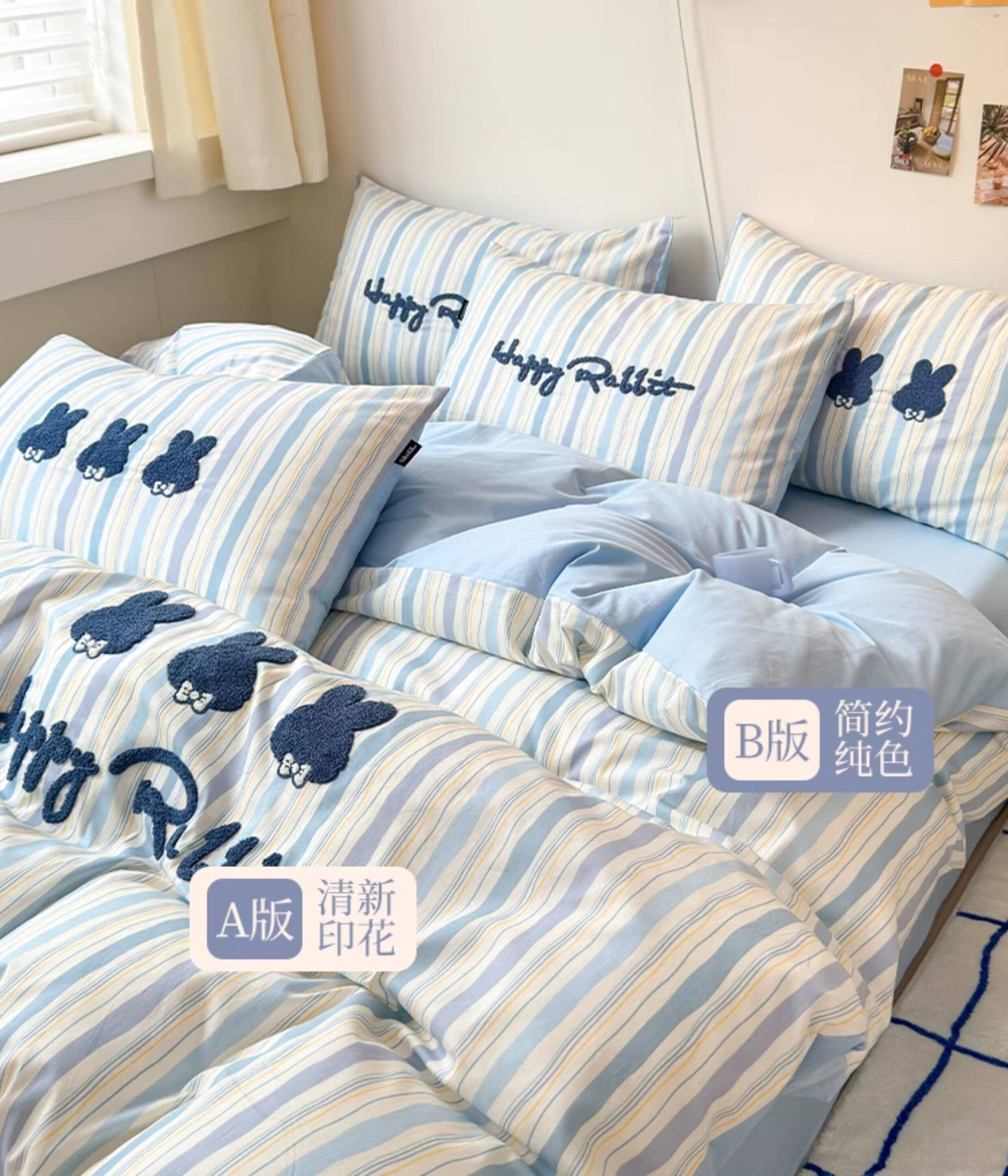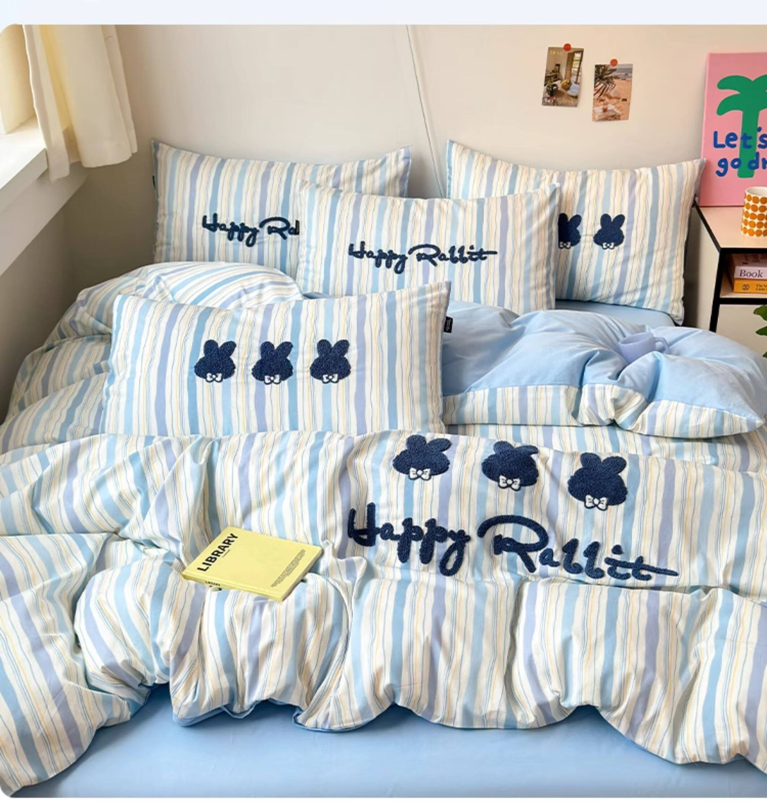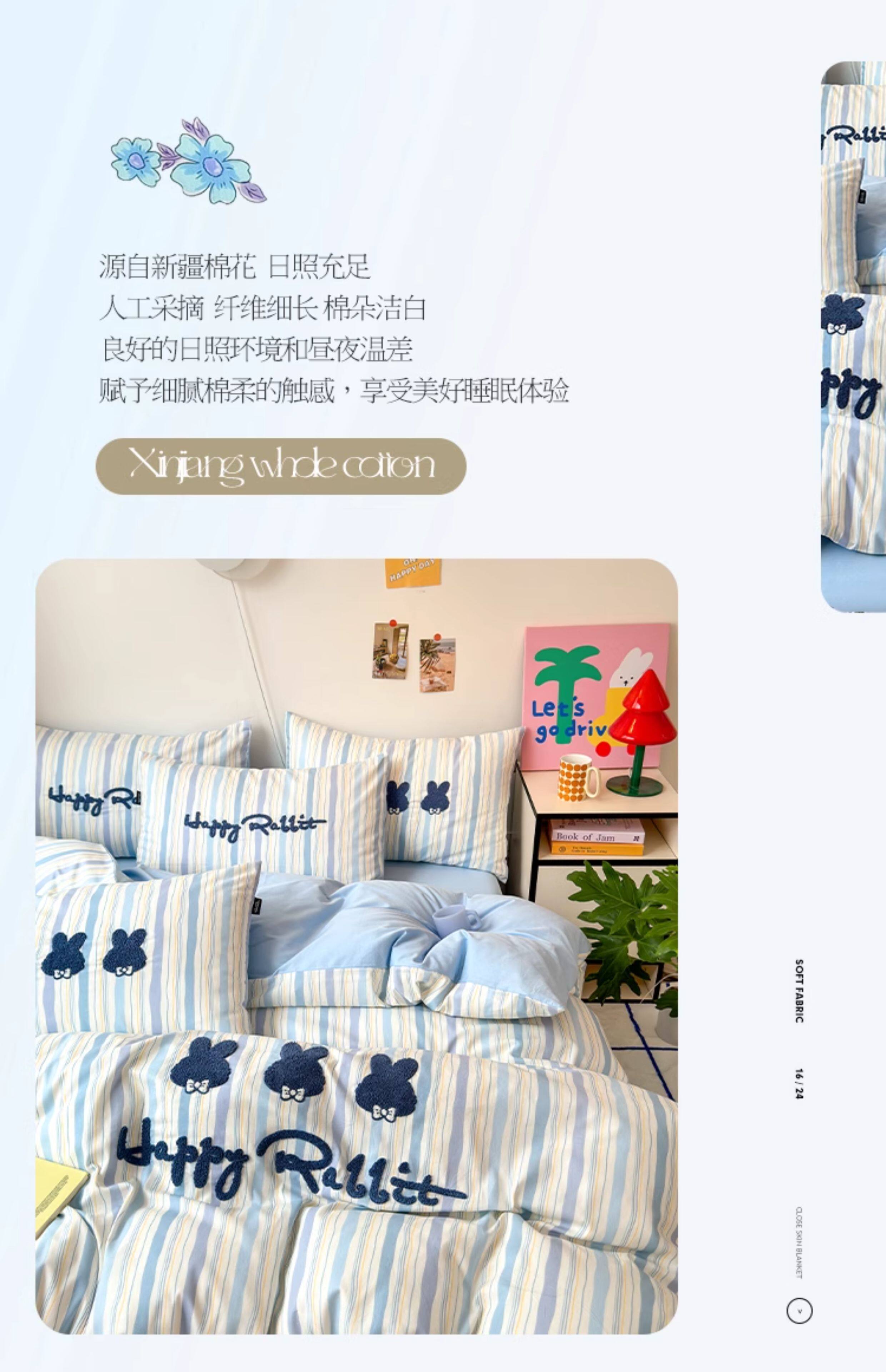 名创优品(MINISO)全棉毛巾绣床上四件套 纯棉被套床单宿舍单双人床品三件套 彩虹兔-蓝 2.0 床单款 四件套(被套220*240cm)