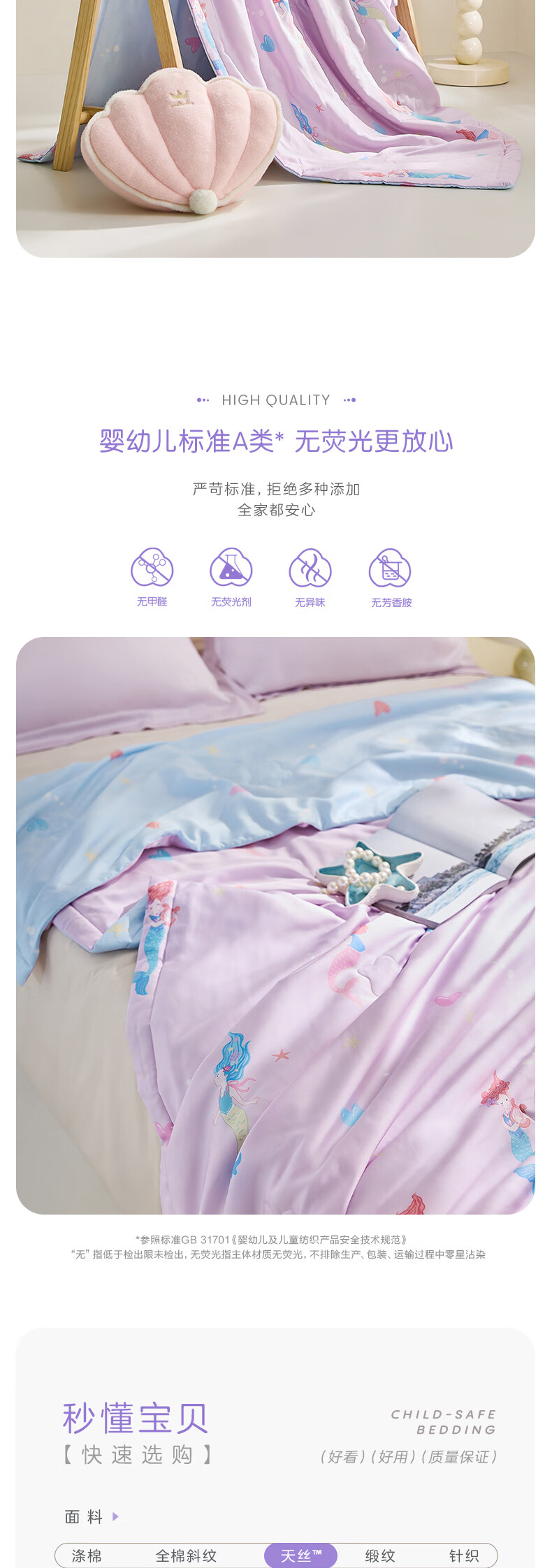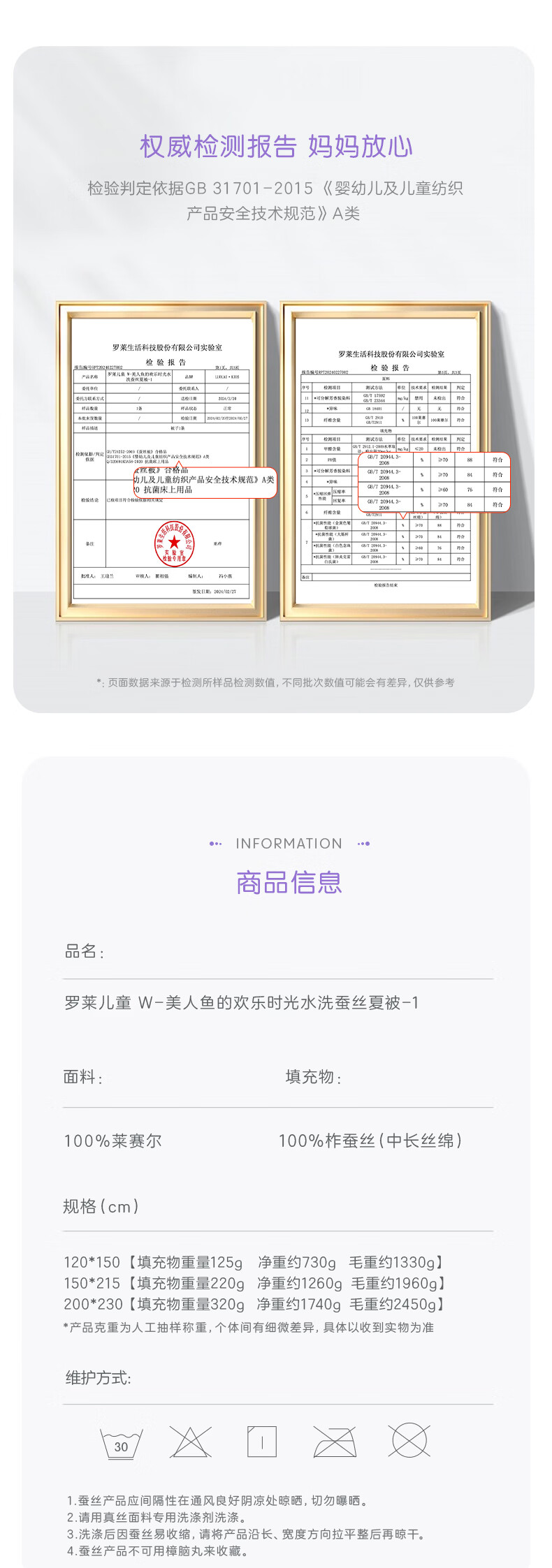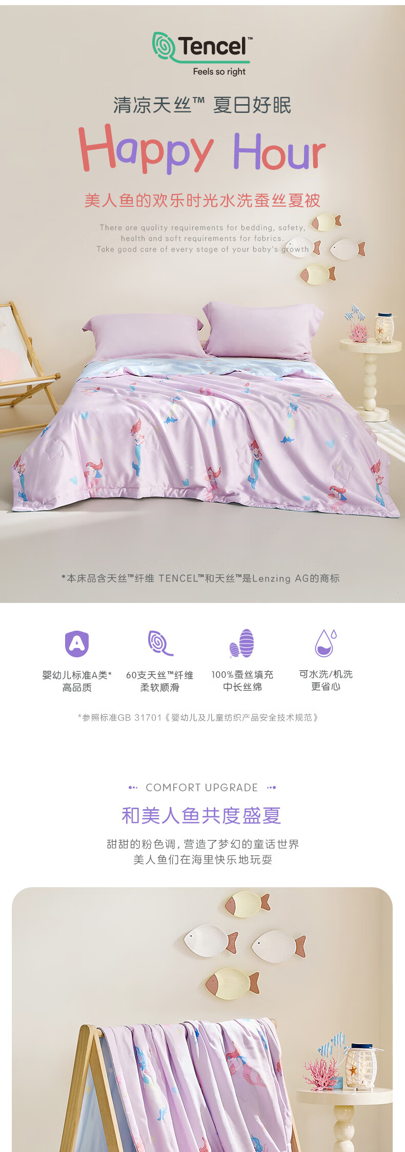 罗莱儿童 母婴A类100%蚕丝可水洗夏被60支兰精天丝面料 美人鱼的欢乐时光 120cm*150cm