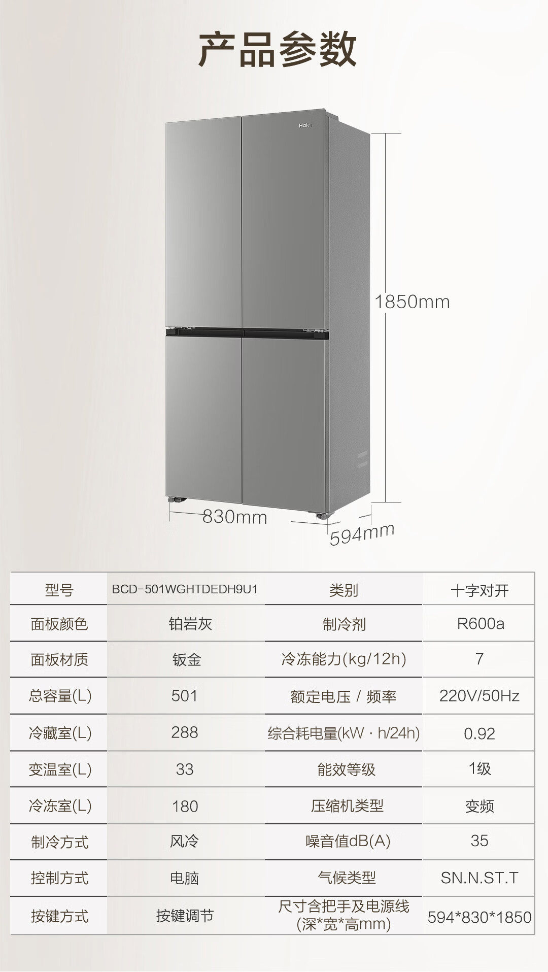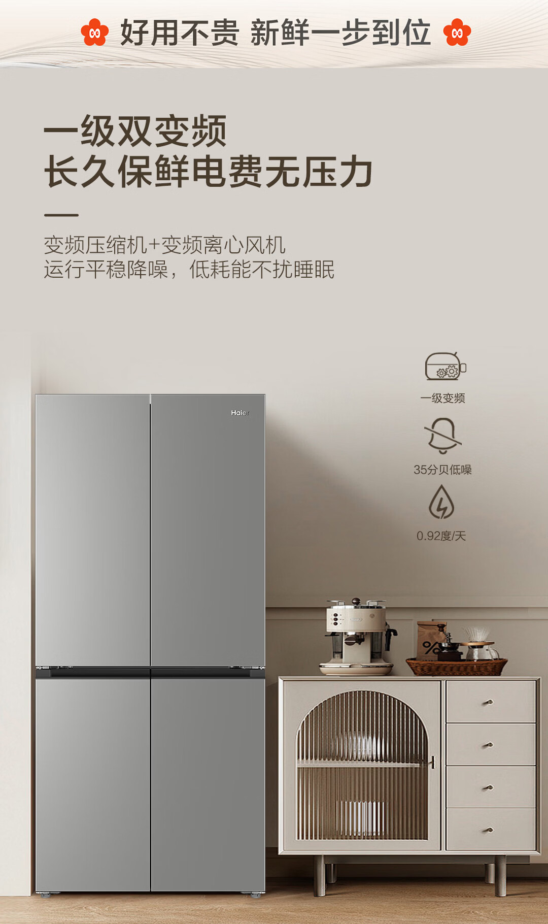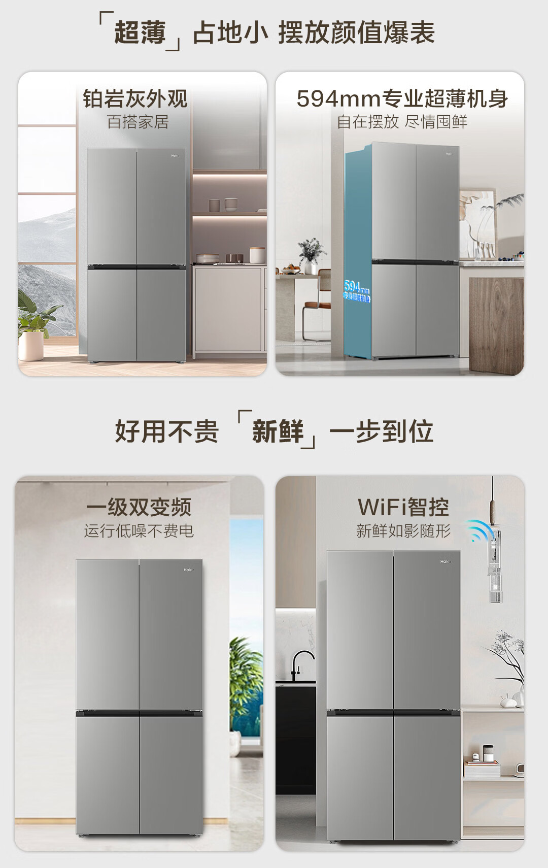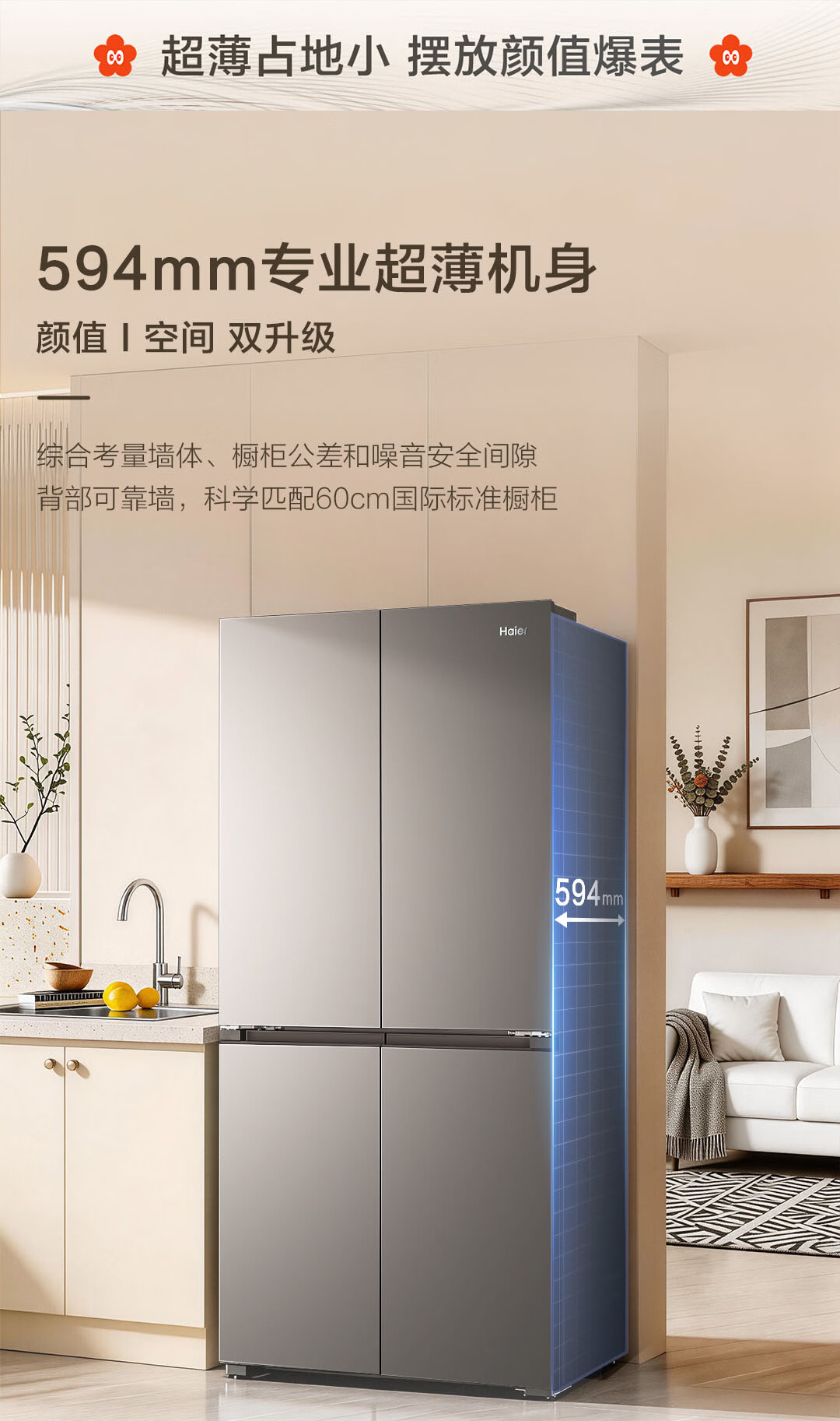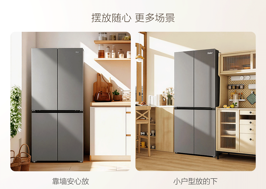 海尔(Haier)「小红花系列」501L十字门冰箱超薄冷藏冷冻双净化一级变频风冷无霜BCD-501WGHTDEDH9U1国家补贴