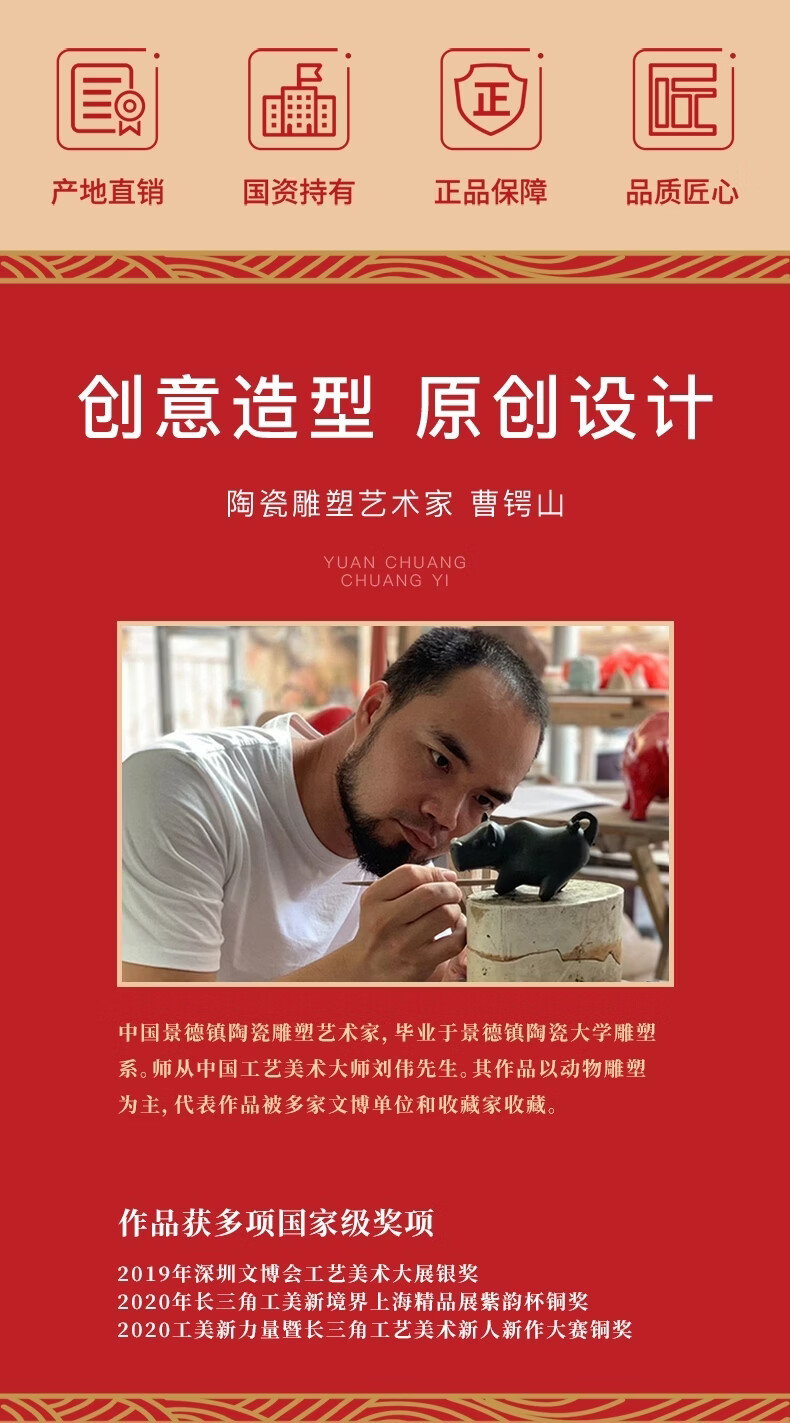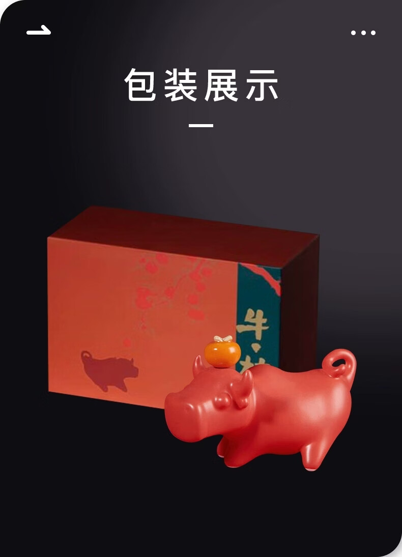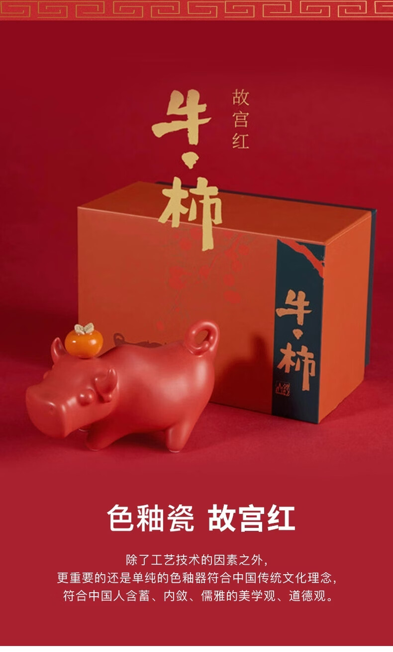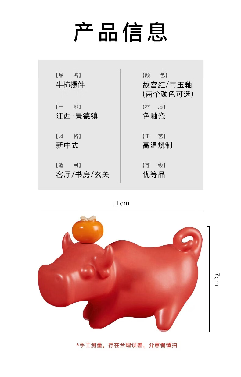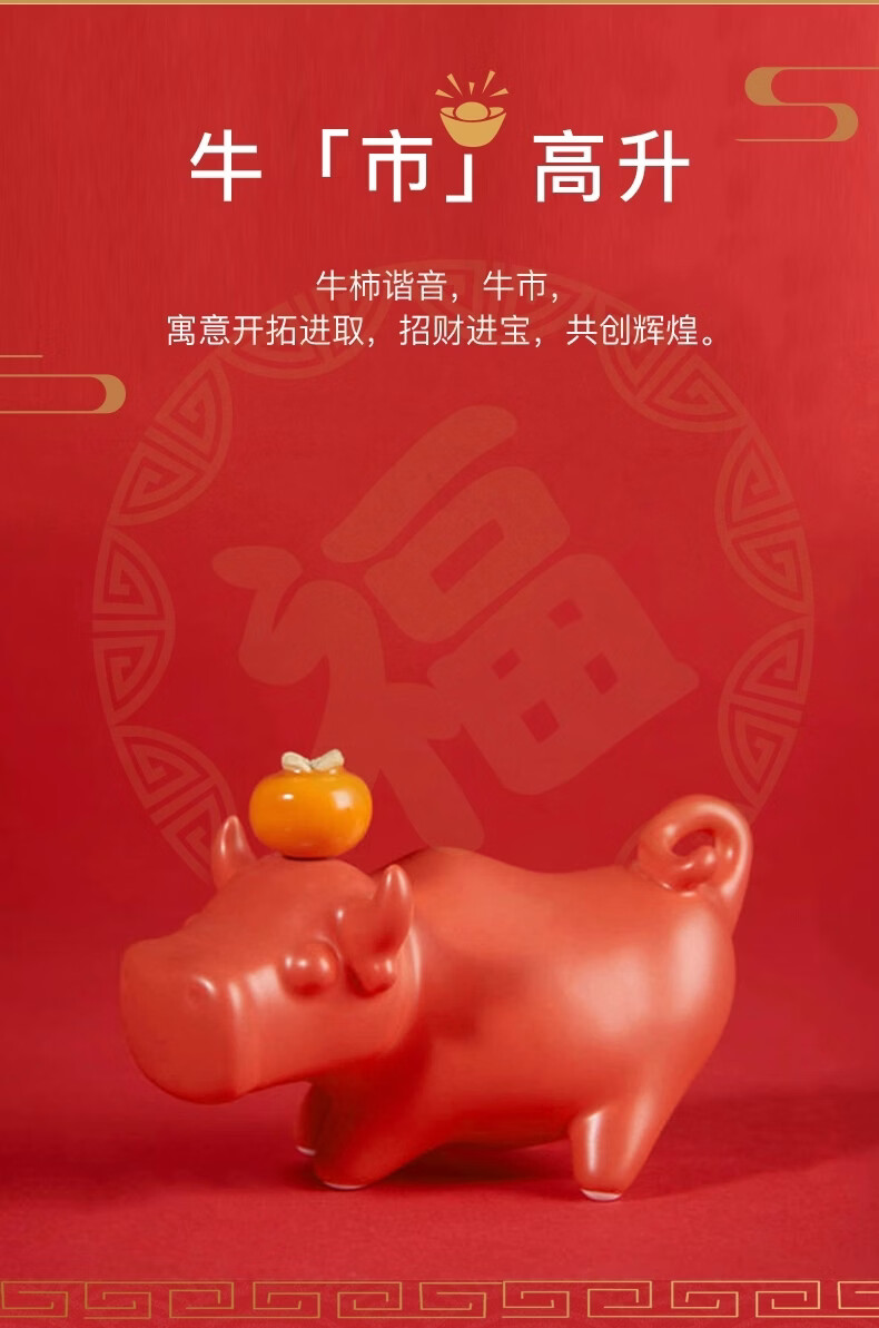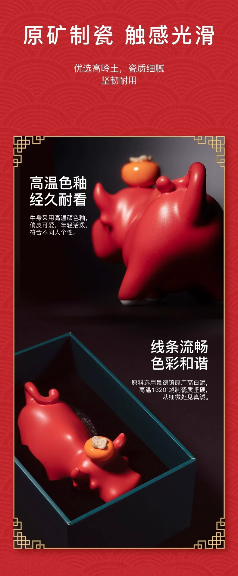 jdz陶瓷创意牛柿摆件中式家用家居桌面装饰品办公室送礼牛市发财礼 红色