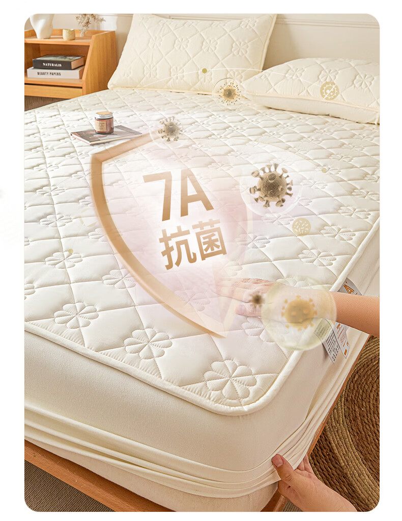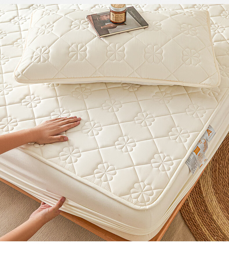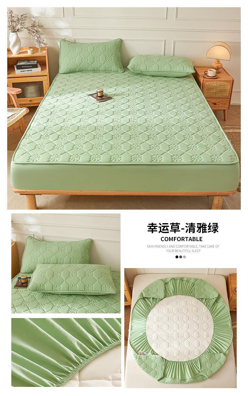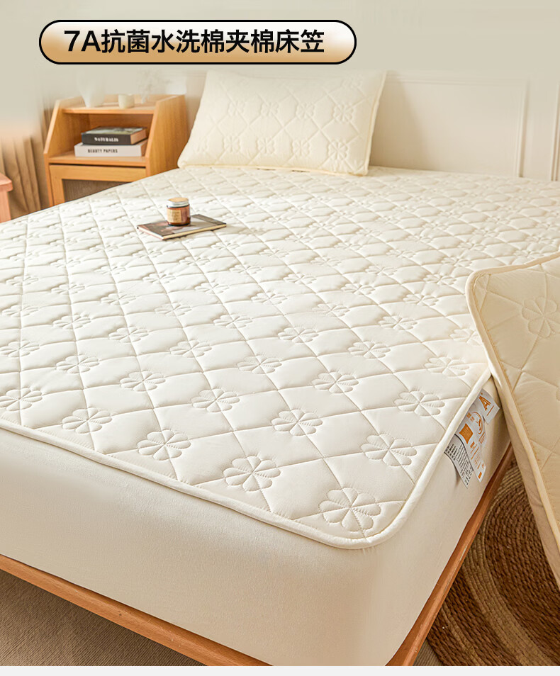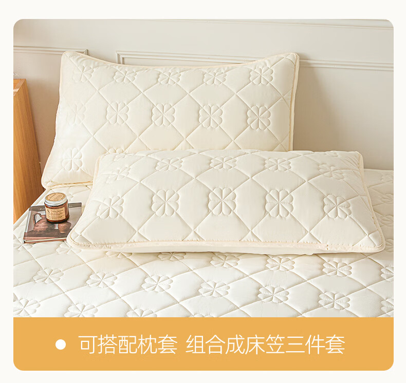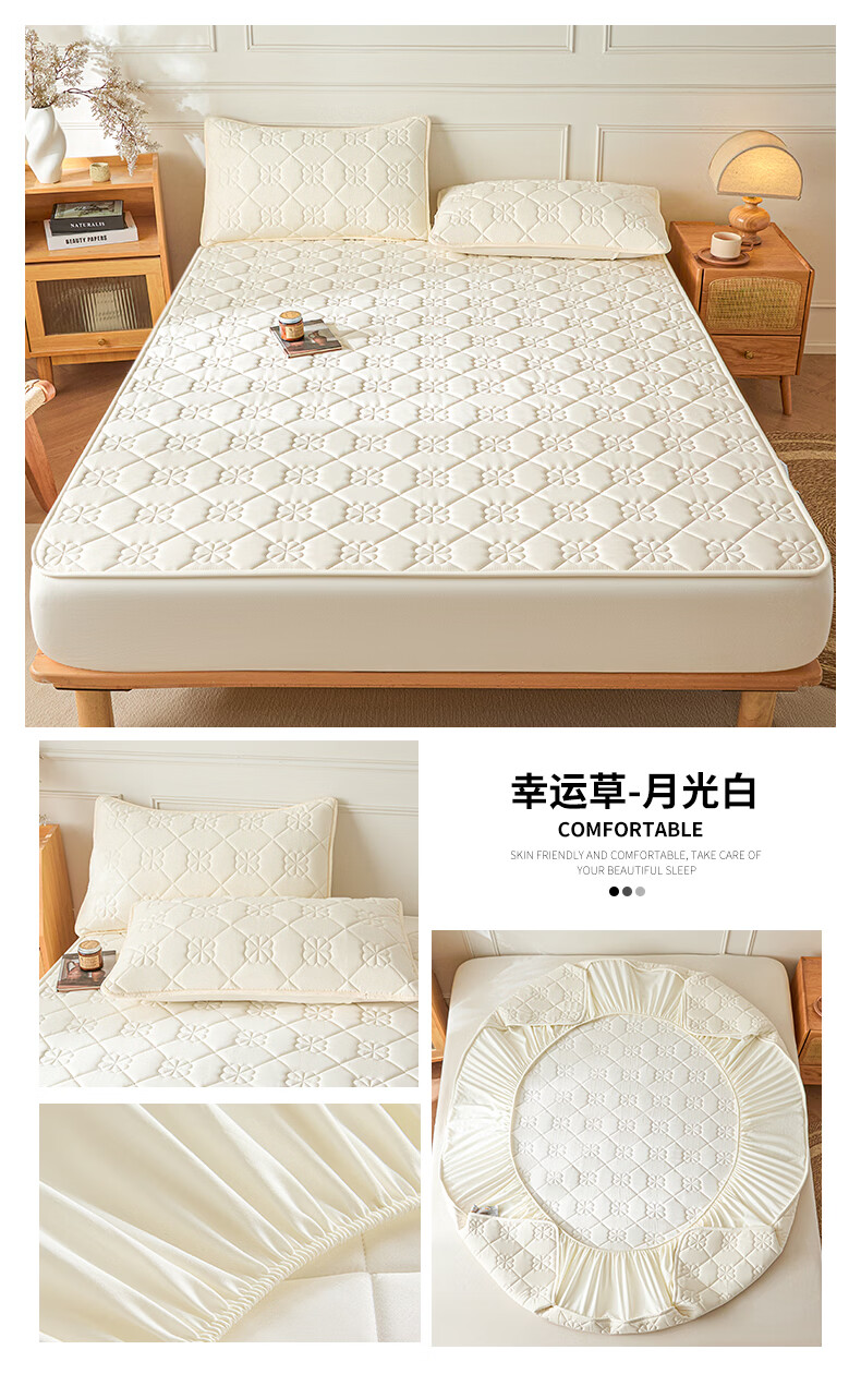无印良品7A抗菌夹棉床笠1.8米x2米单件家用加厚床罩床垫保护套床单防尘罩 幸运草-月光白【A类夹棉 360°全包防滑】 180cm*200cm 床笠+枕套一对