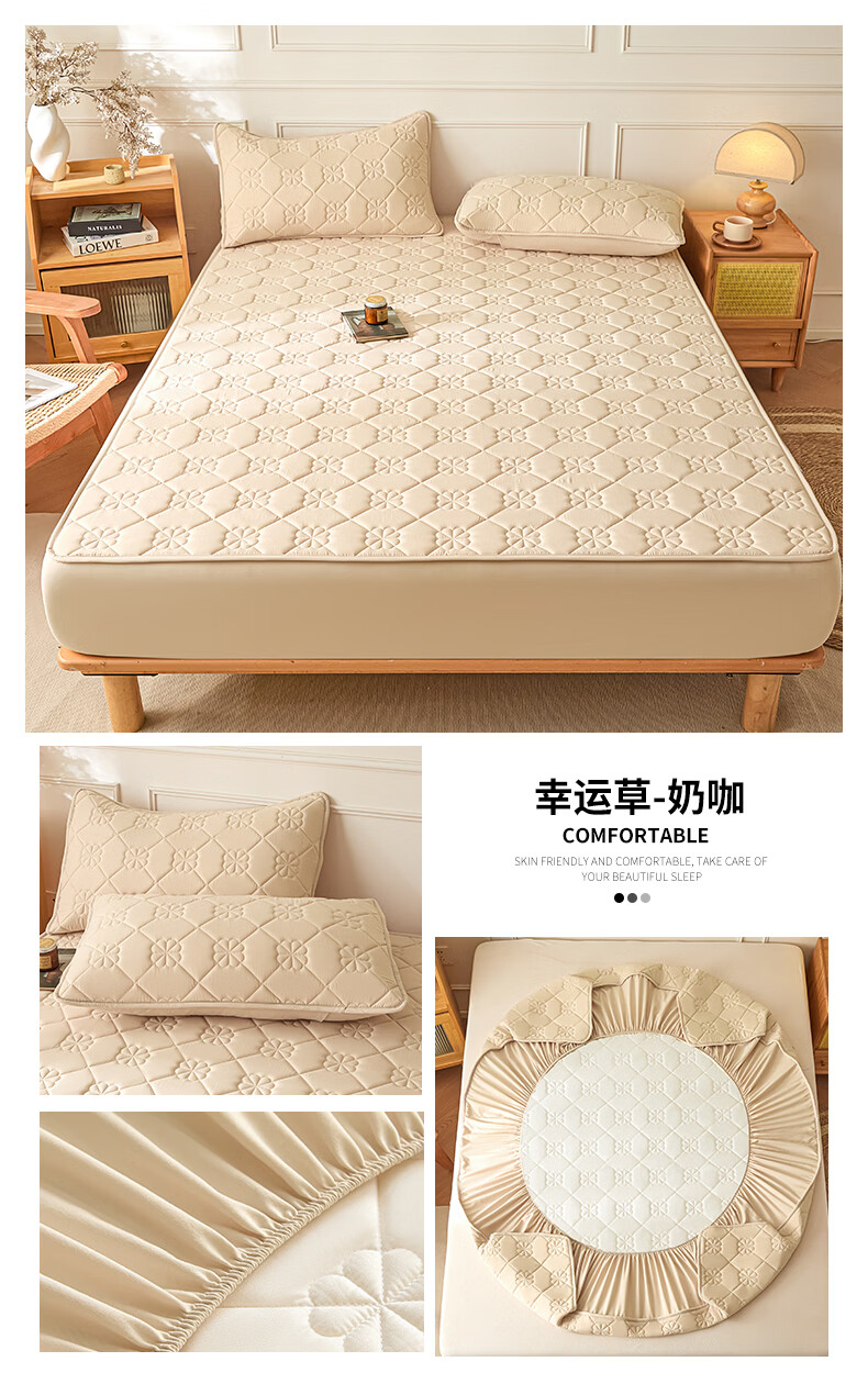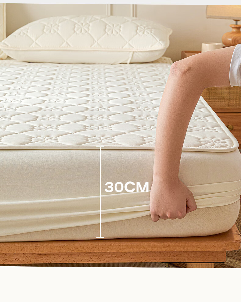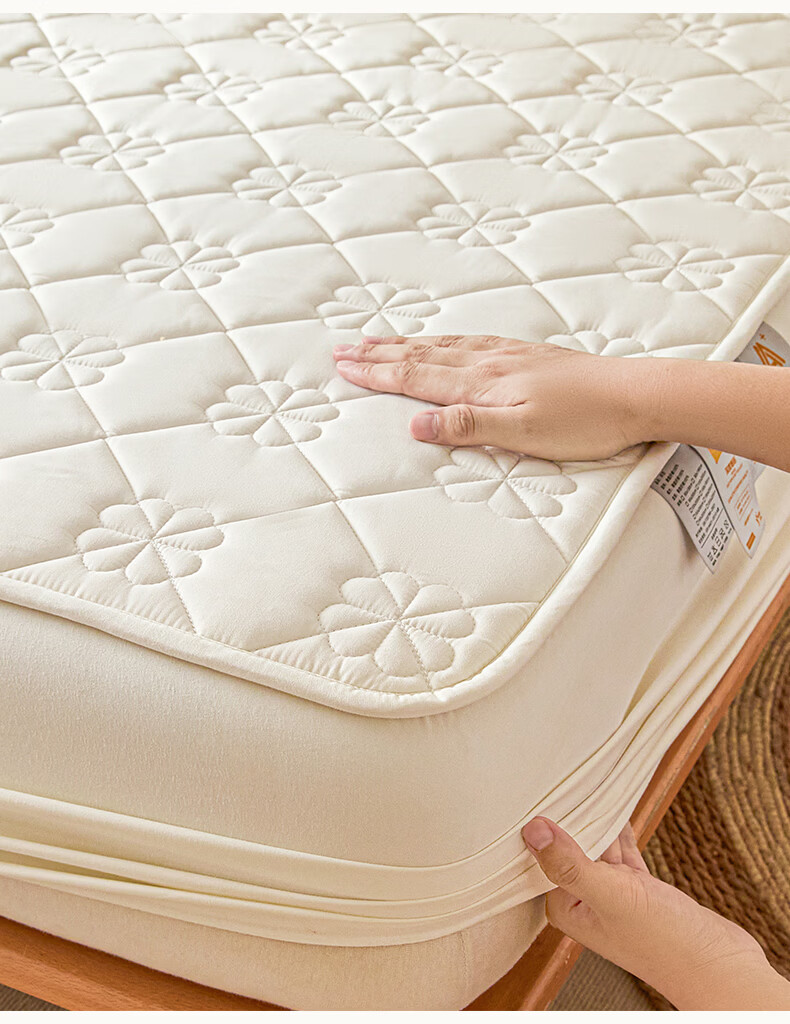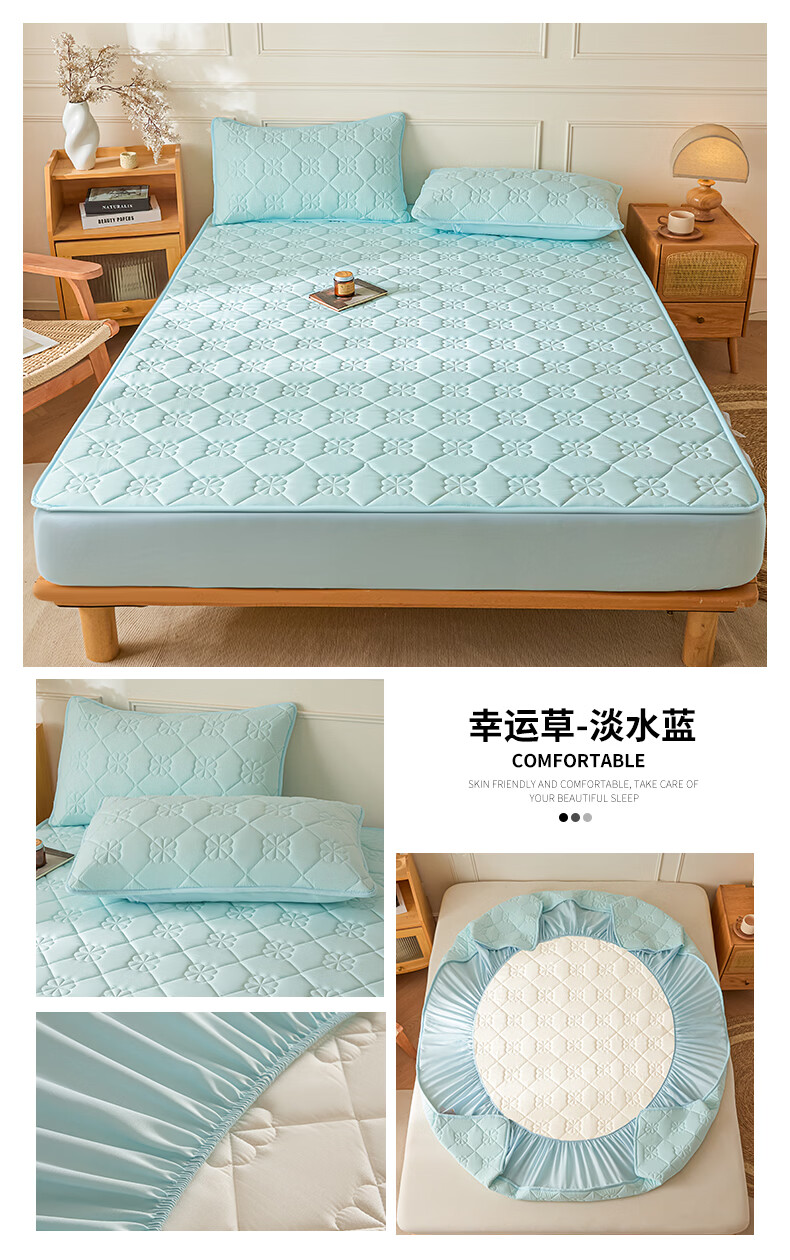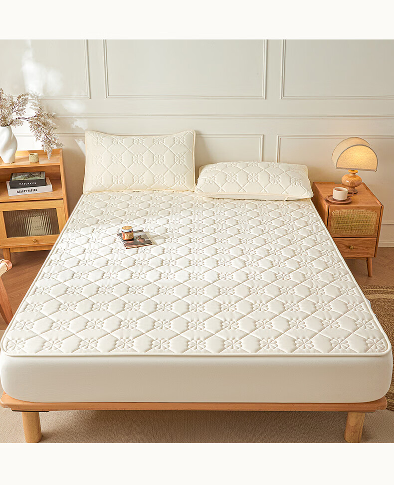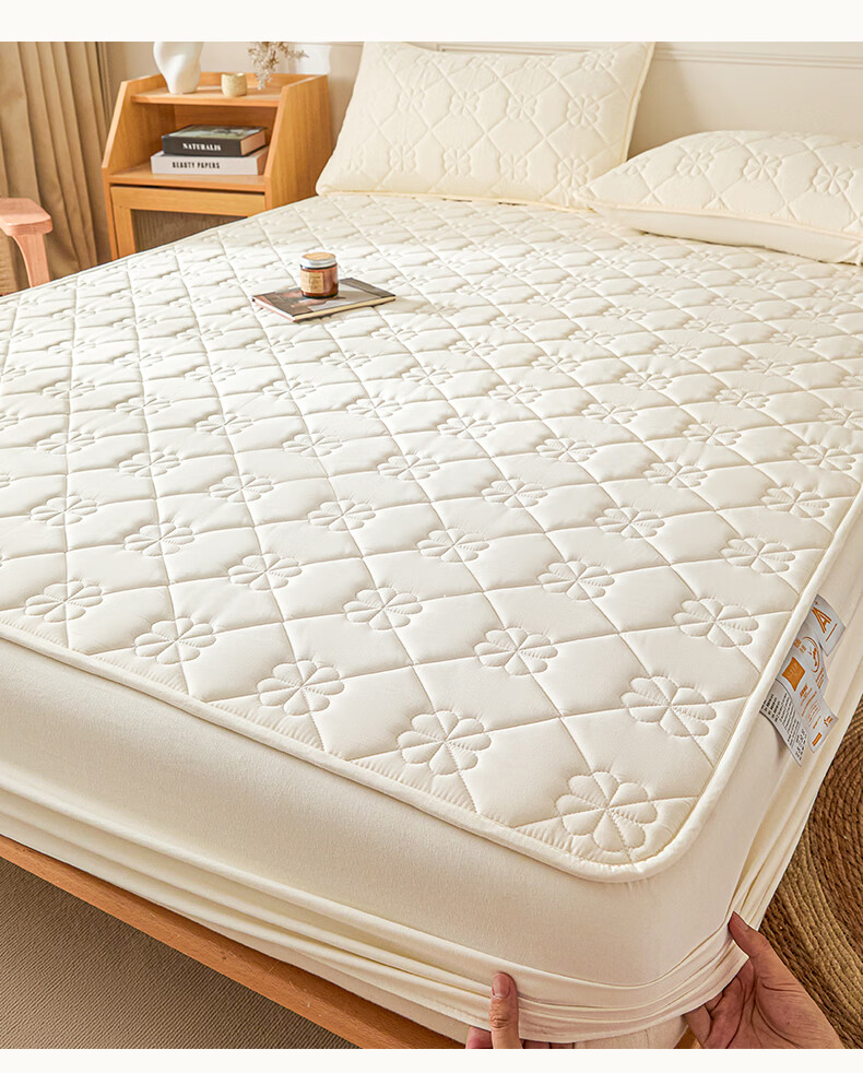 无印良品7A抗菌夹棉床笠1.8米x2米单件家用加厚床罩床垫保护套床单防尘罩 幸运草-月光白【A类夹棉 360°全包防滑】 180cm*200cm 床笠+枕套一对