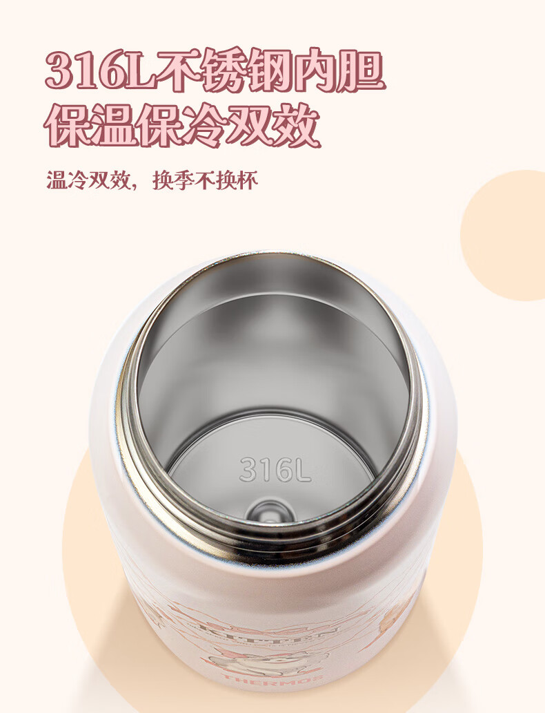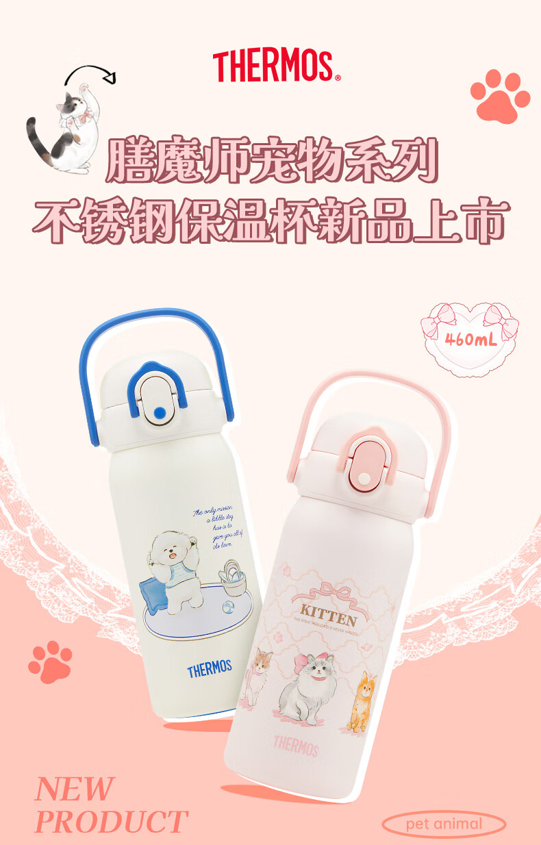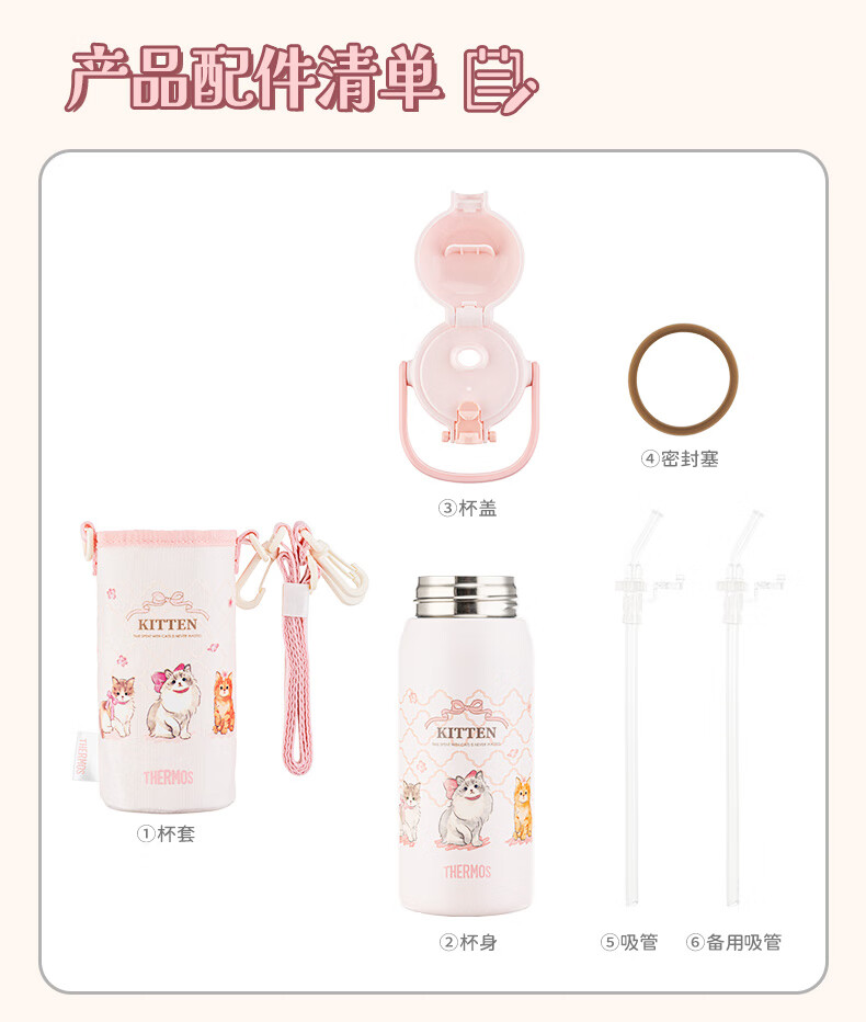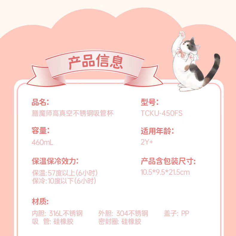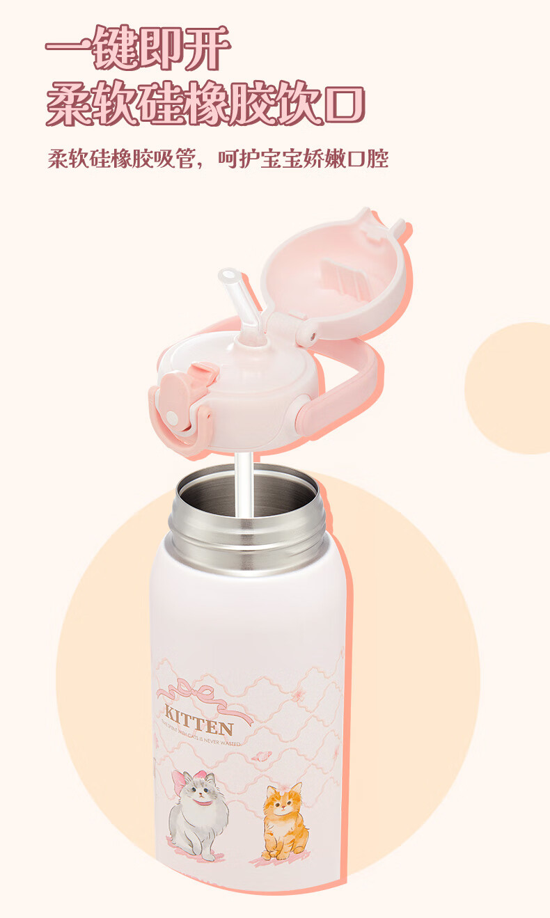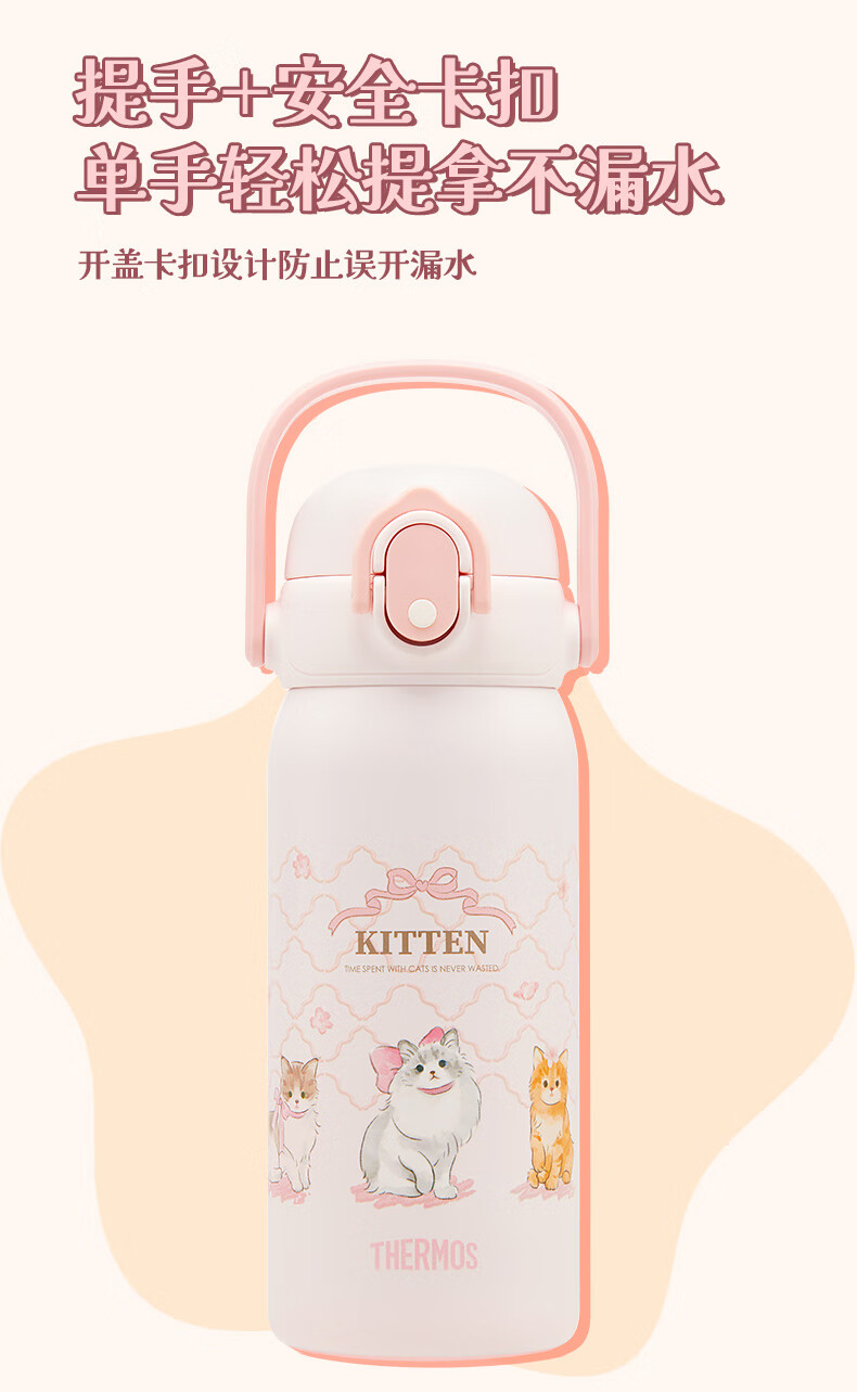 膳魔师小学生316L不锈钢吸管杯安全锁扣幼儿园儿童开学水杯460ml 粉