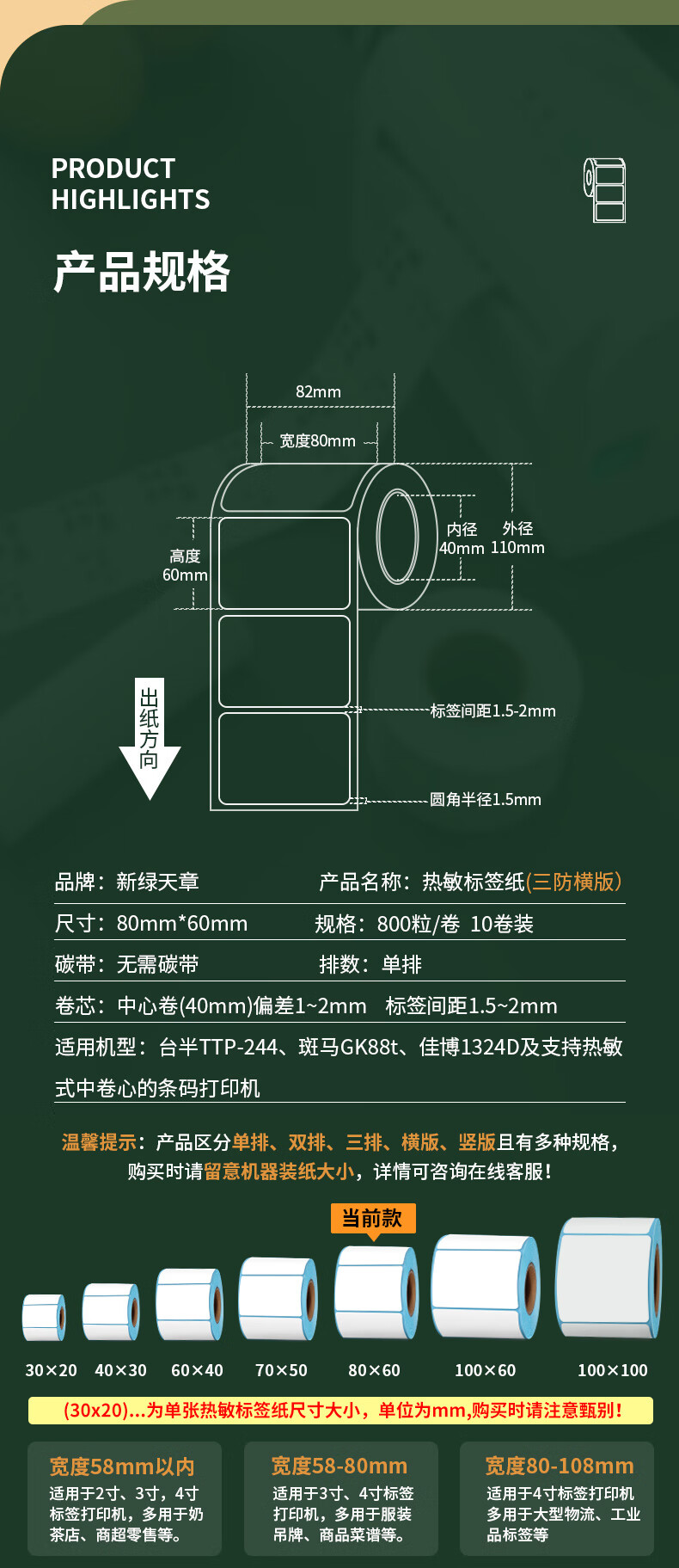 天章 (TANGO)80x60mm 800张*10卷 新绿天章三防热敏标签纸不干胶打印纸快递面单 适配3寸标签机