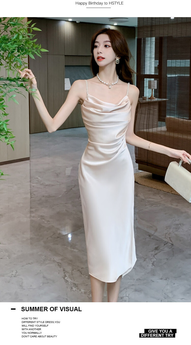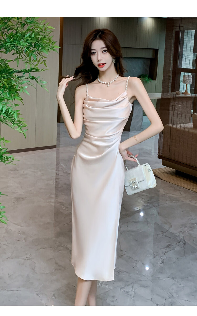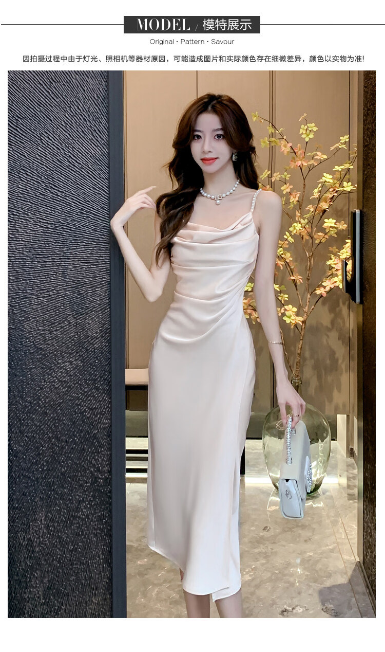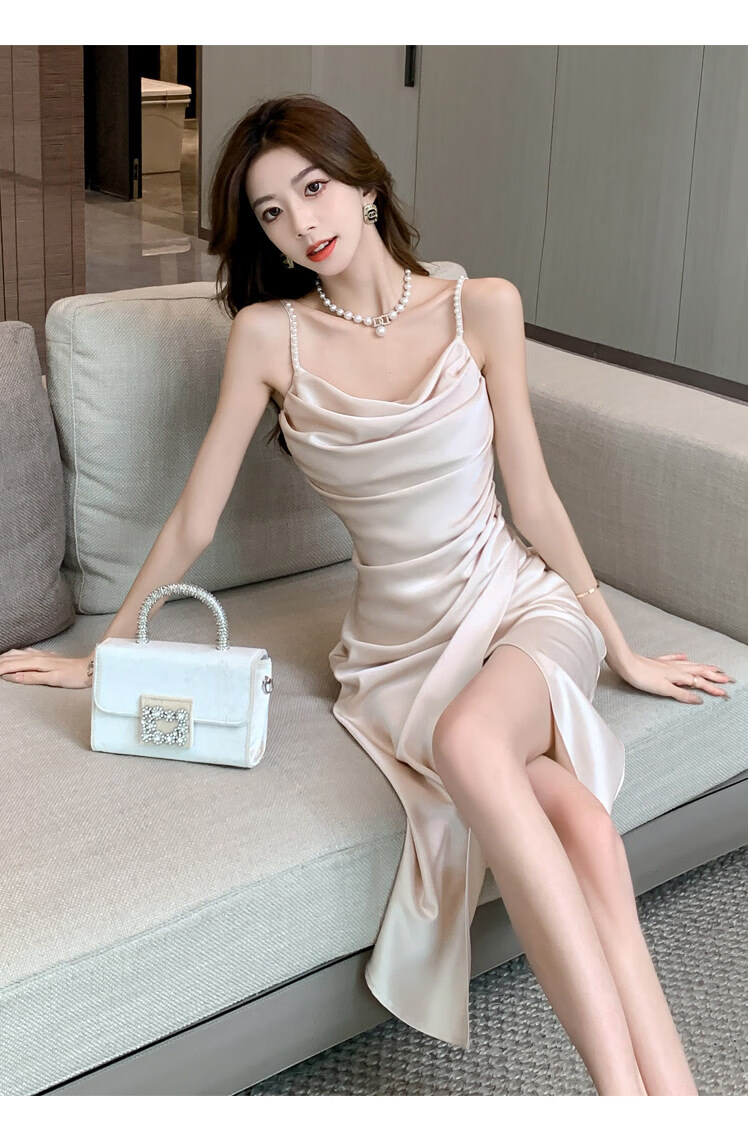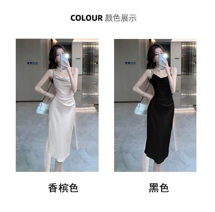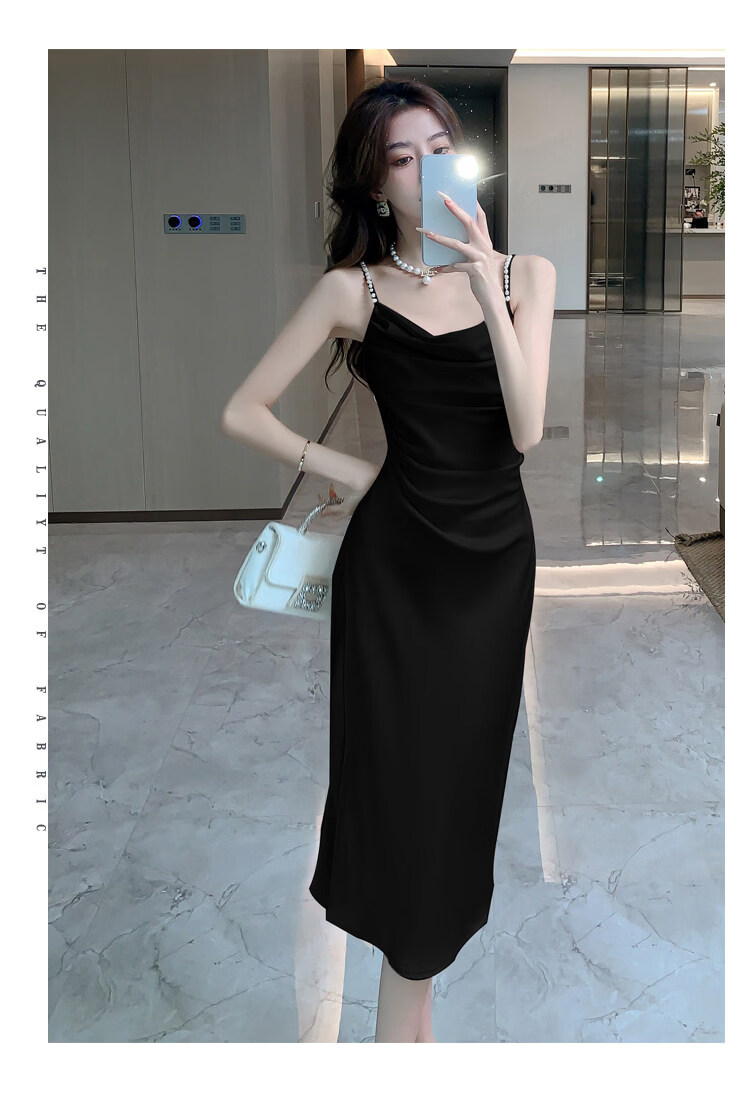 MODX法式小众缎面吊带裙女夏季钉珠开 叉气质洋装纯欲收腰修身包臀裙 黑色 L