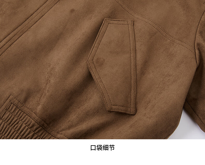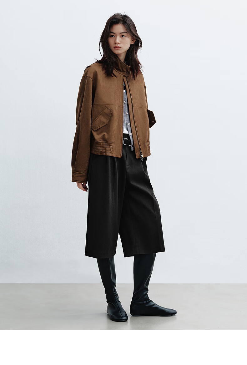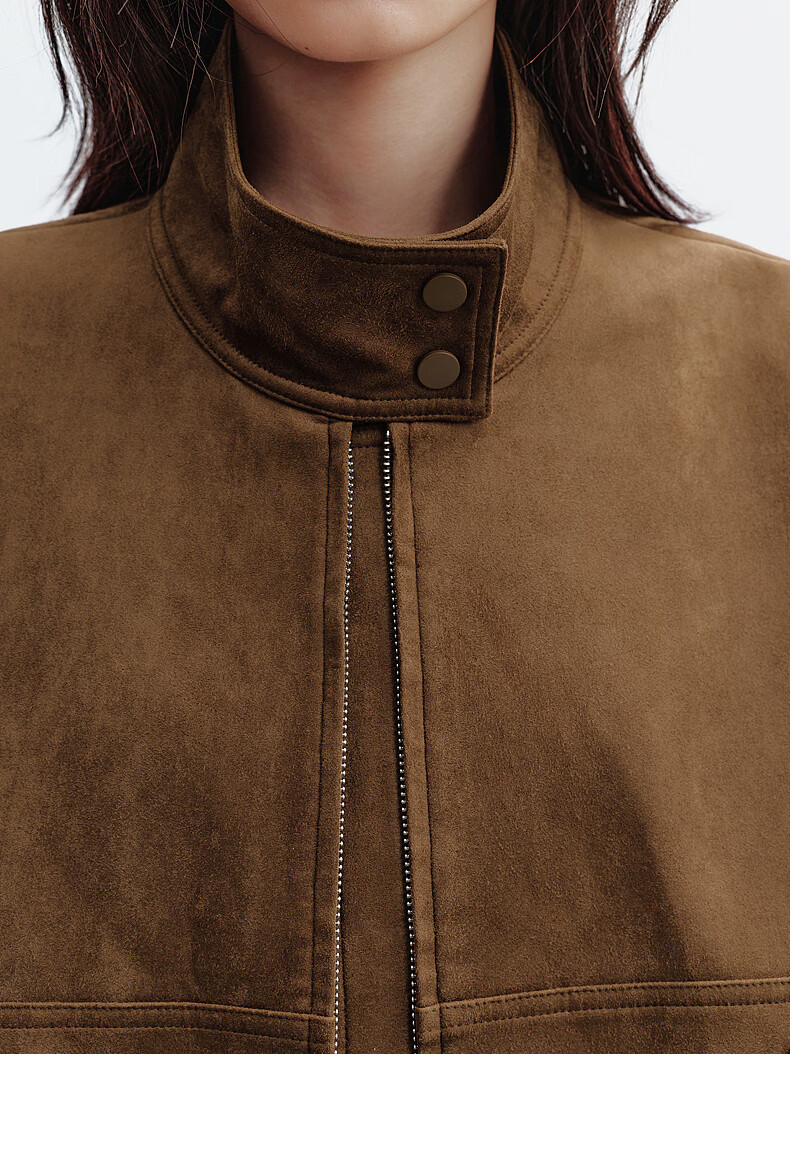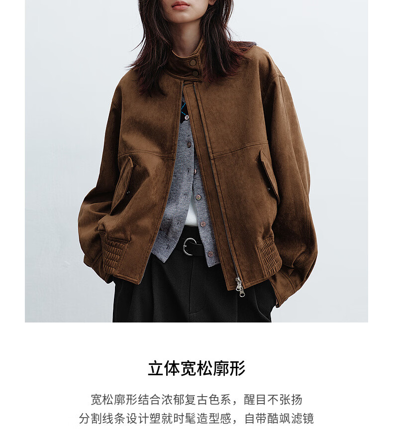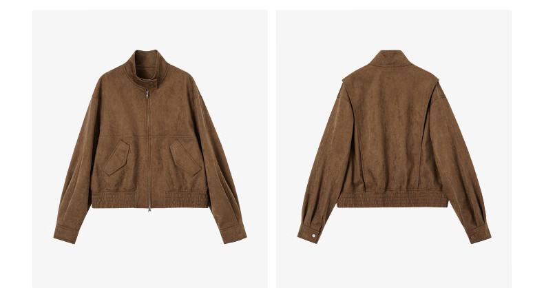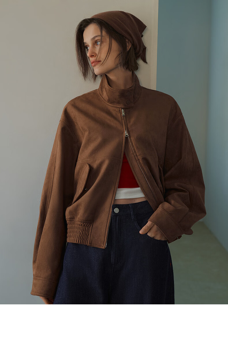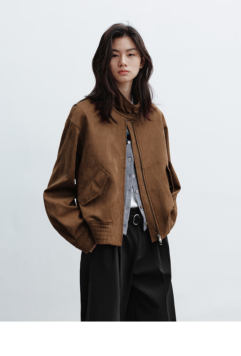 H's棕色仿麂皮立领短外套女26春季新款高级设计感立体宽松廓形上衣 蜜糖棕色 L