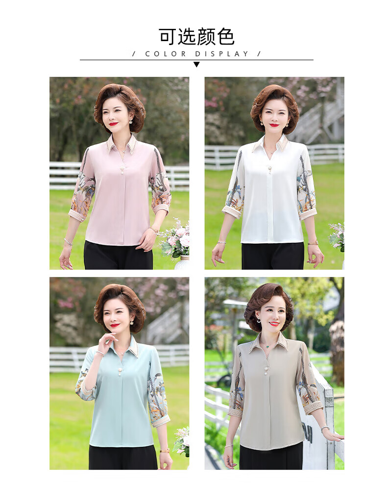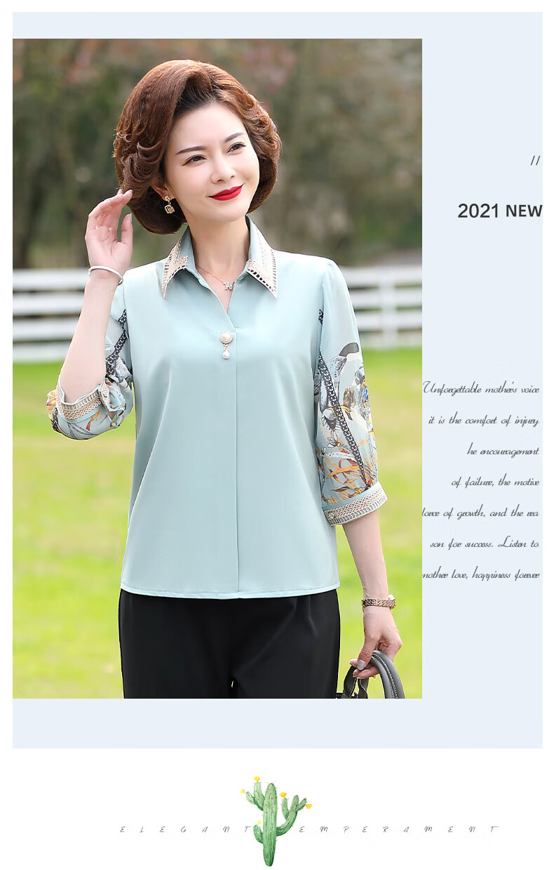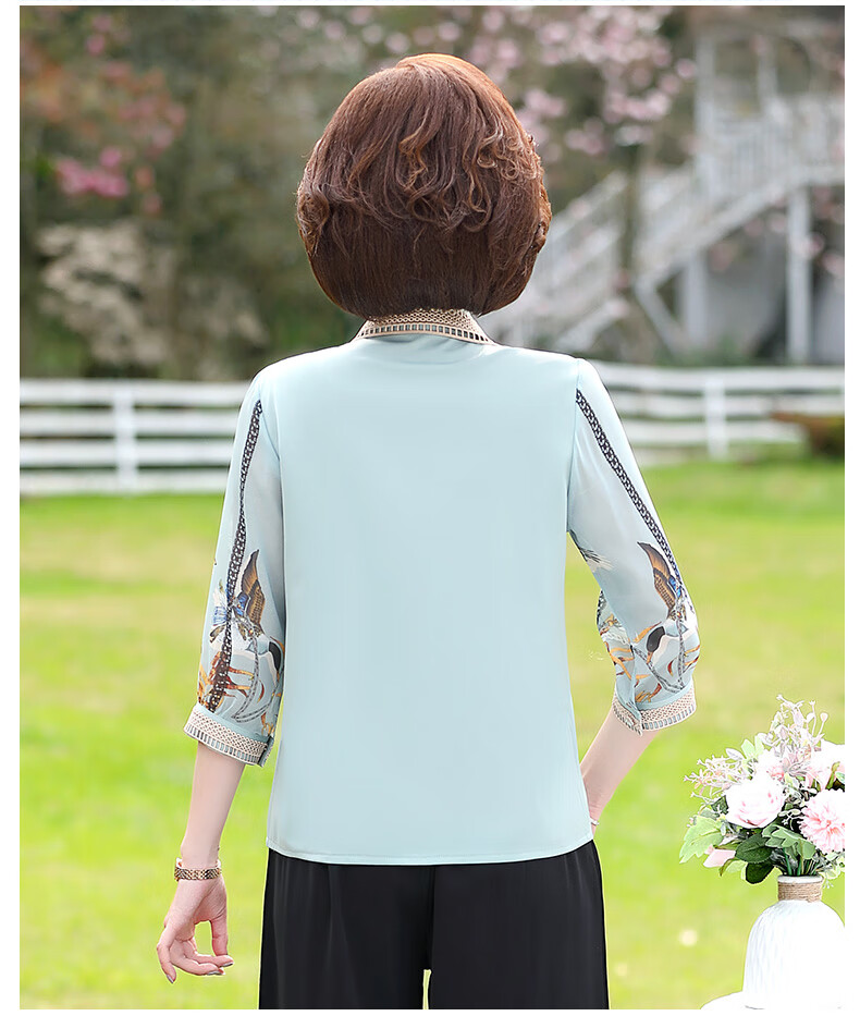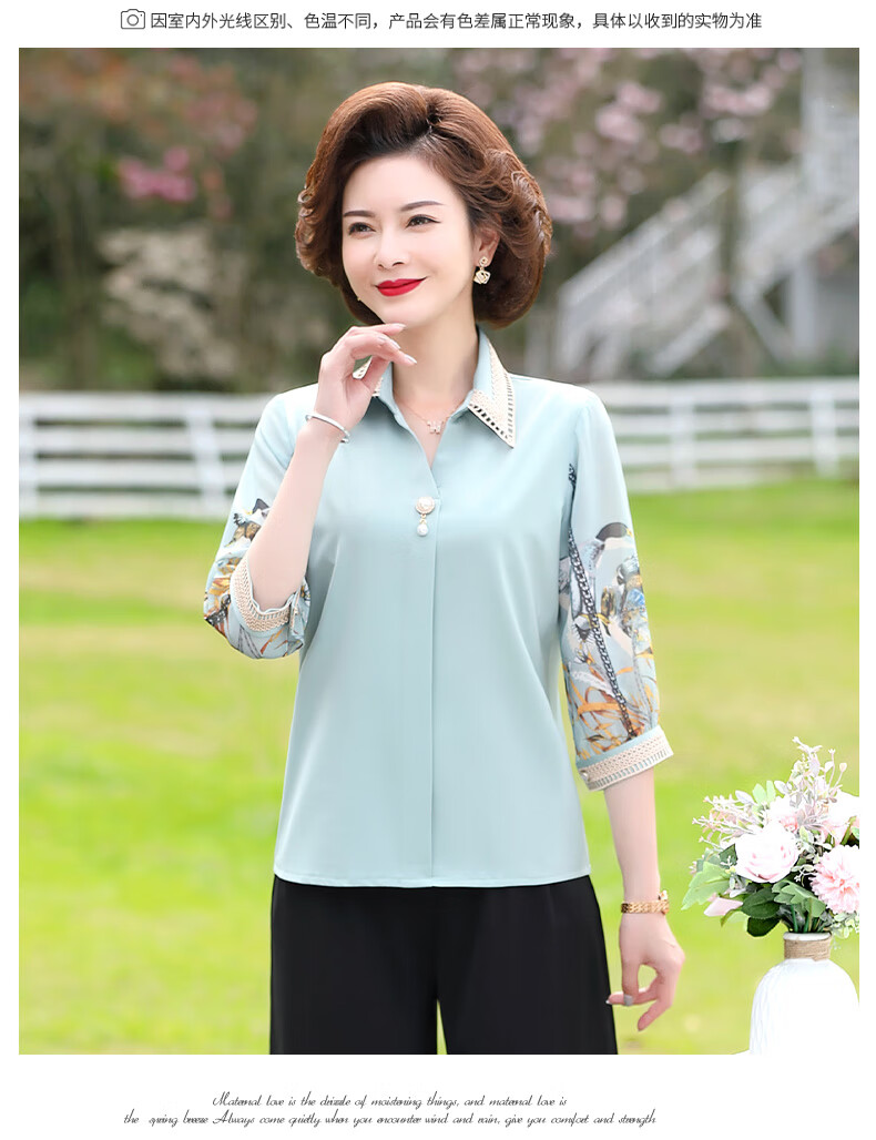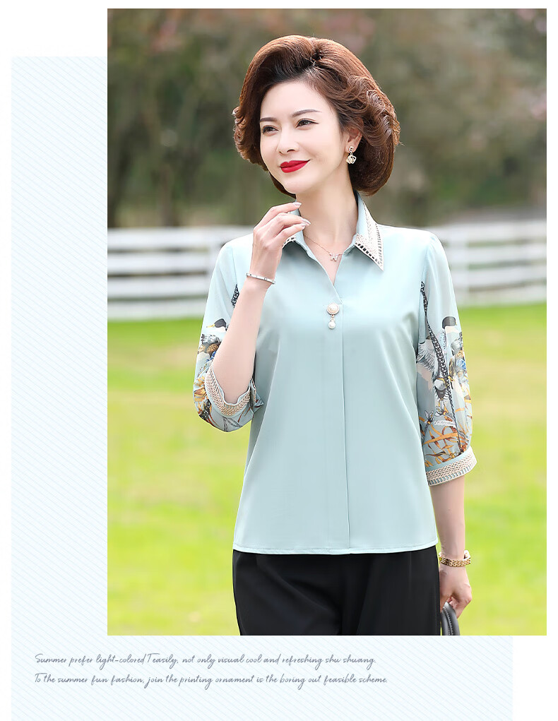 孜颜中老年女装夏装七分袖上衣衬衣洋气雪纺半袖衬衫40岁50夏季妈妈装 绿色上衣 XL 【建议100斤内】