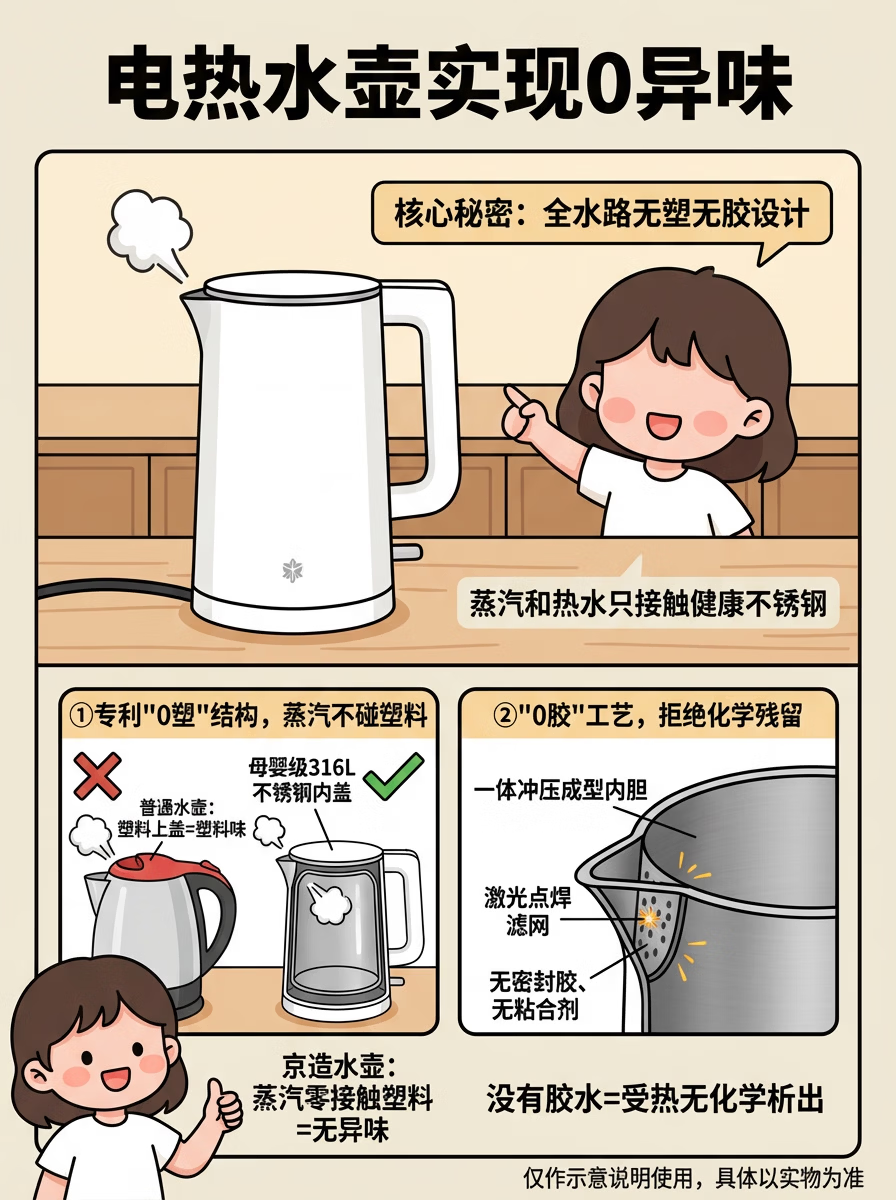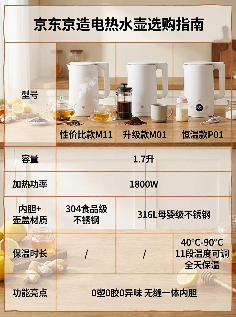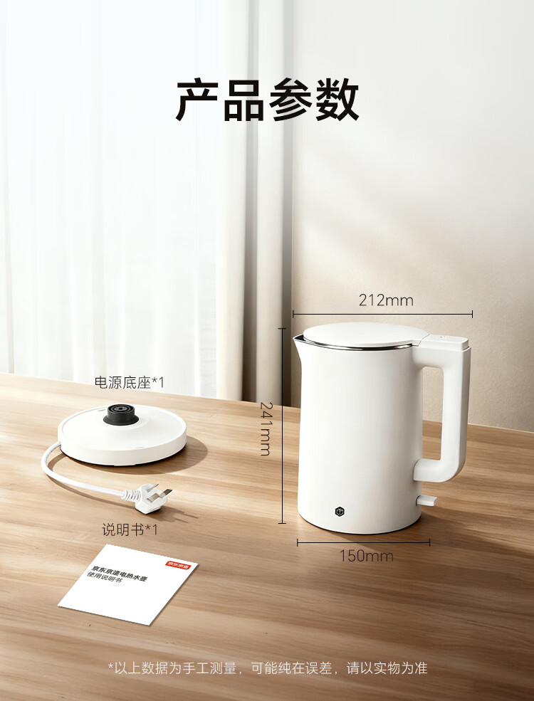 京东京造专利0塑0胶0异味电热水壶食品级316L不锈钢双层无缝一体内胆防烫烧水壶 1.7升1800W自动智能断电