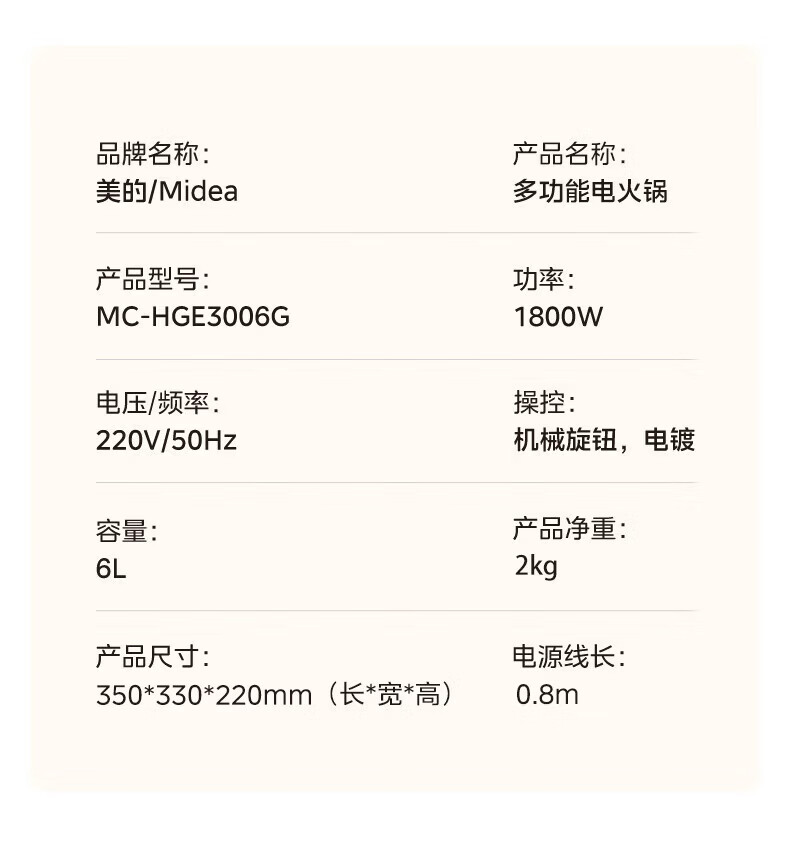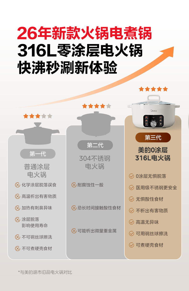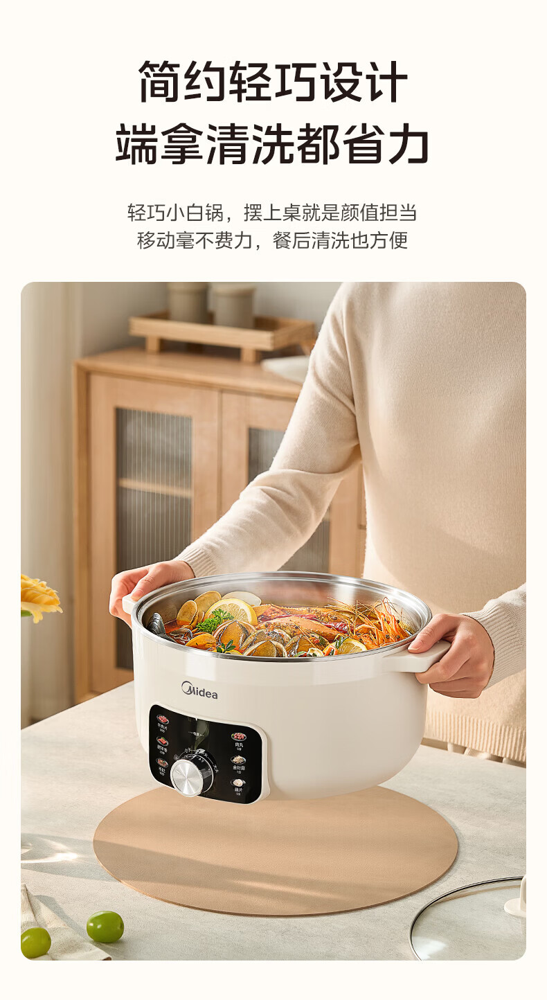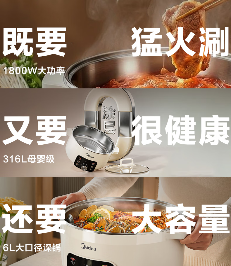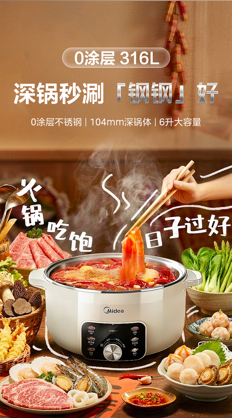 美的火锅电煮锅0涂层316L不锈钢内胆电火锅 2026新款多功能一体电锅2-3-4个人火锅专用锅 宿舍泡面锅 6L 【1800W母婴级316L加大加深内胆】