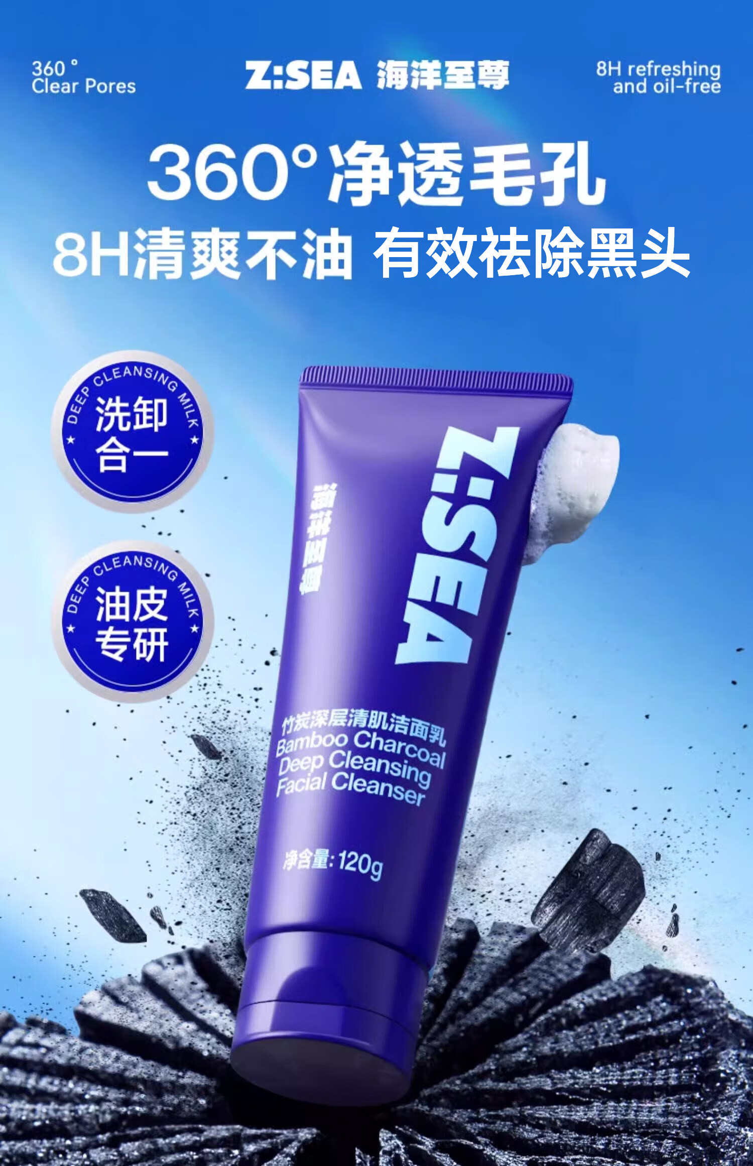 海洋至尊竹炭洗面奶男120g 控油祛痘去黑头收缩毛孔 洁面乳 男士护肤品