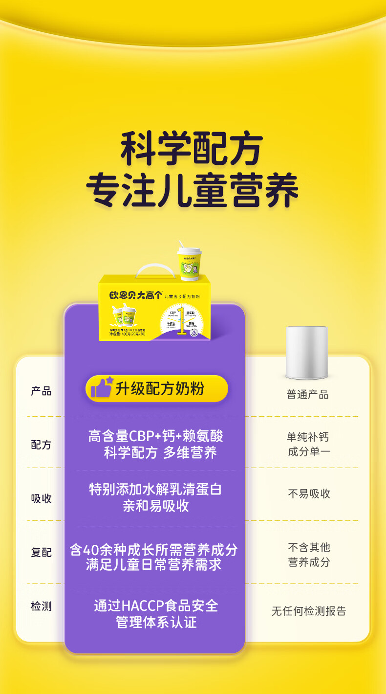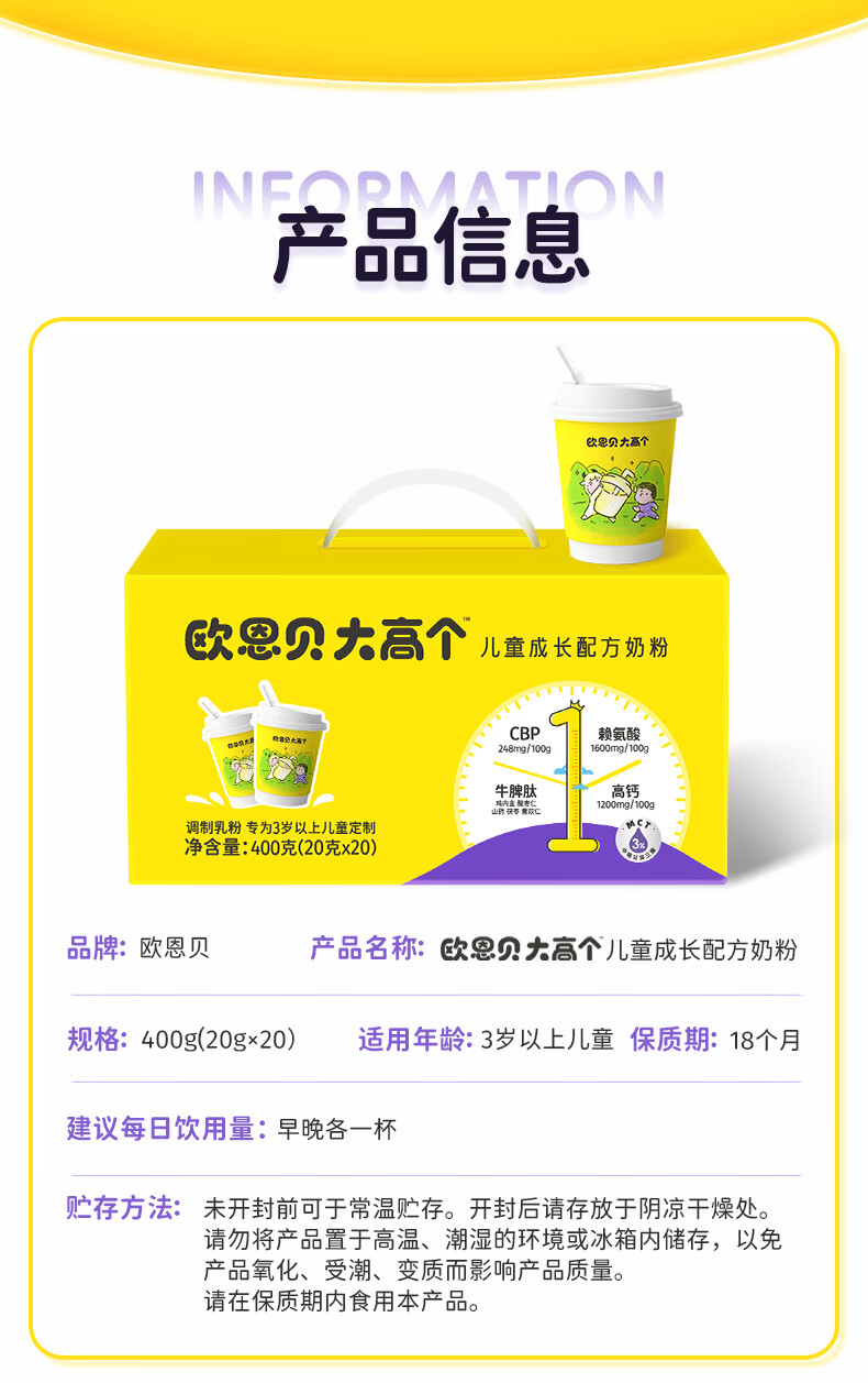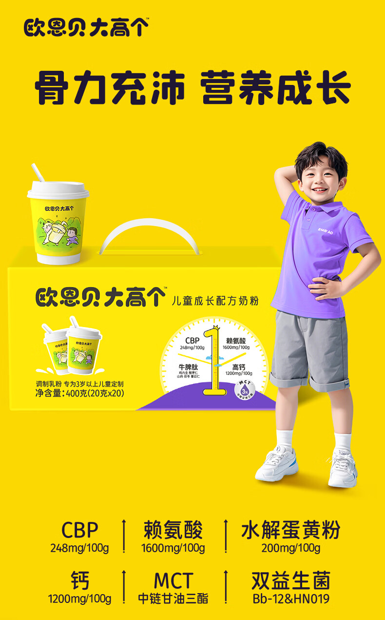 欧恩贝大高个儿童奶粉含CBP赖氨酸高钙牛脾肽学生成长奶粉400g