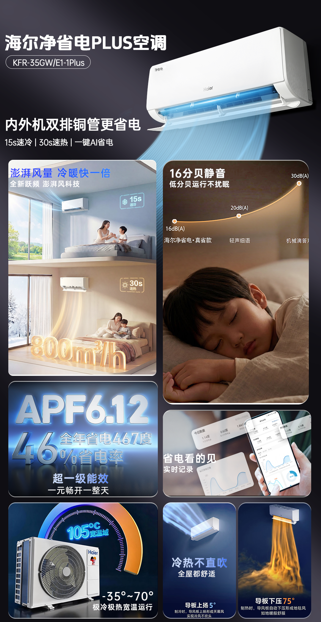 海尔空调1.5匹净省电plus一级能效小红花双排铜管变频冷暖挂机以旧换新节能静音家用KFR-35GW/E1-1Plus 【净省电Plus】1.5匹 APF6.12 | 双排铜管