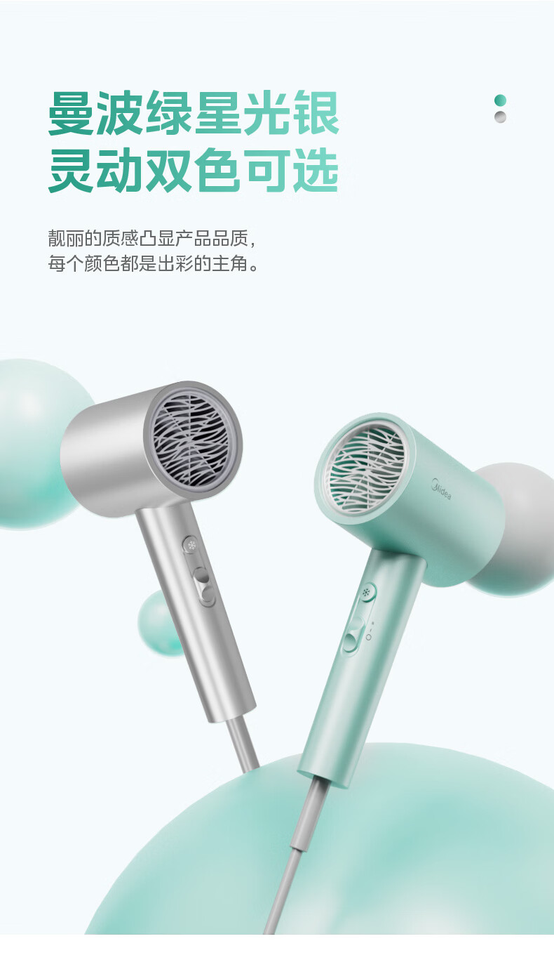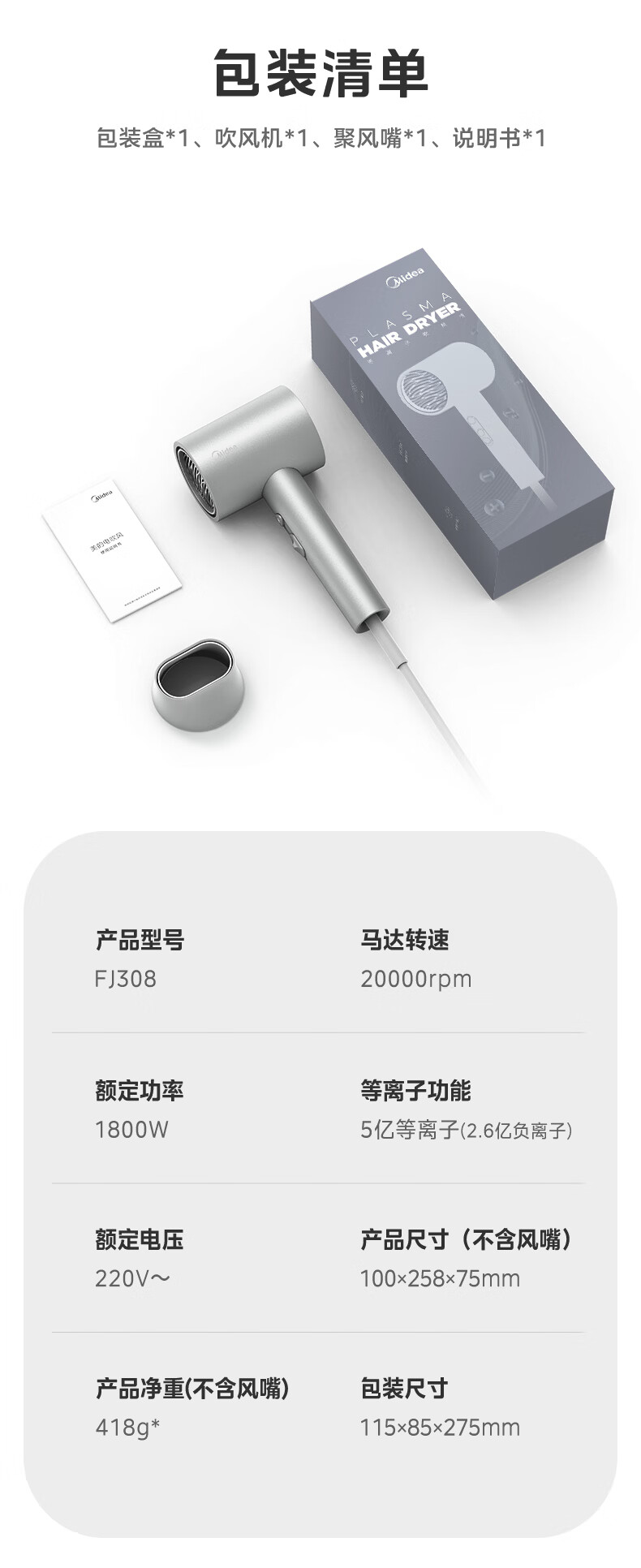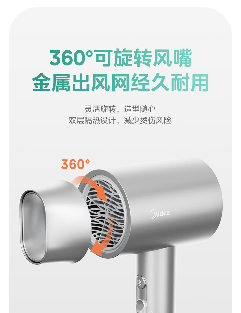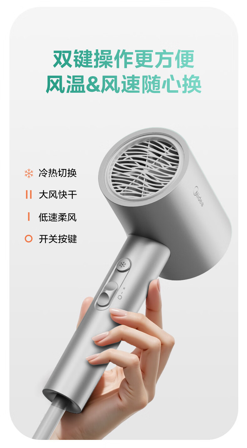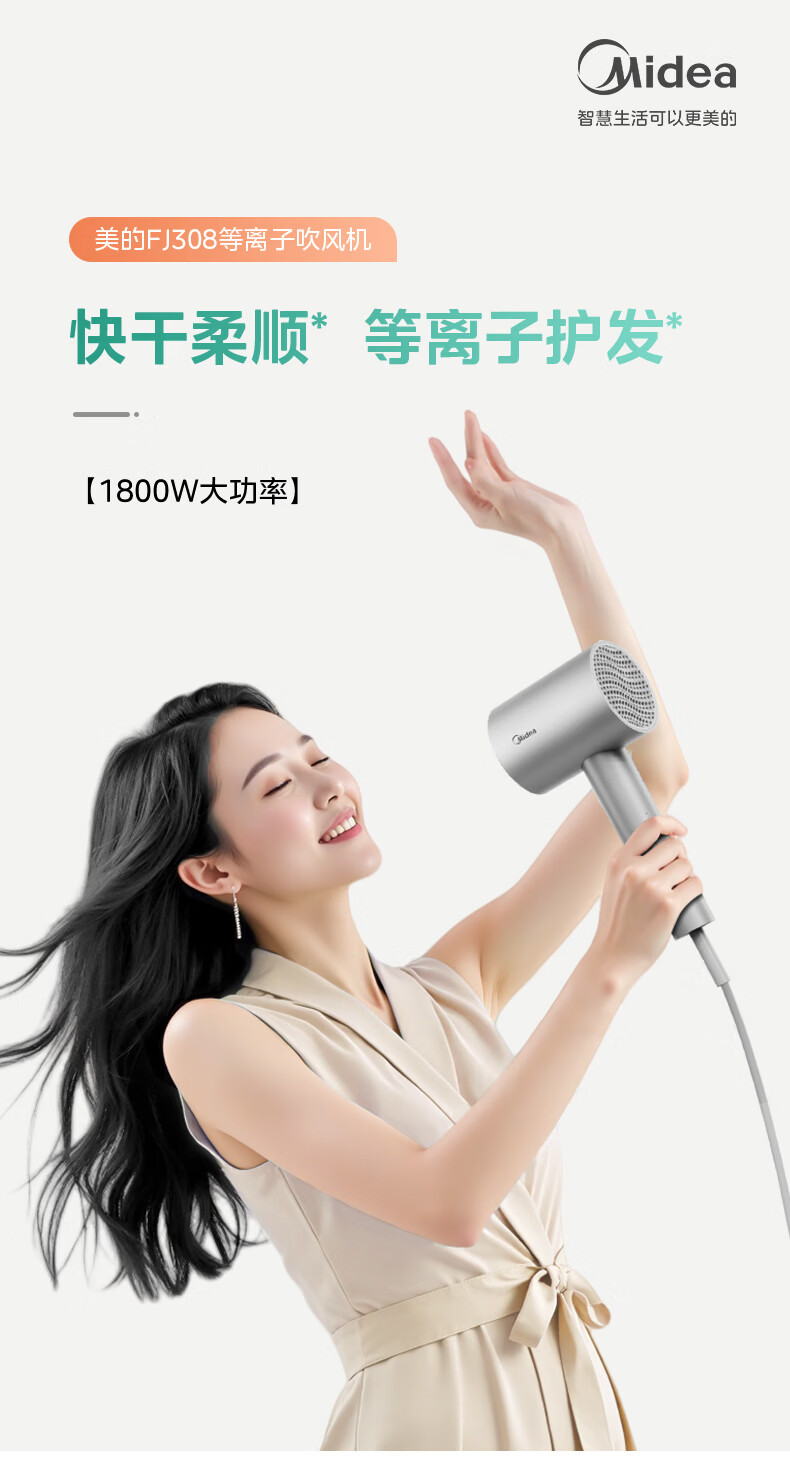 美的(Midea)5亿等离子护发电吹风 家用负离子护发吹风筒 1800W大功率快干吹风机 FJ308银 国家补贴 生日礼物