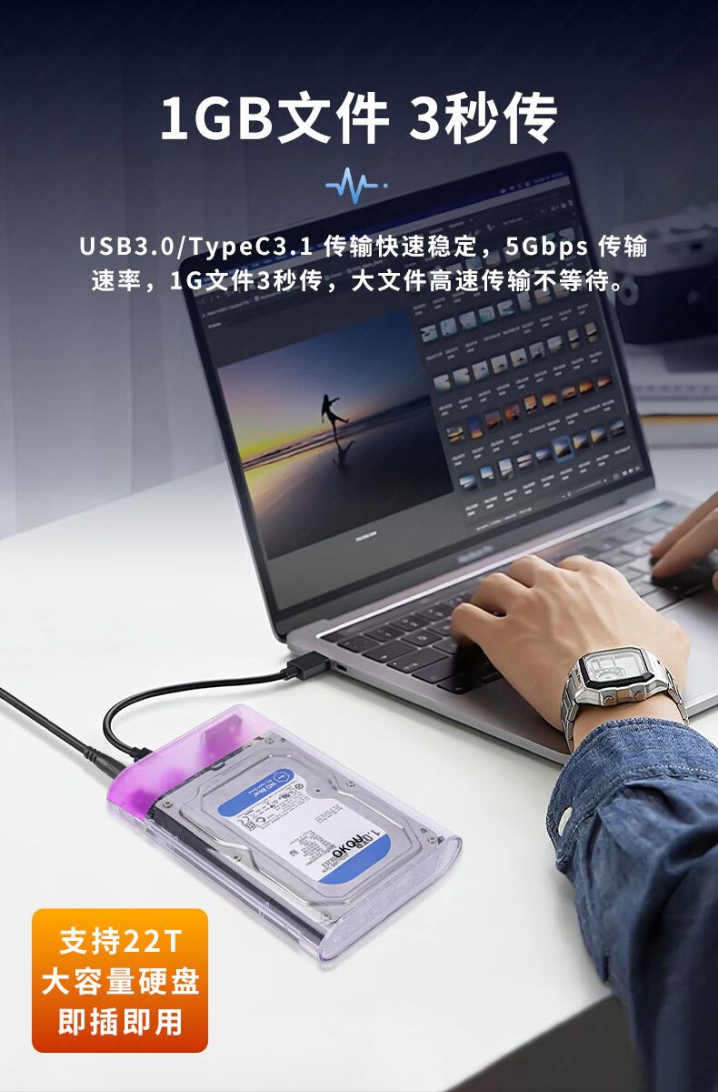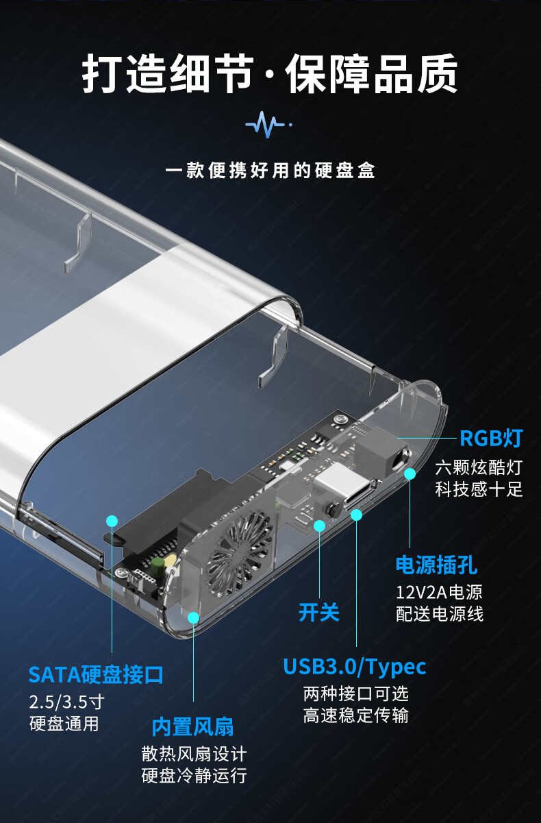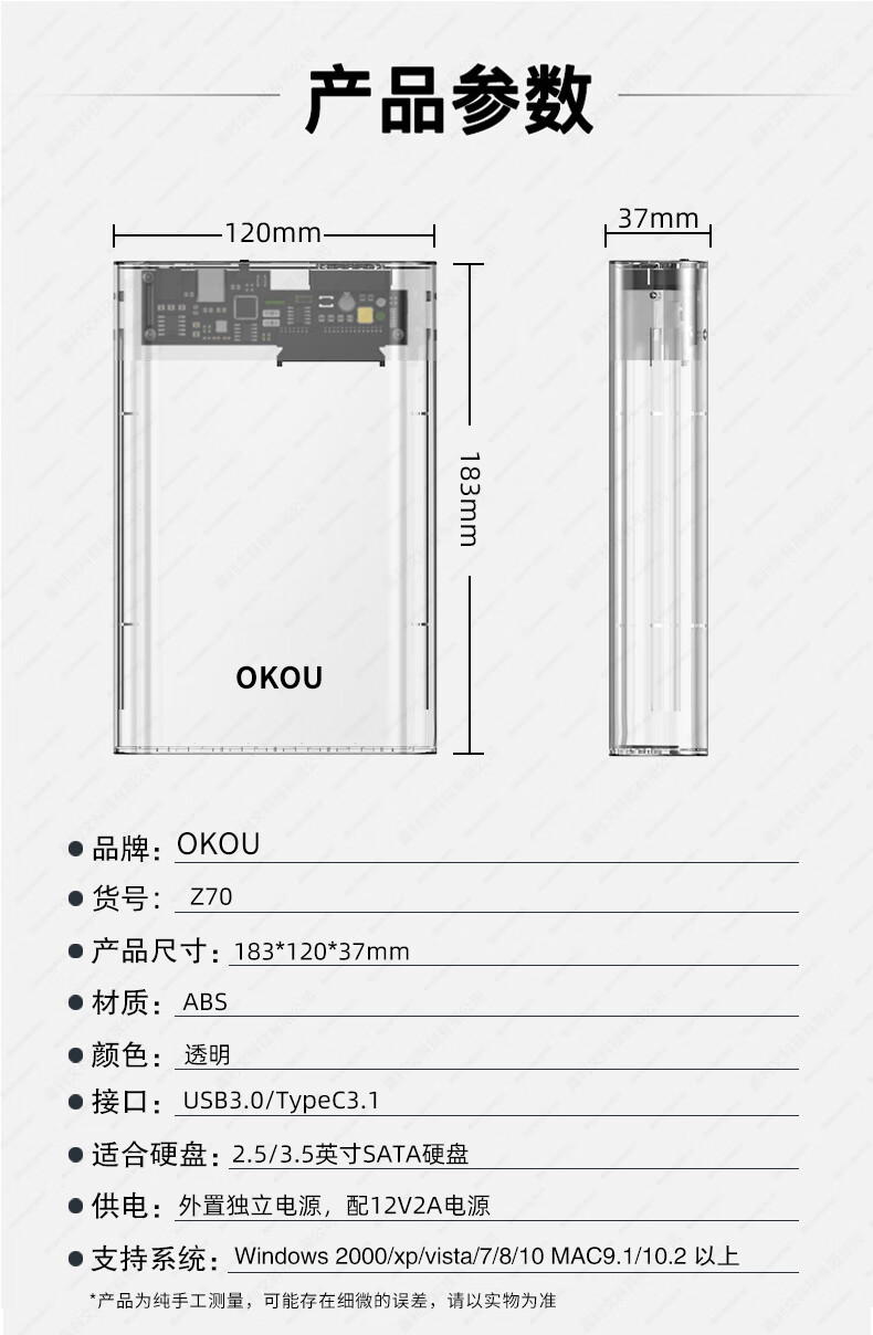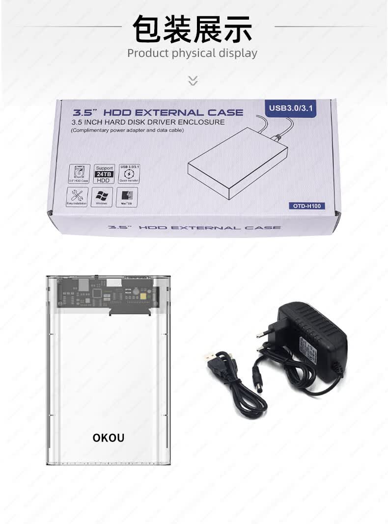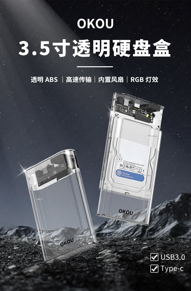 OKOU透明硬盘盒USB3.0高速传输移动2.5/3.5英寸SATA笔记本电脑外置壳固态机械ssdUSB3.1高速传输 透明3.1硬盘盒+转接头