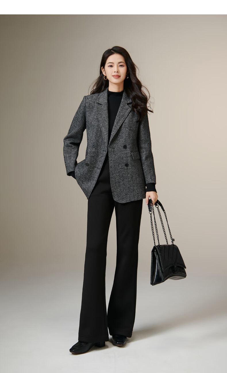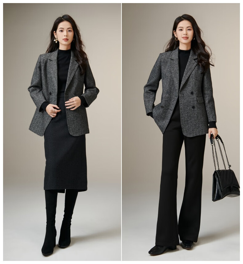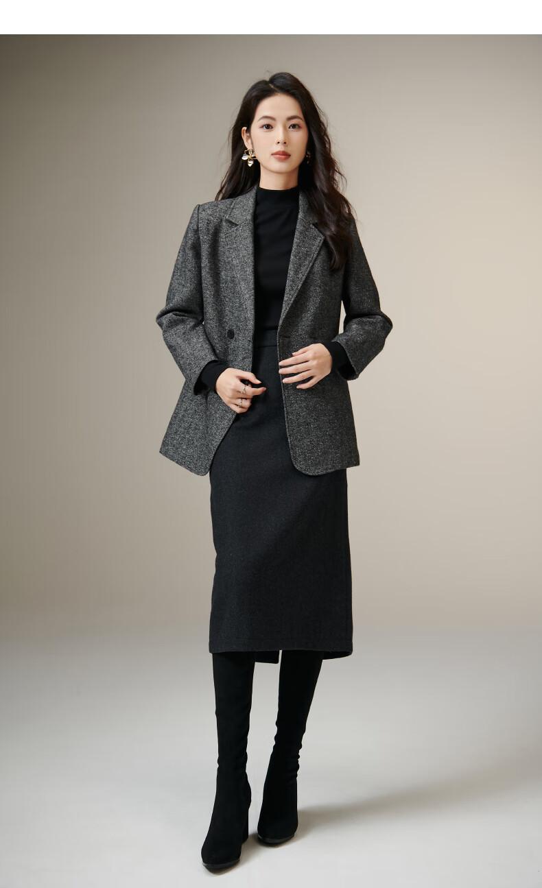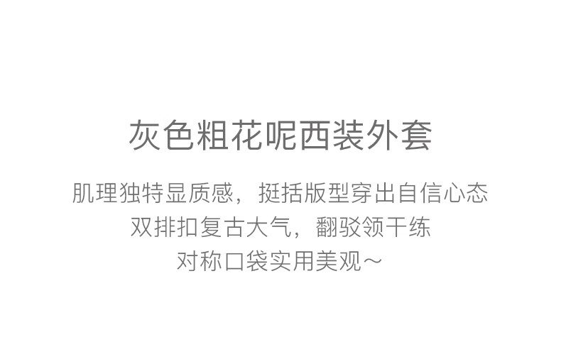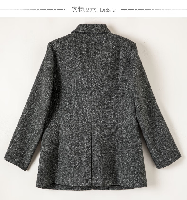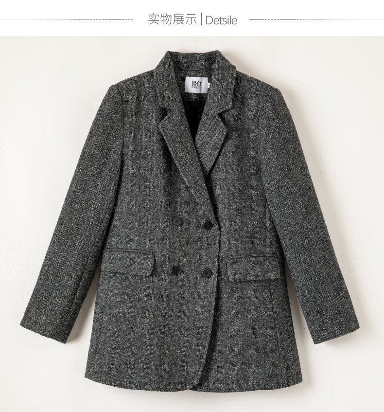 晚白【新品】冬款老钱静奢风粗花呢羊毛翻驳领西装气质夹棉格雷灰外套 深灰色 L