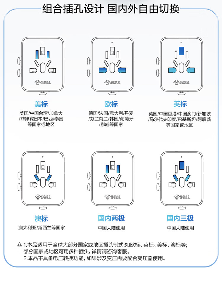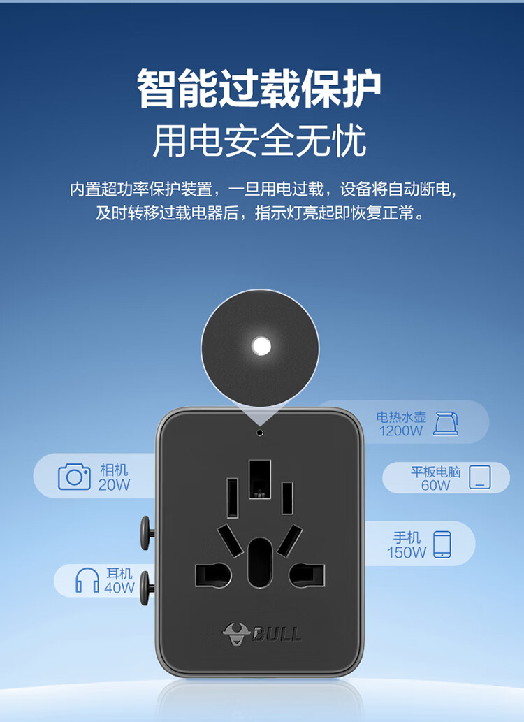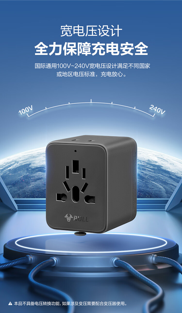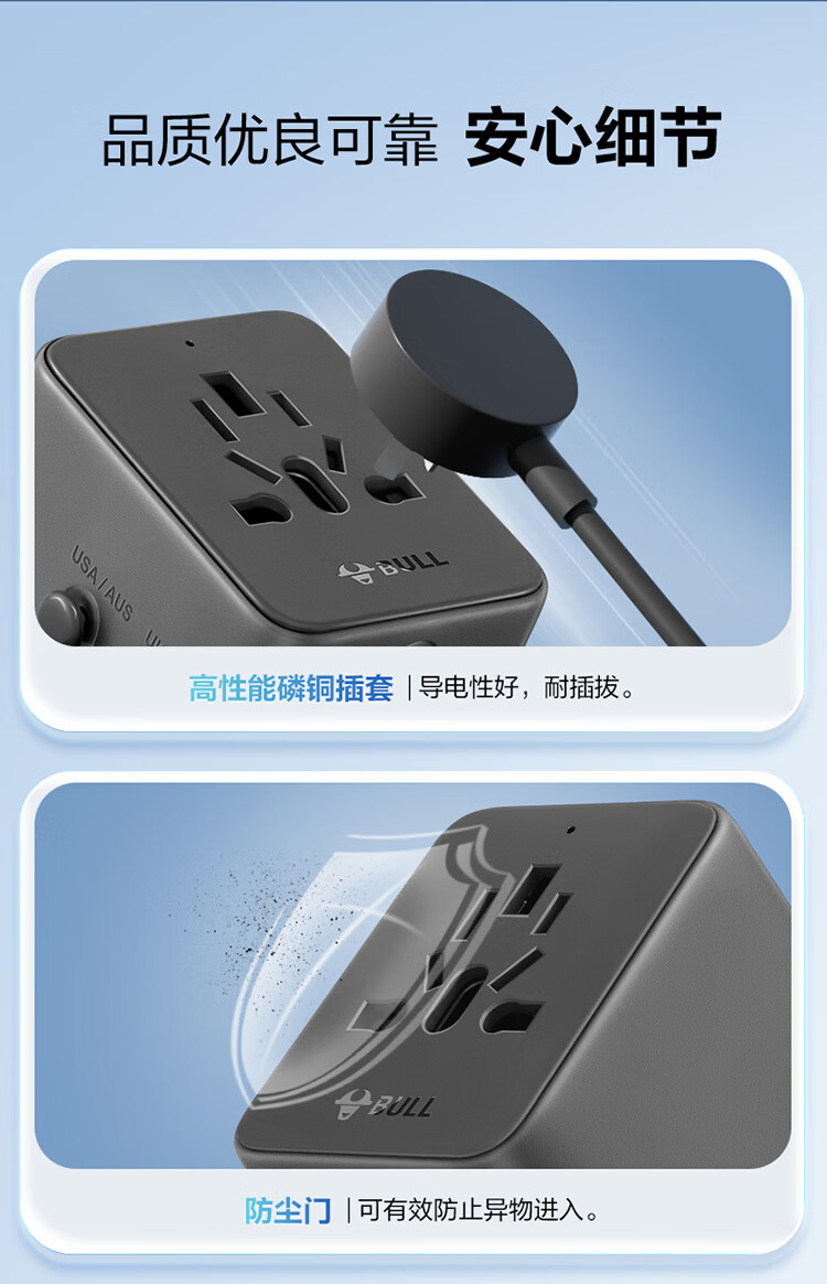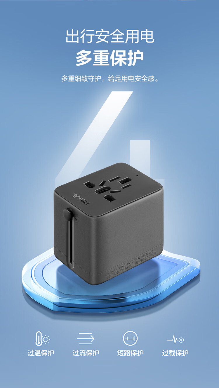 公牛(BULL)2位多国插座畅行世界转换插头/出国旅行出差留学超功率保护插头欧标美标澳标英标GN-L10 深空灰