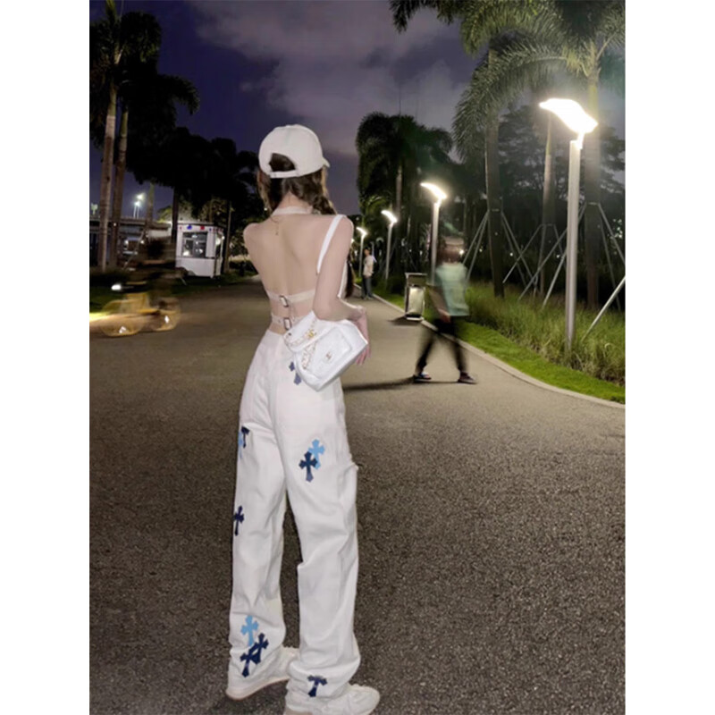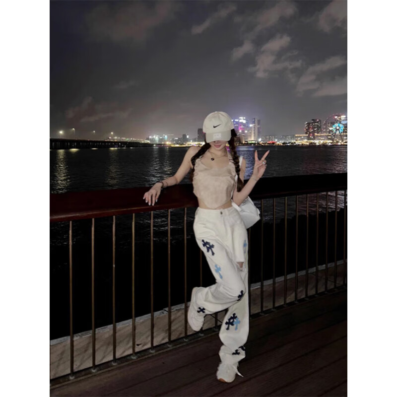 POUM白色破洞直筒轻奢牛仔裤男秋季新款十字皮标宽松显瘦阔腿裤子男 CHFS-C991白色 破洞款 L 115-130斤