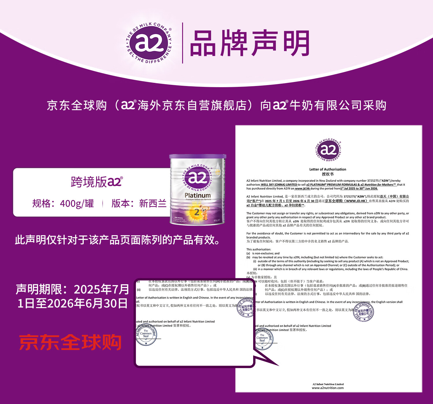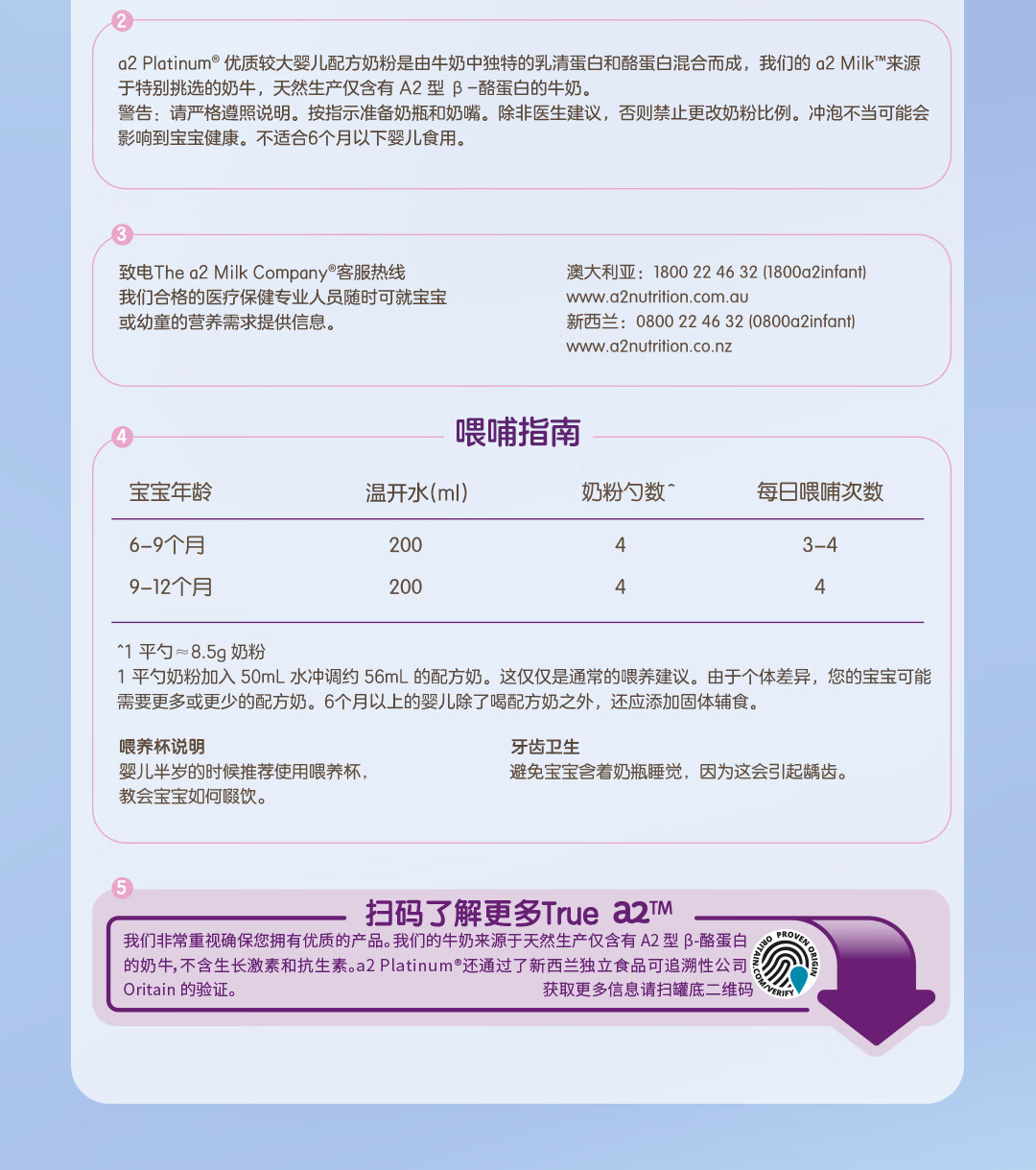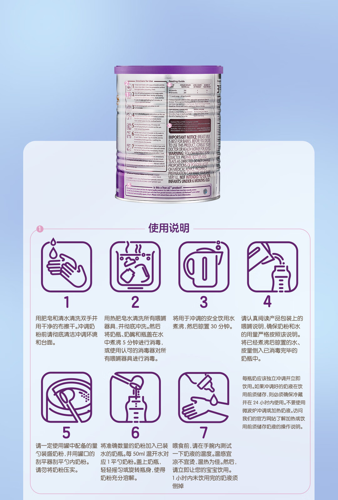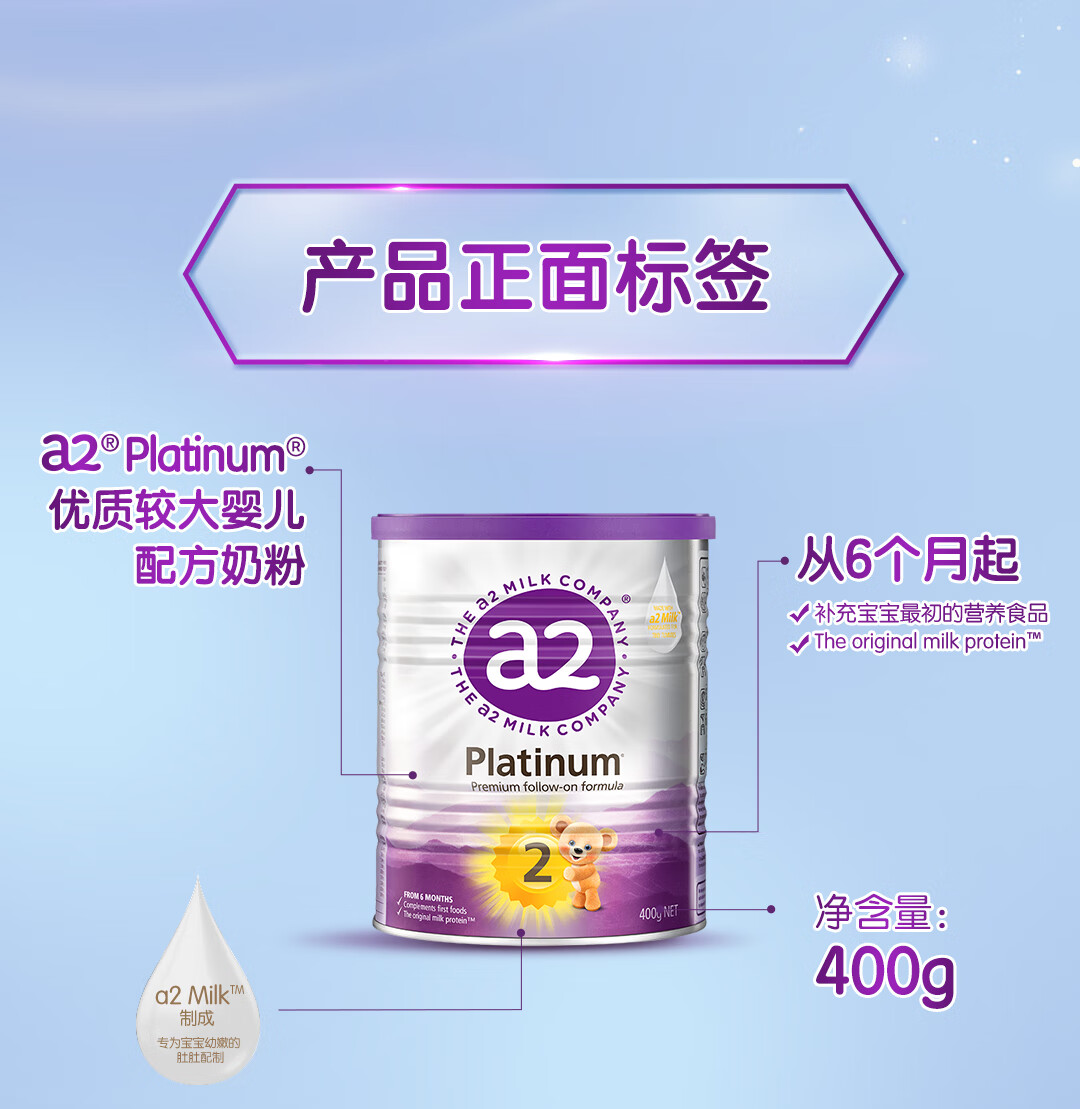 a2奶粉紫白金A2蛋白+DHA+核苷酸 婴儿配方奶粉2段400g试用装
