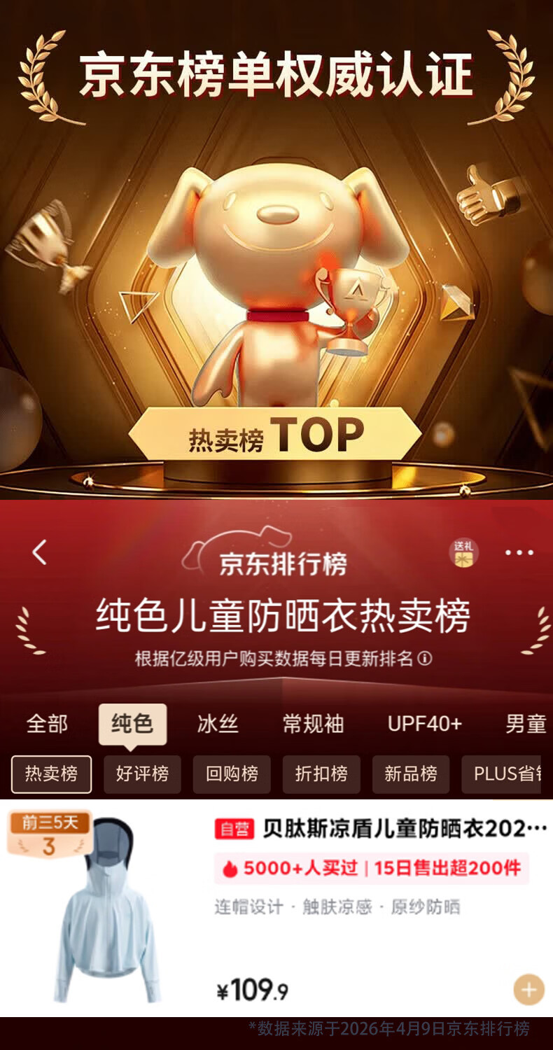 贝肽斯凉盾儿童防晒衣2026新款冰丝皮肤衣防紫外线透气男女童亲子防晒服