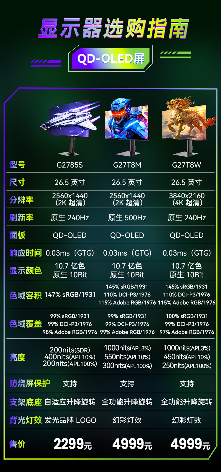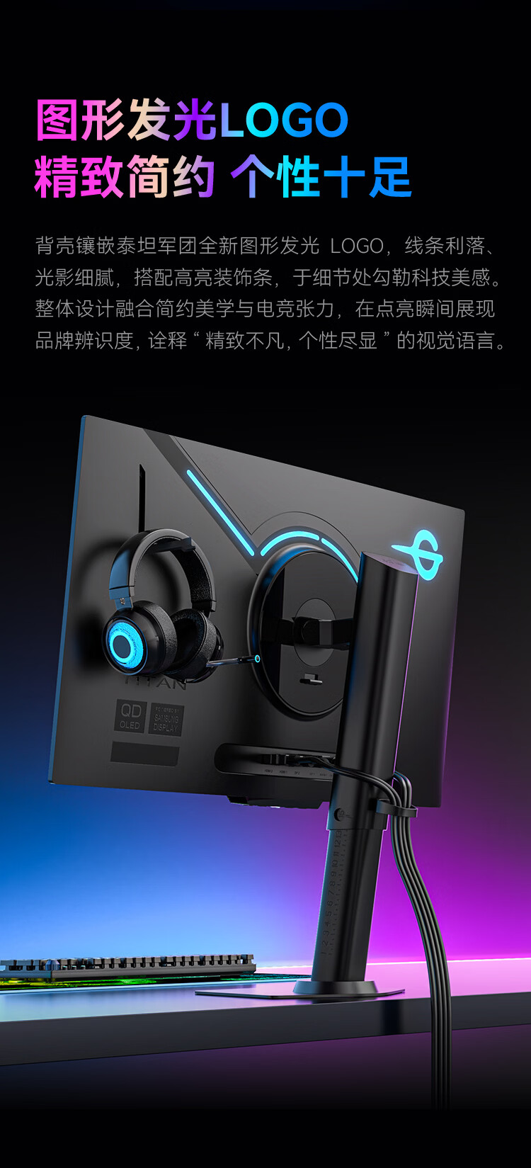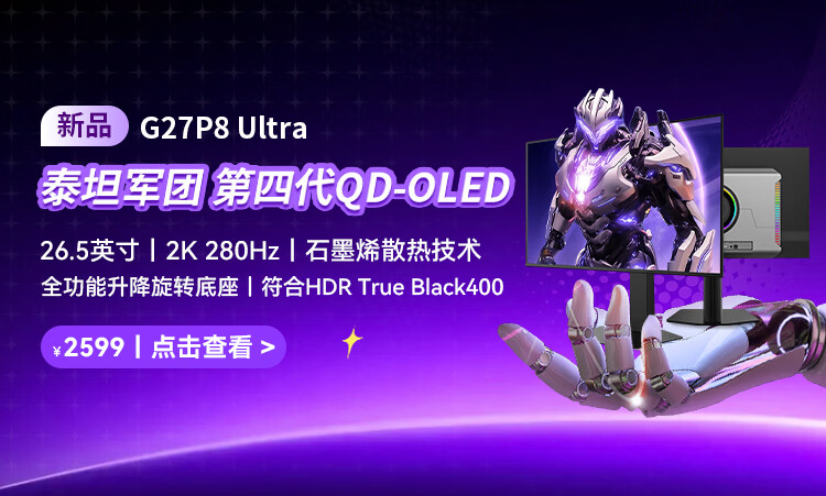泰坦军团26.5英寸 三星QD-OLED 2K 240Hz原生10bit DeltaE≤1硬件级低蓝光 升降旋转底座 元战显示器G2785S