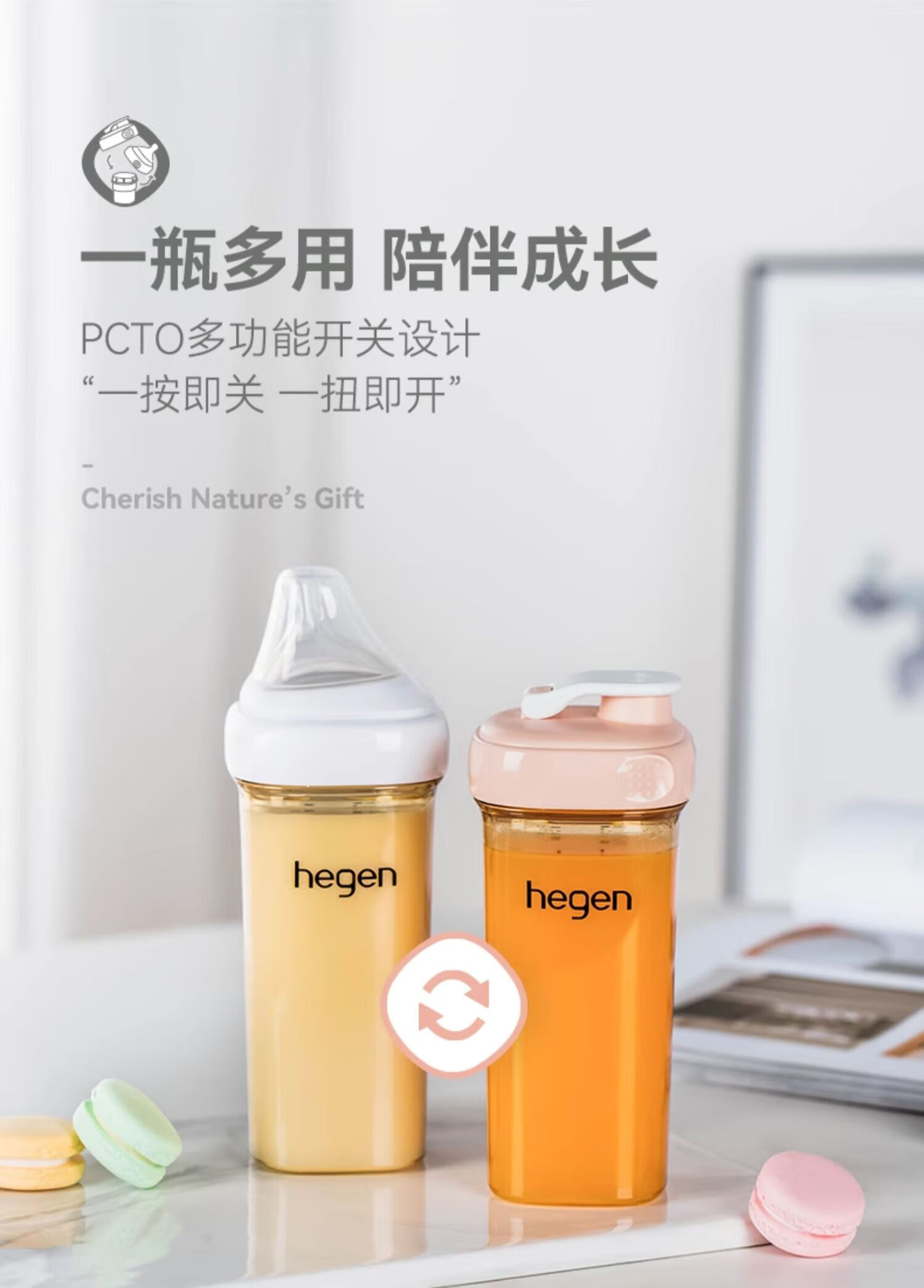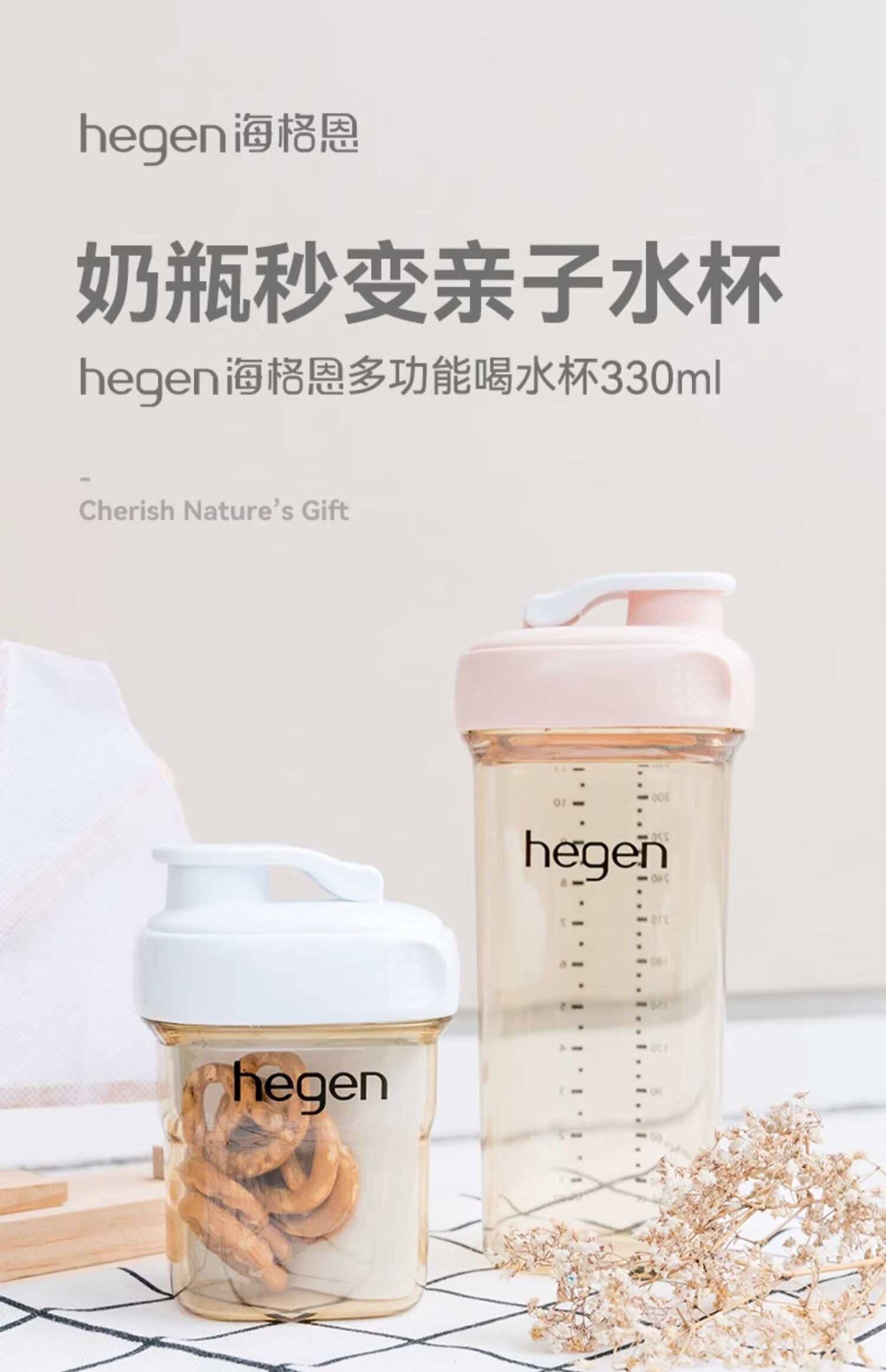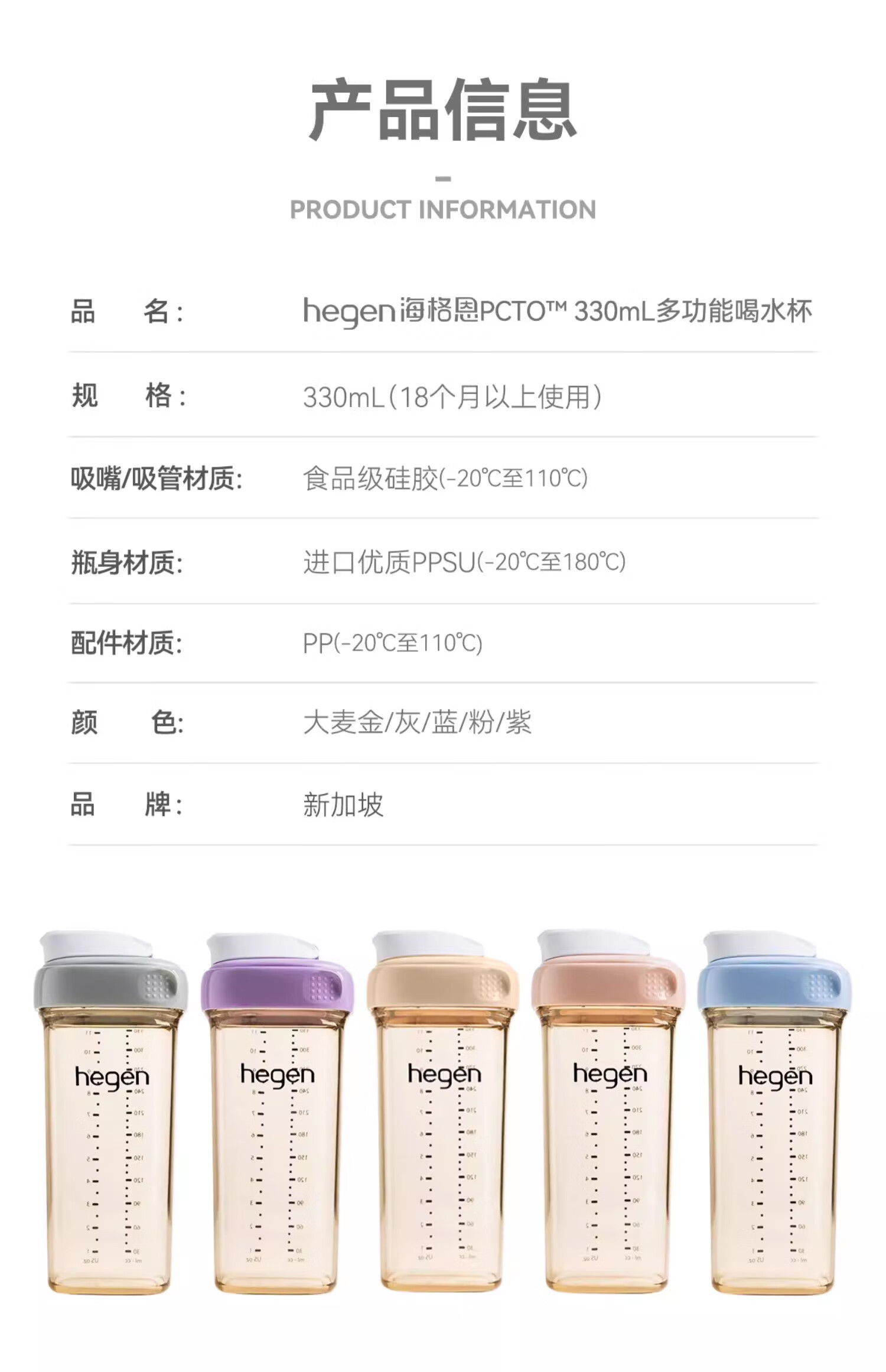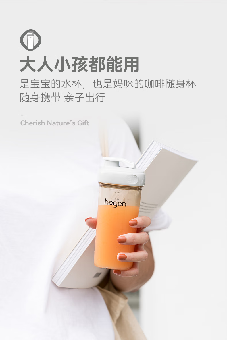 HEGEN海格恩喝水杯3-6岁330ml儿童PPSU一体化多功能直饮水杯大麦金色