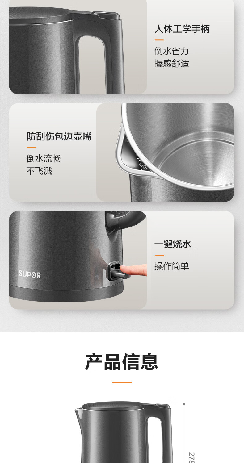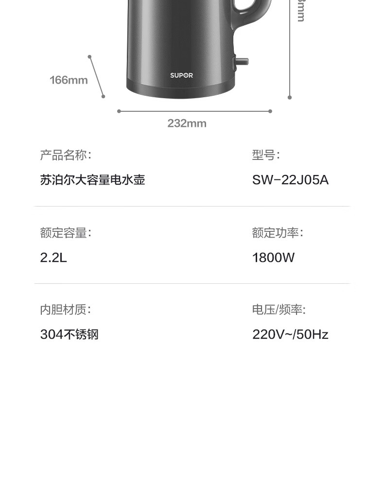 苏泊尔(SUPOR)热水壶 烧水壶自动断电 无缝一体 2.2L大容量 304不锈钢电水壶 速沸 家用电热烧水壶 SW-22J05A