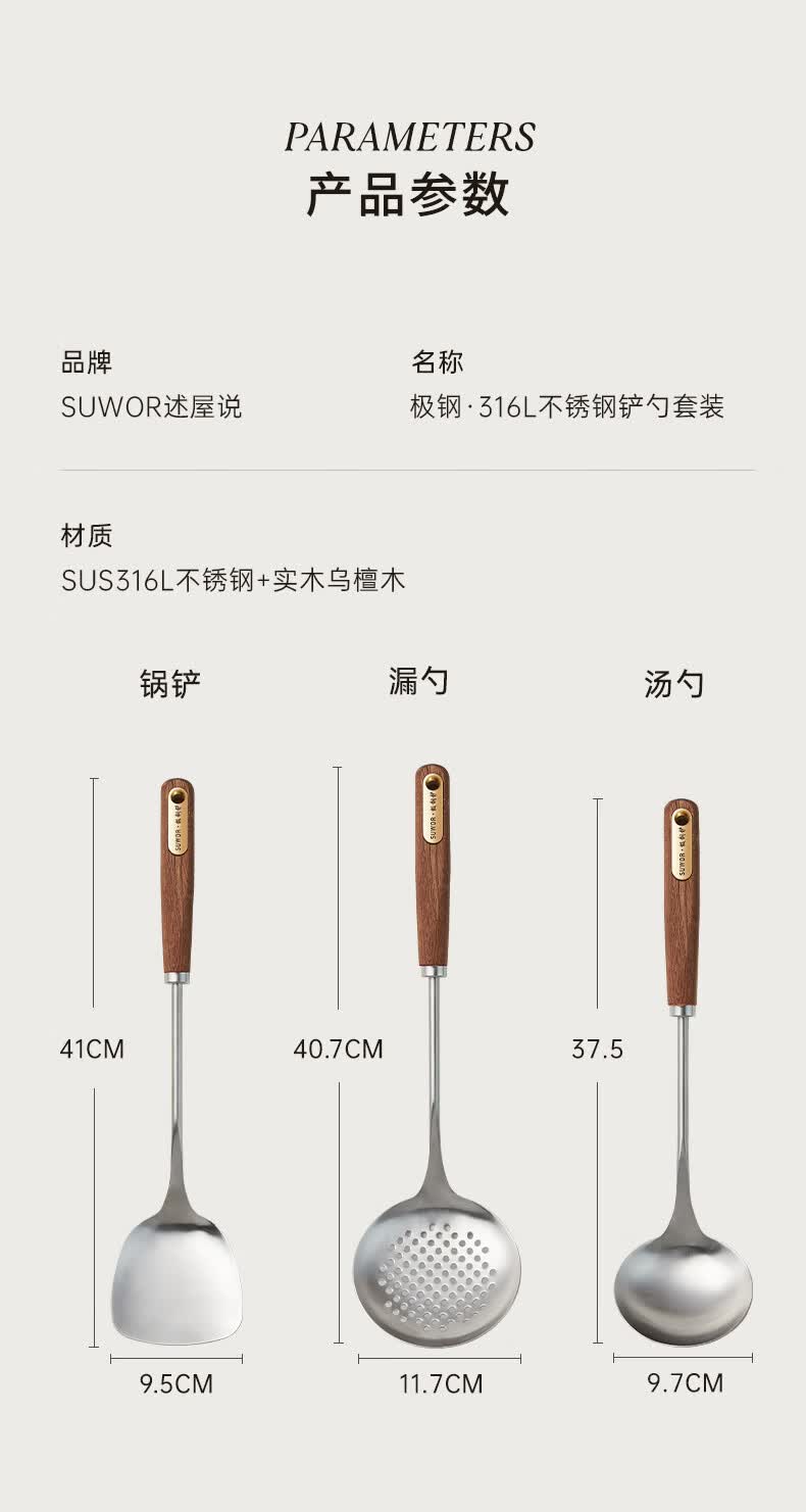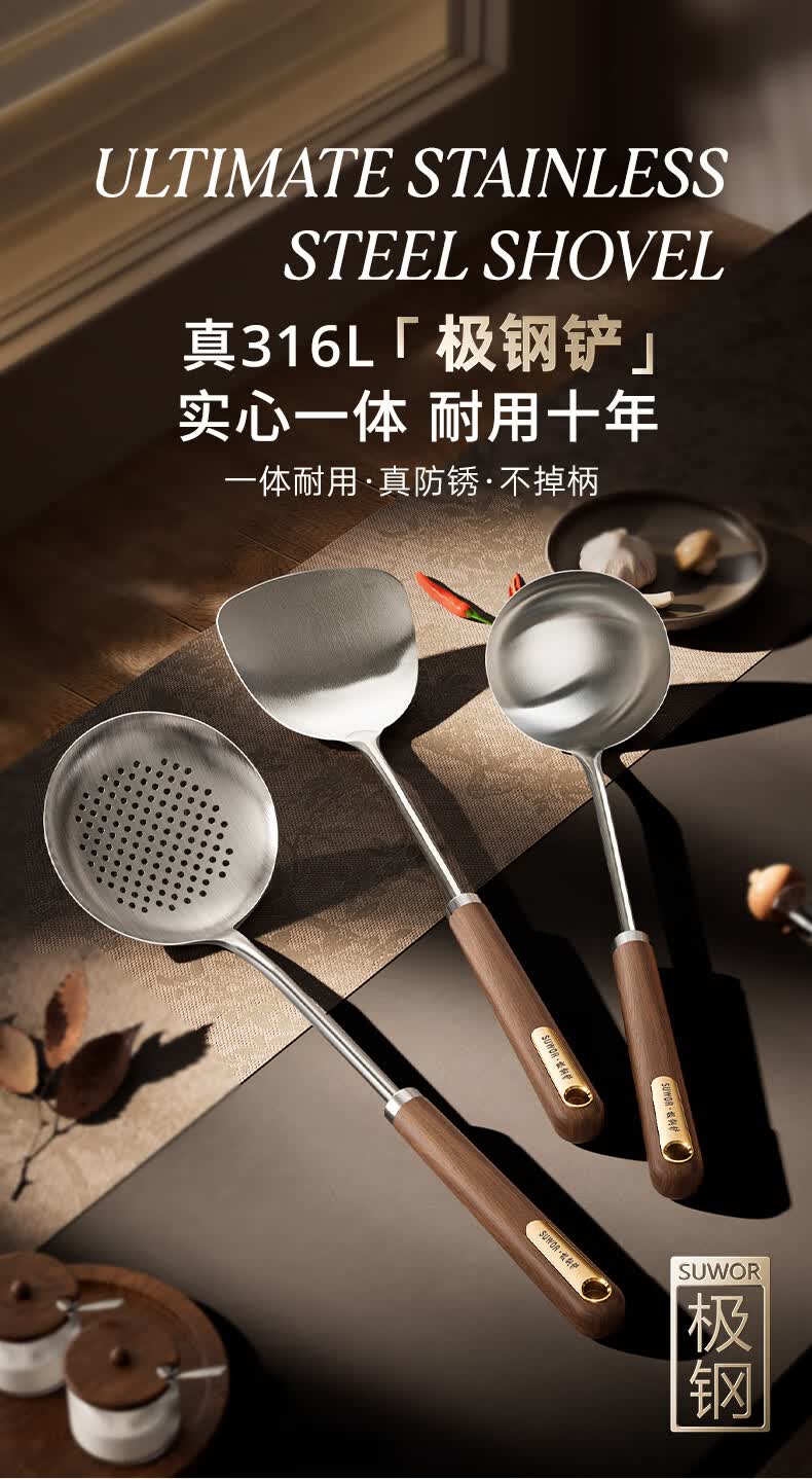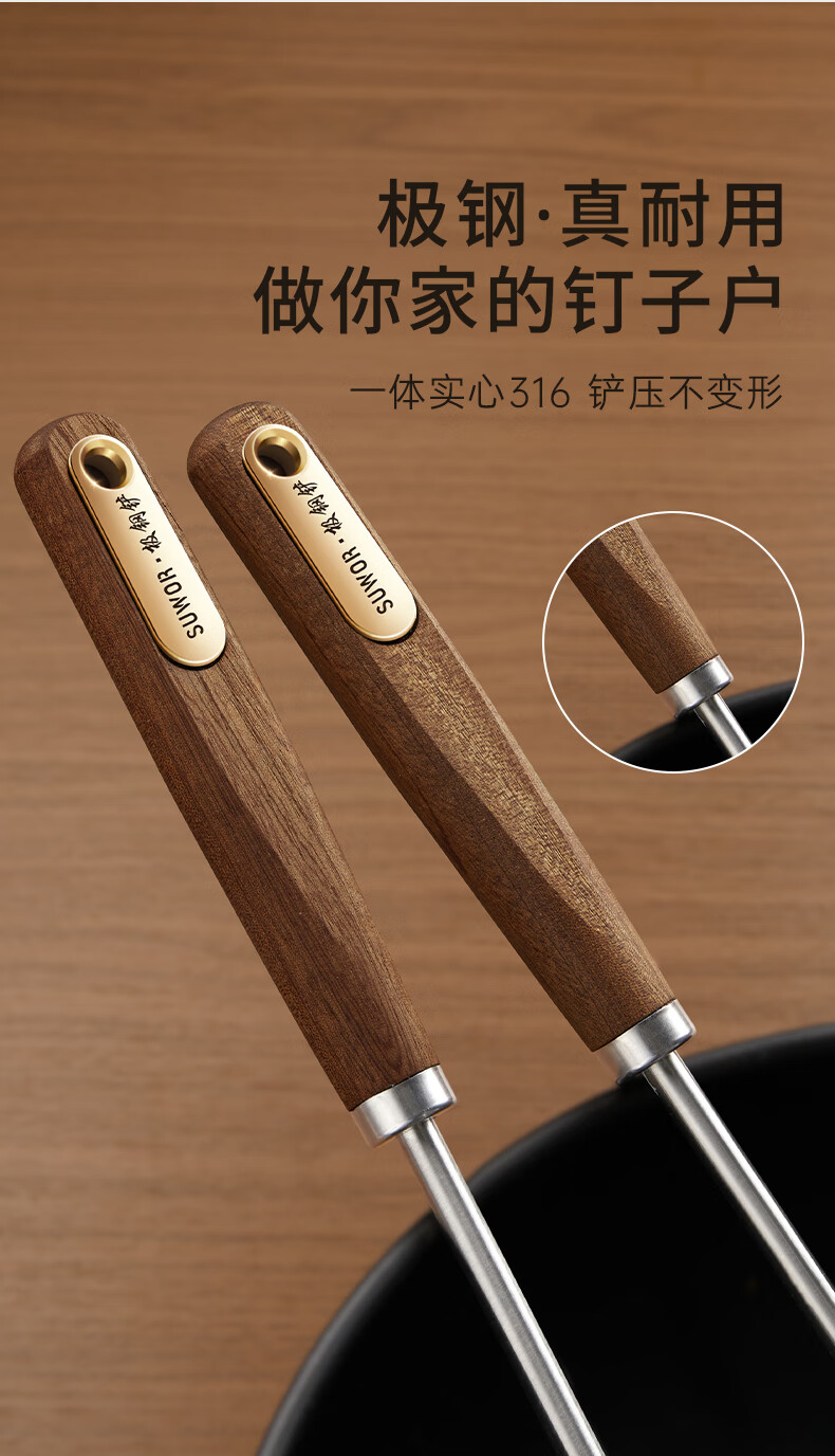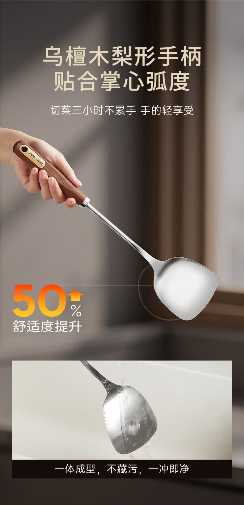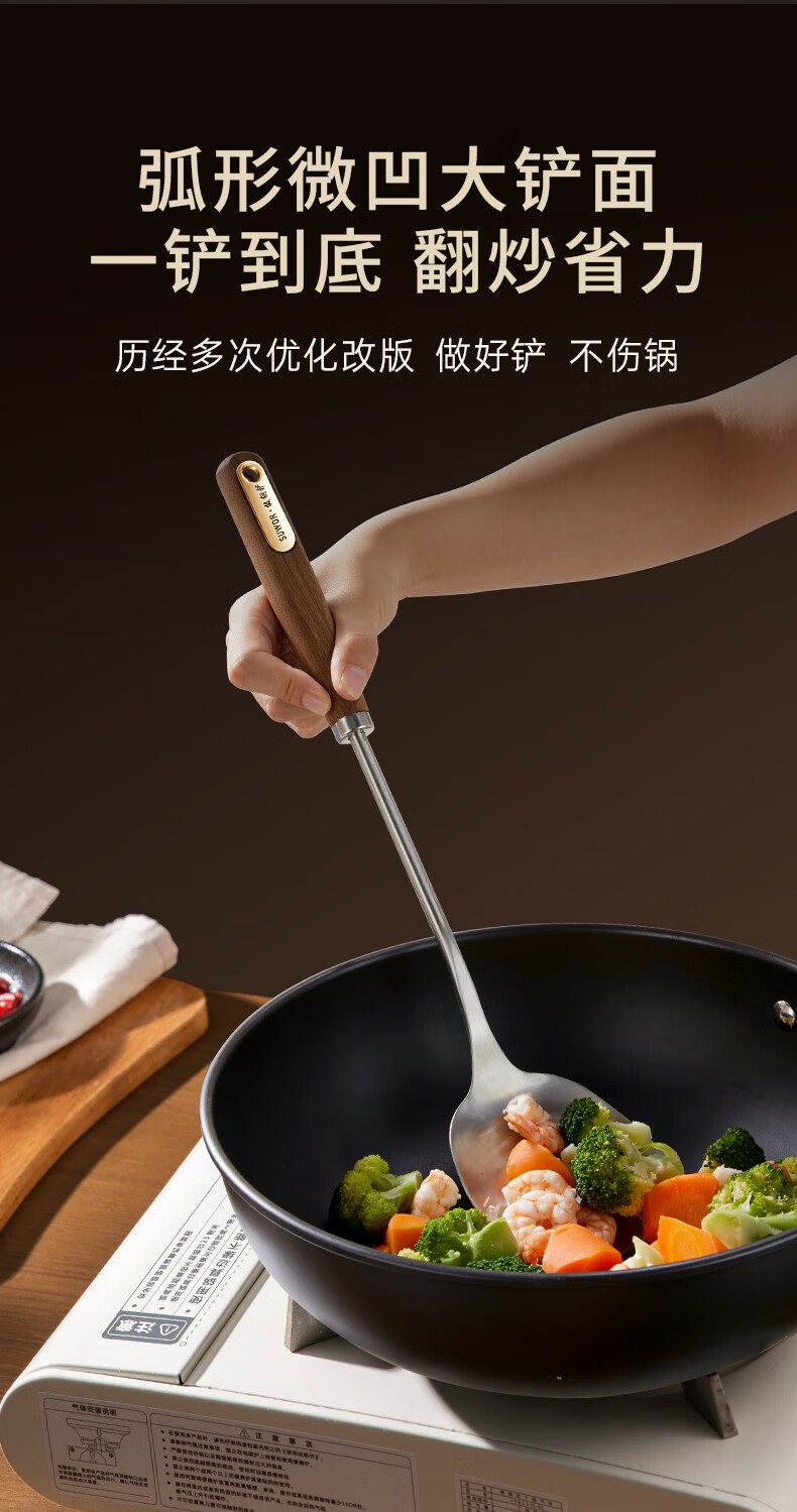 述屋说316L不锈钢锅铲加厚一体成型极钢炒菜铲乌檀木柄铁锅专用铲子防烫