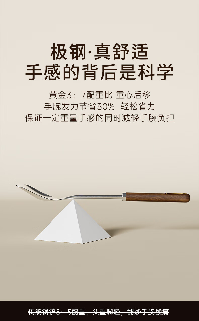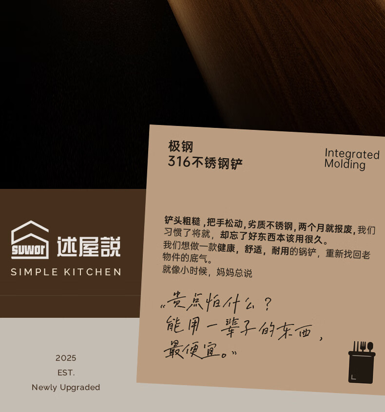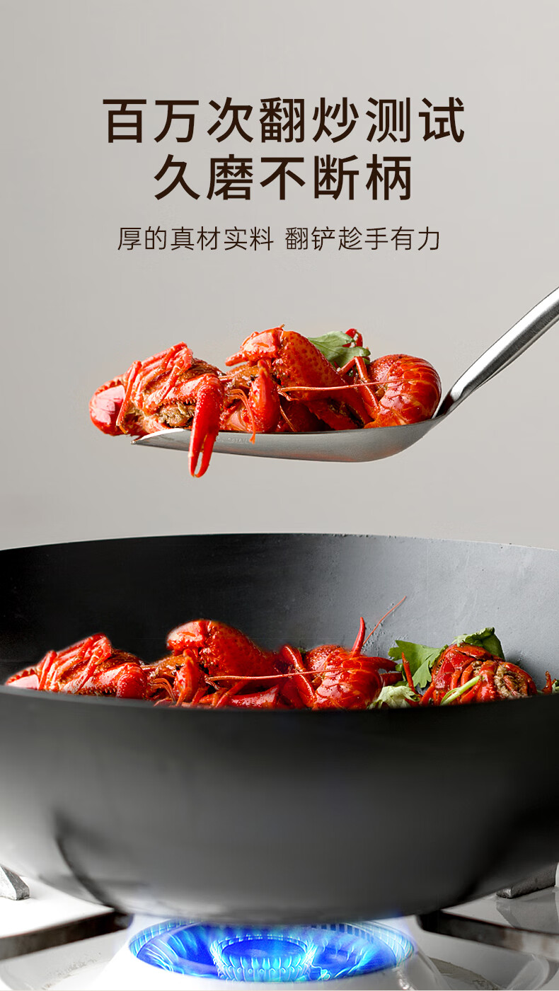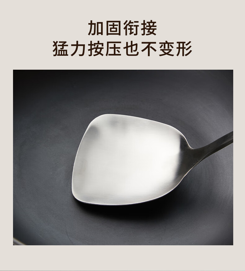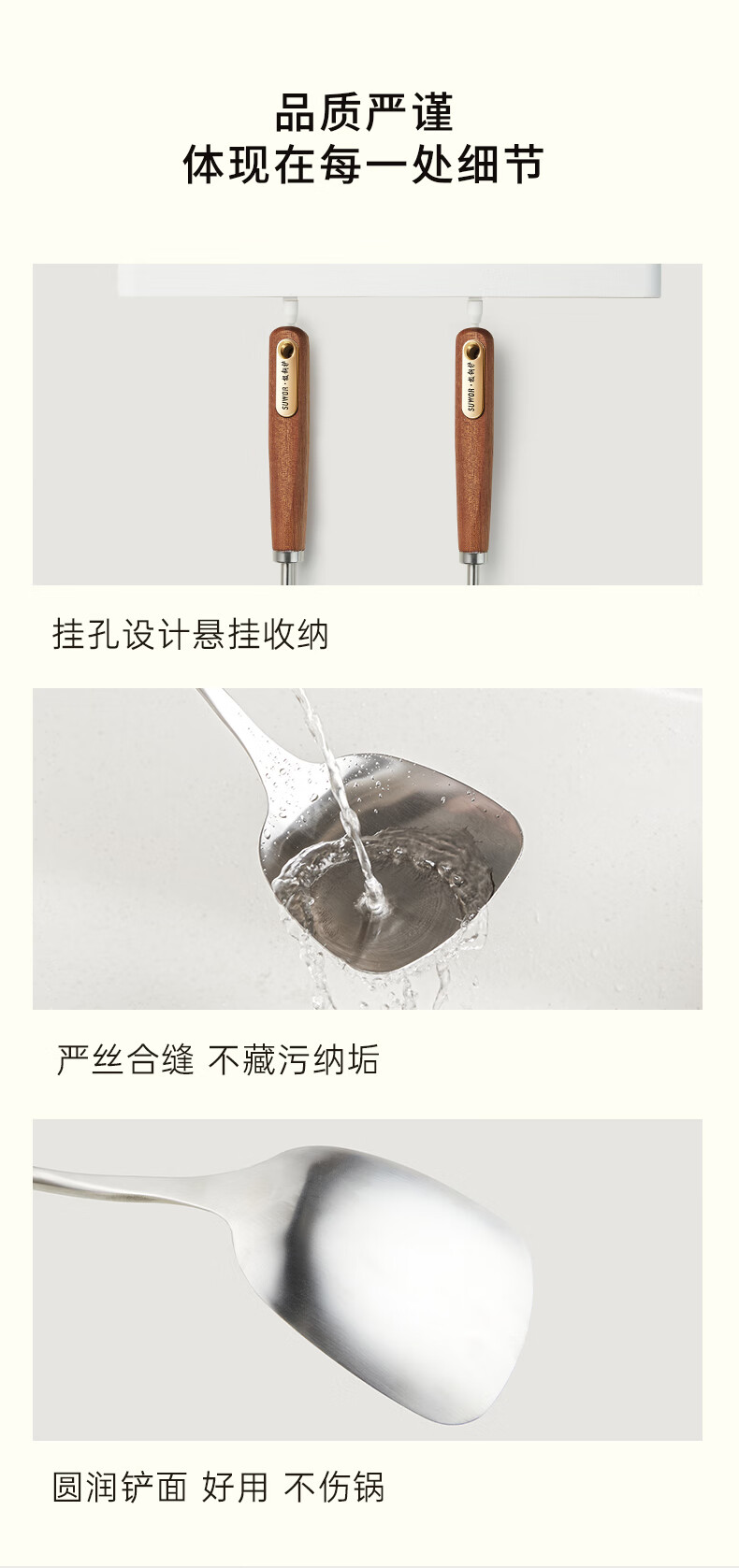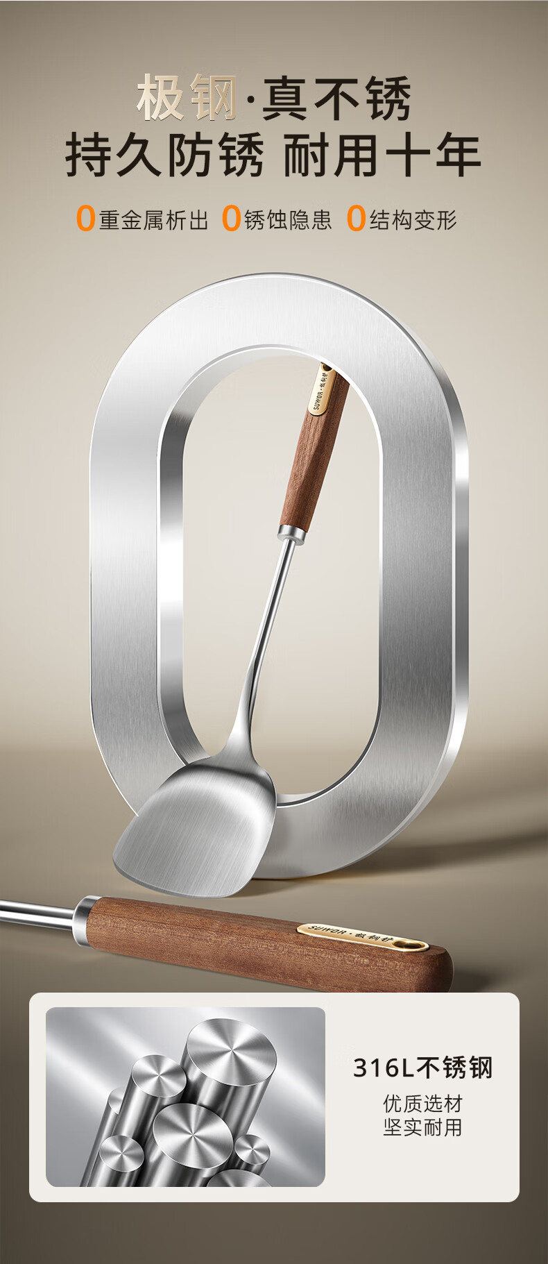 述屋说316L不锈钢锅铲加厚一体成型极钢炒菜铲乌檀木柄铁锅专用铲子防烫