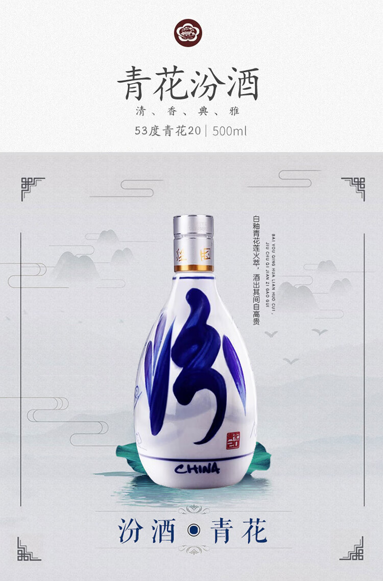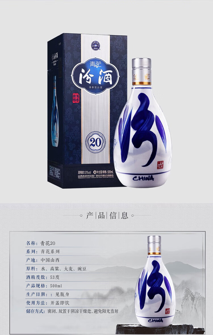 汾酒山西杏花村汾酒青花20清香型白酒【喜宴专享】 汾酒青花20-53度500ml*2瓶(加赠礼袋)