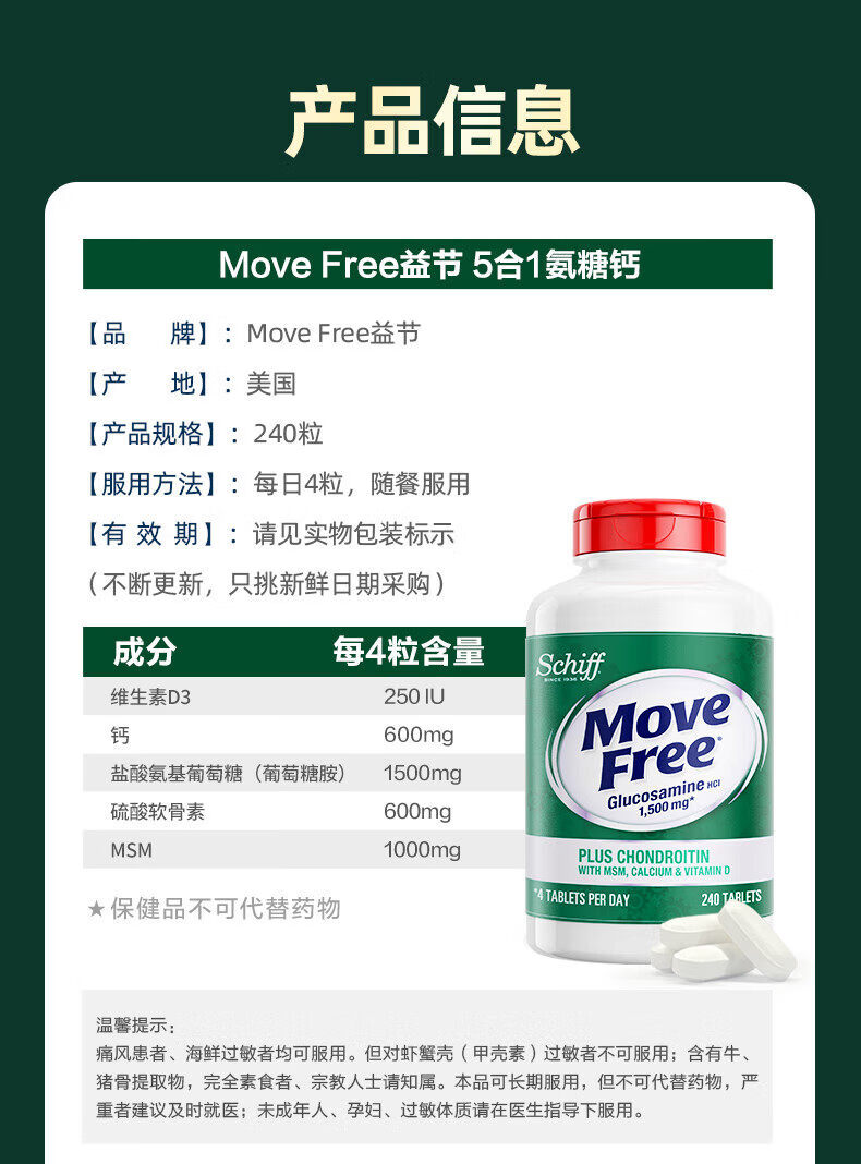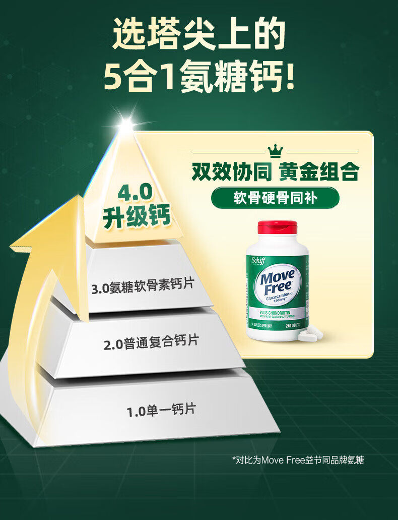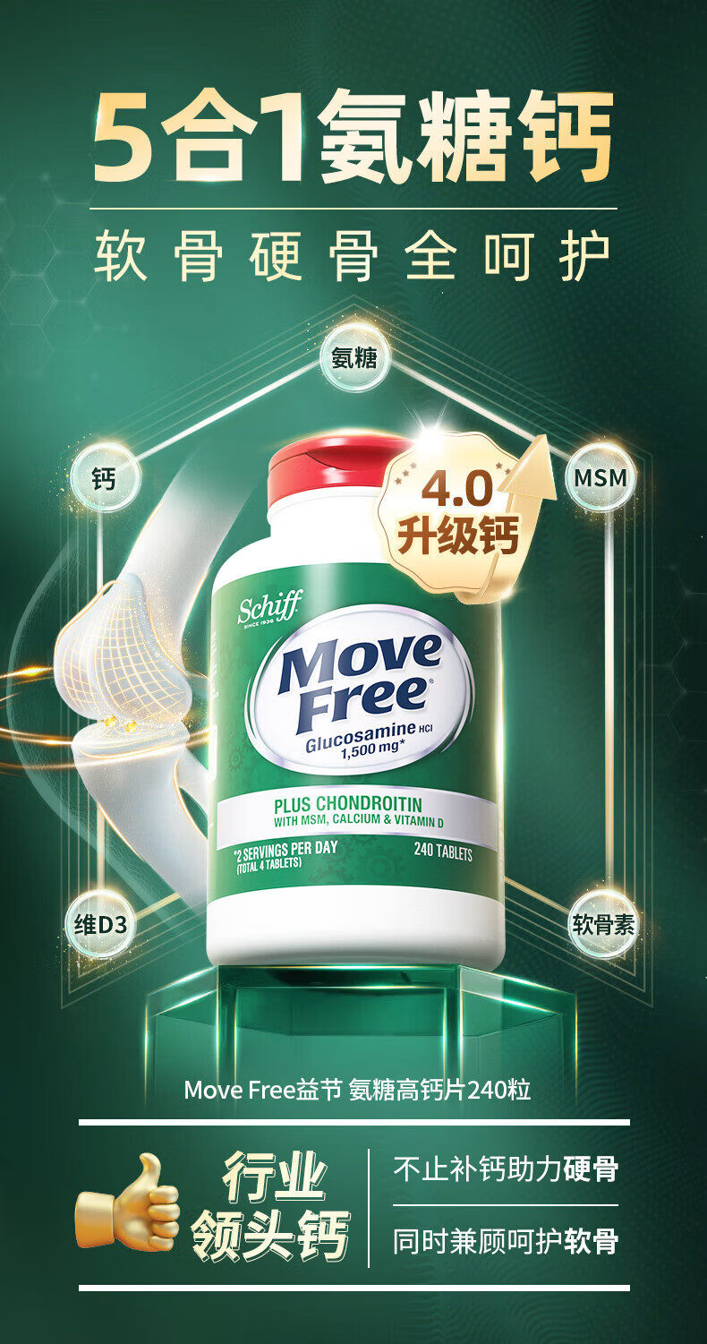 旭福益节美国MoveFree维骨力氨糖软骨素高钙片中老年护关 高钙氨糖240粒 补钙新升级高钙氨糖 240粒*3瓶