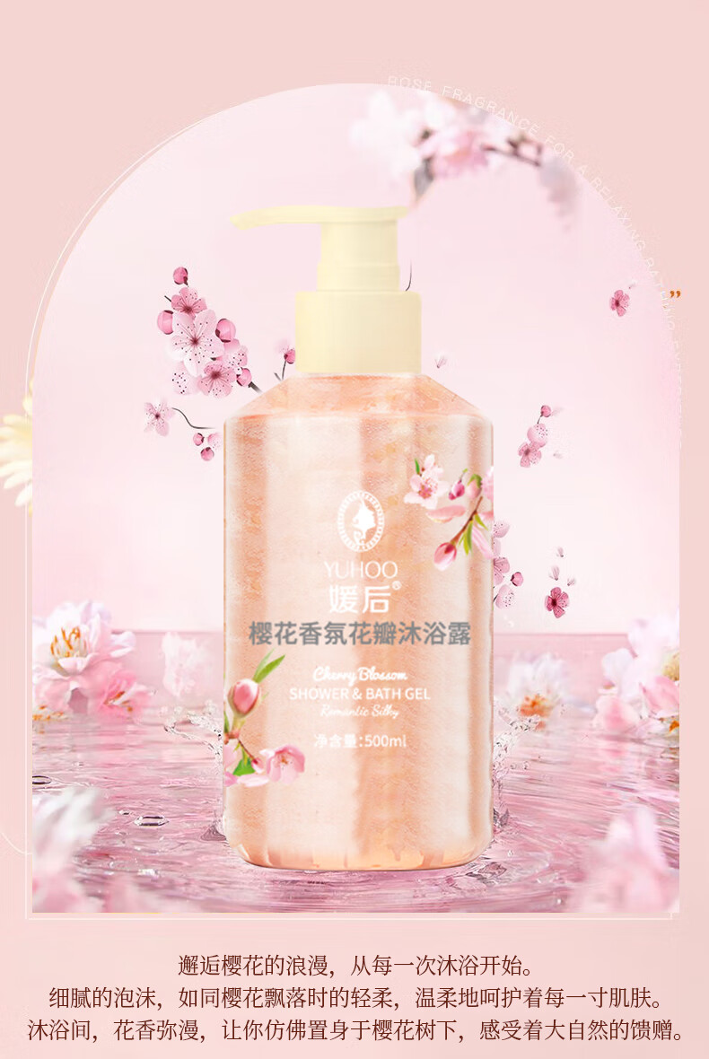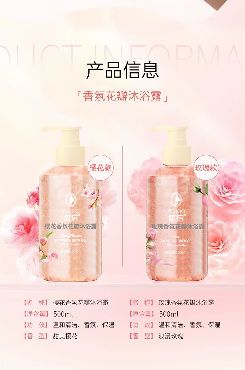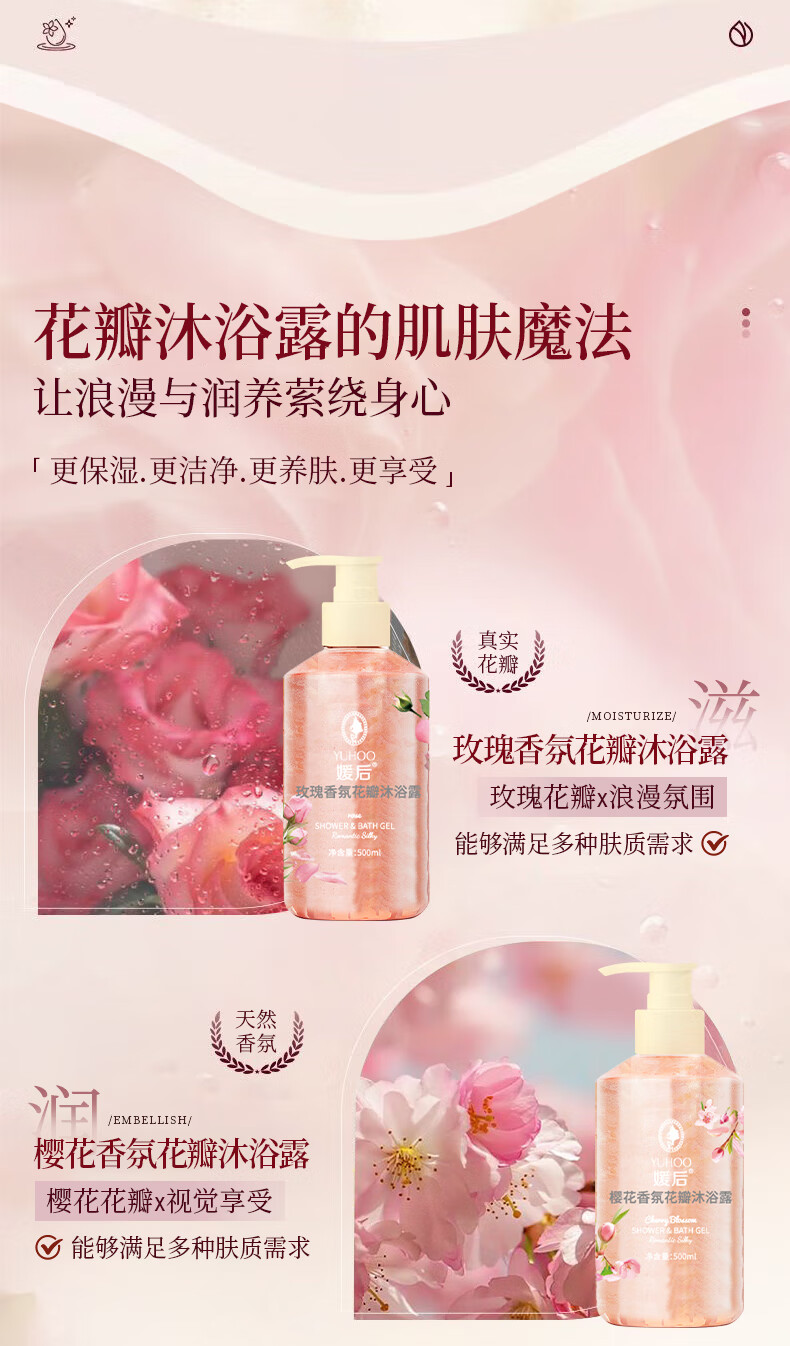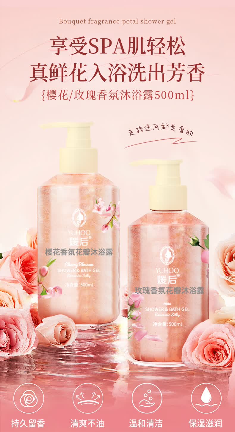 媛后花瓣香氛沐浴露持久留香滋润保湿樱花玫瑰香味乳液男女通用沐浴液 【2瓶装】樱花+玫瑰各1瓶