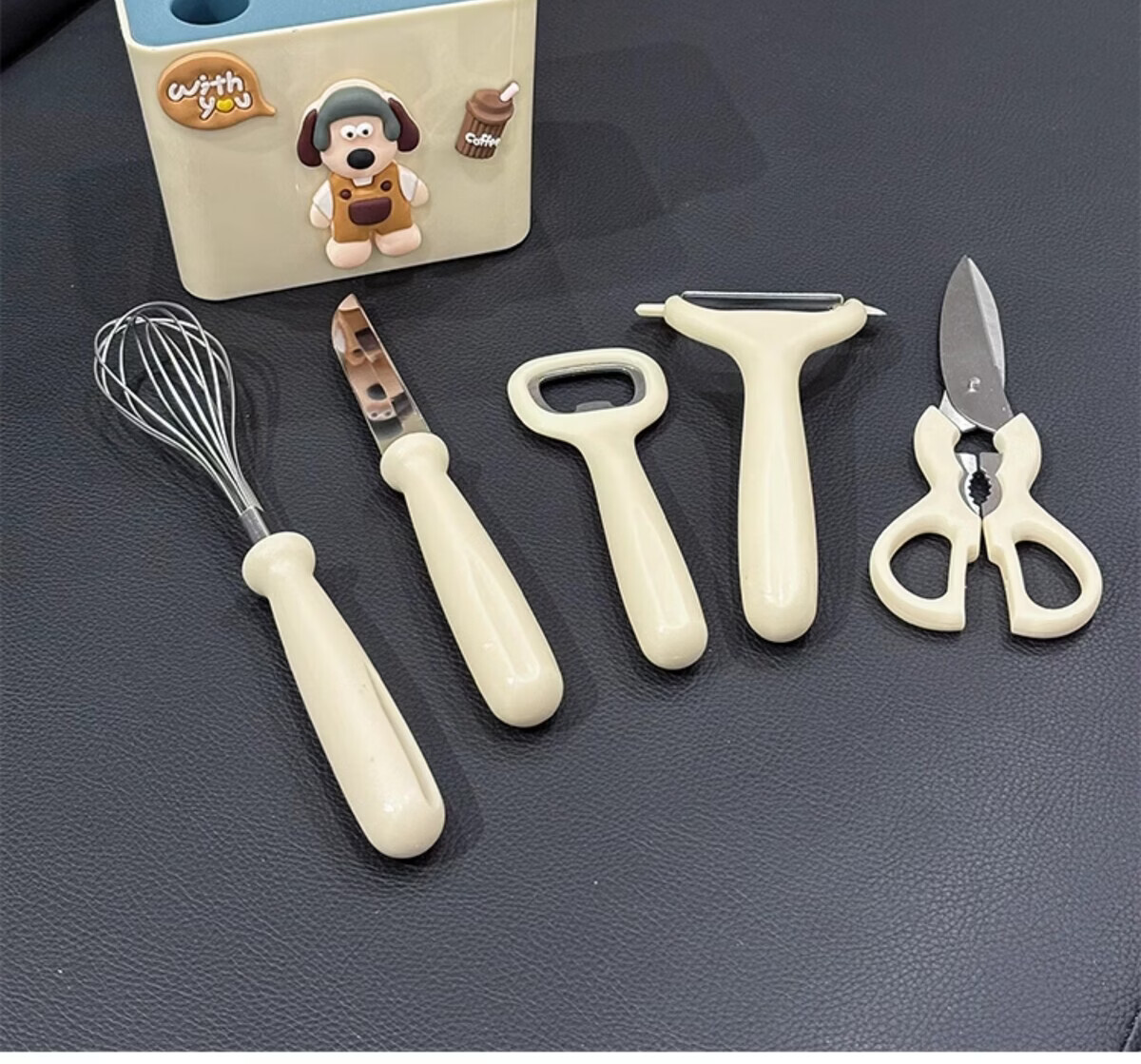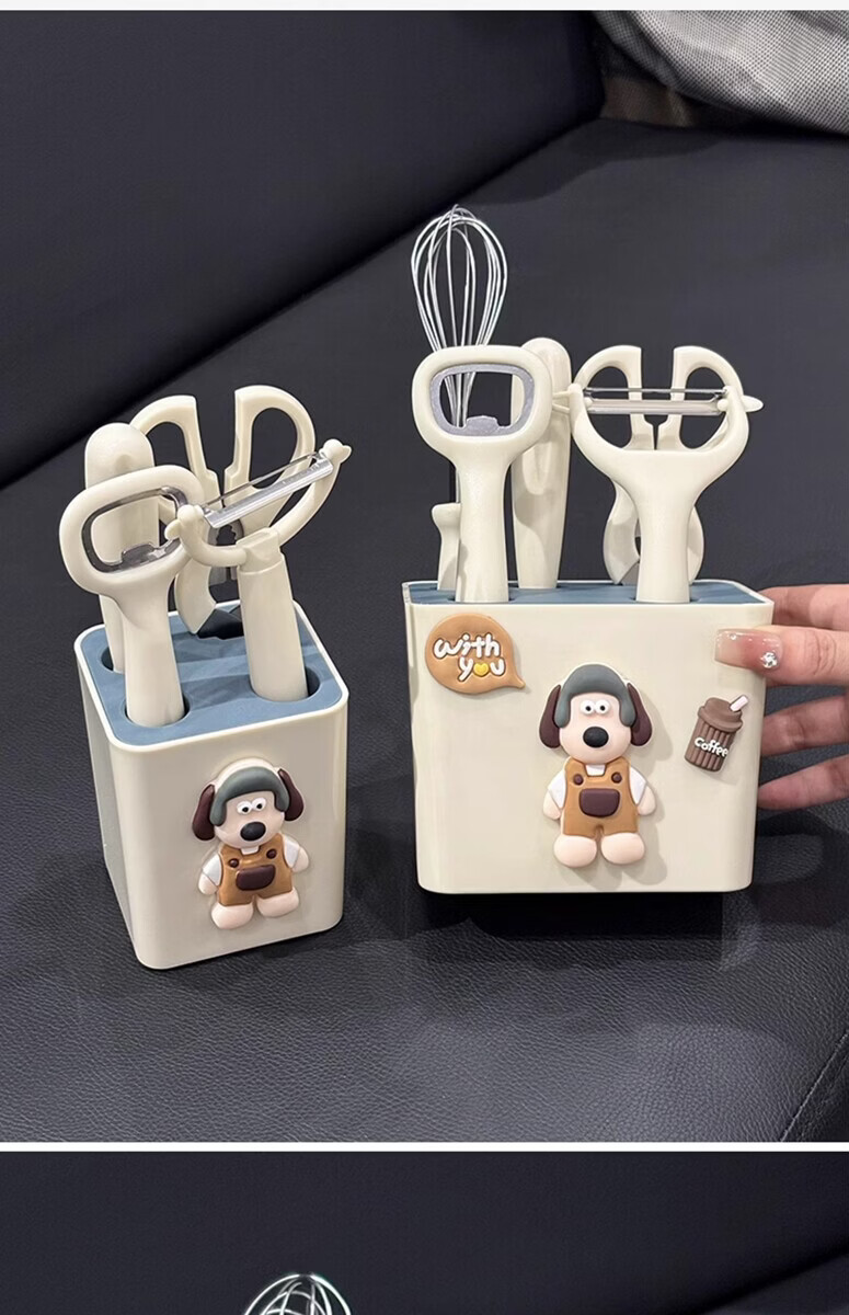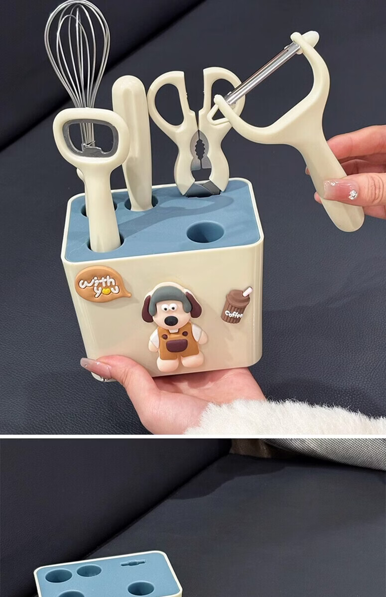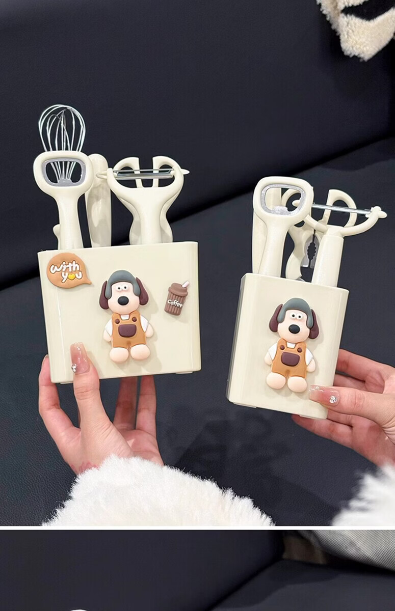 溥畔厨房小工具套装不锈钢水果刀削皮刀打蛋器剪刀开瓶器组合家用收纳 小狗厨房5件套[可沥水收纳盒] 1