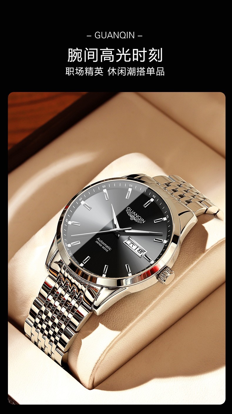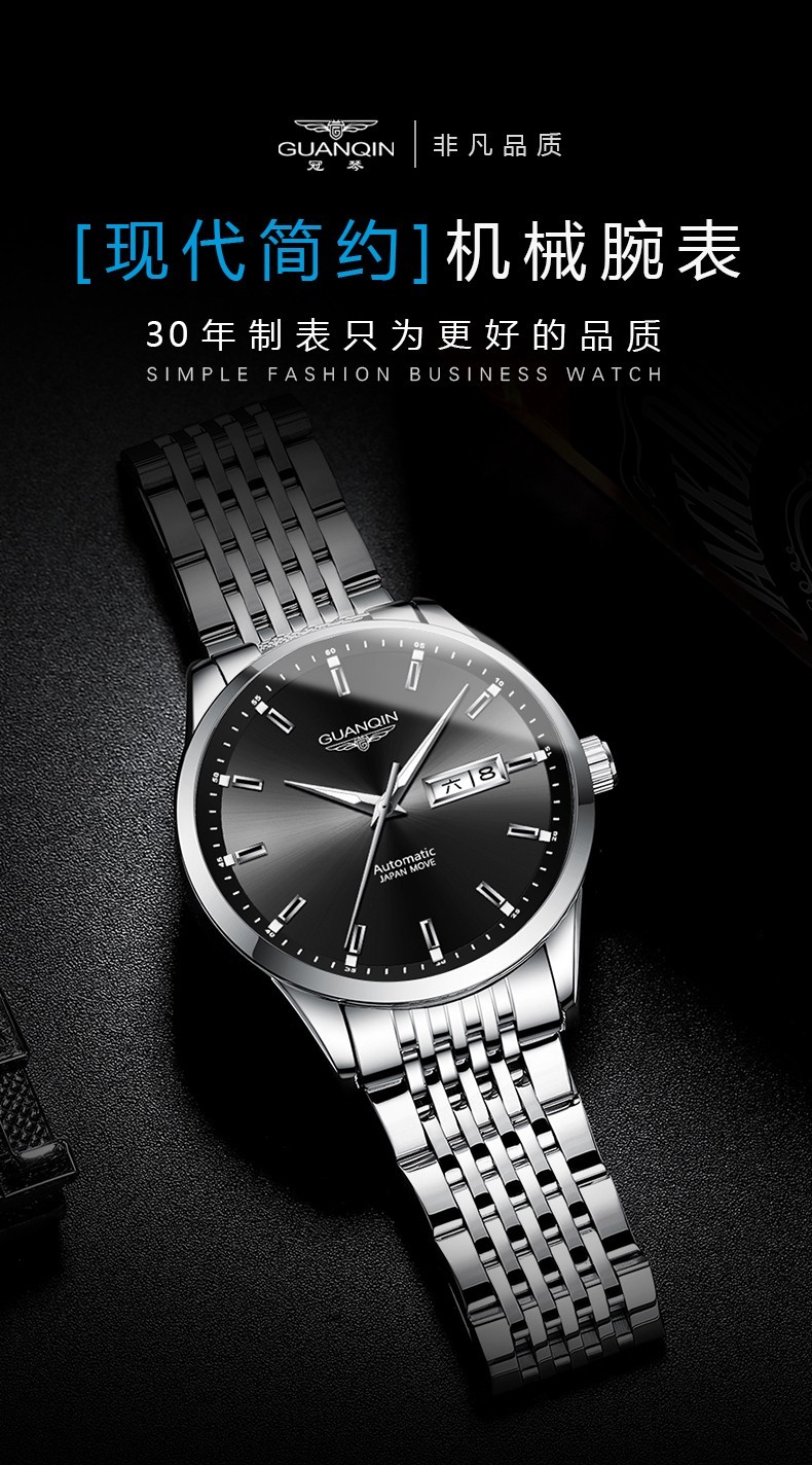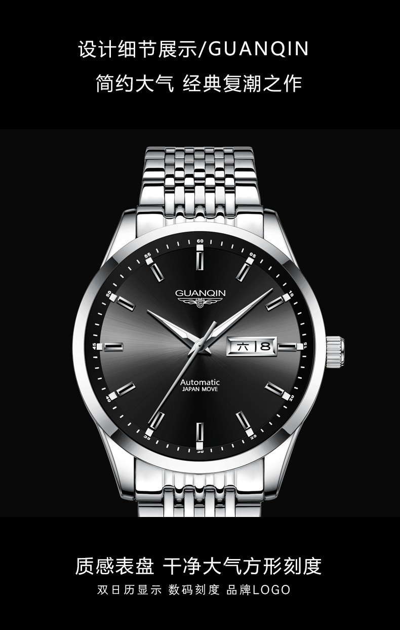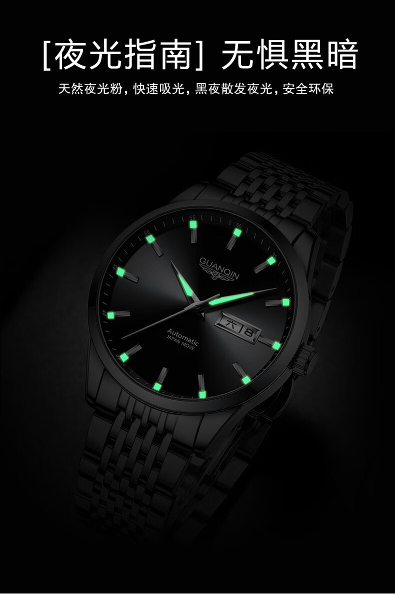 冠琴(GUANQIN)十大品牌手表男士进口机芯全自动机械表双日历夜光防水男表 全黑蓝面【进口机芯】16217