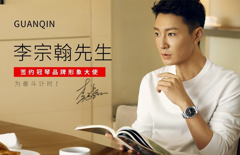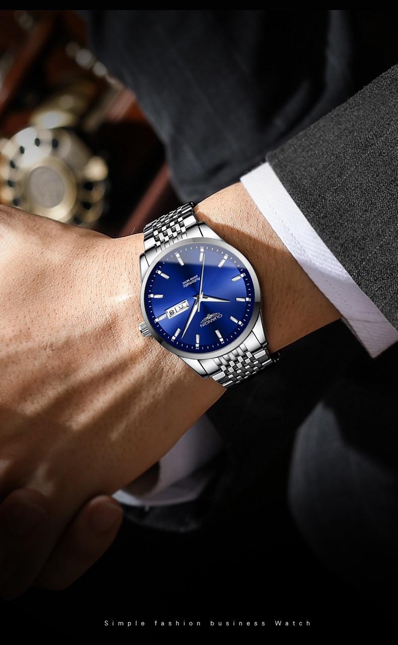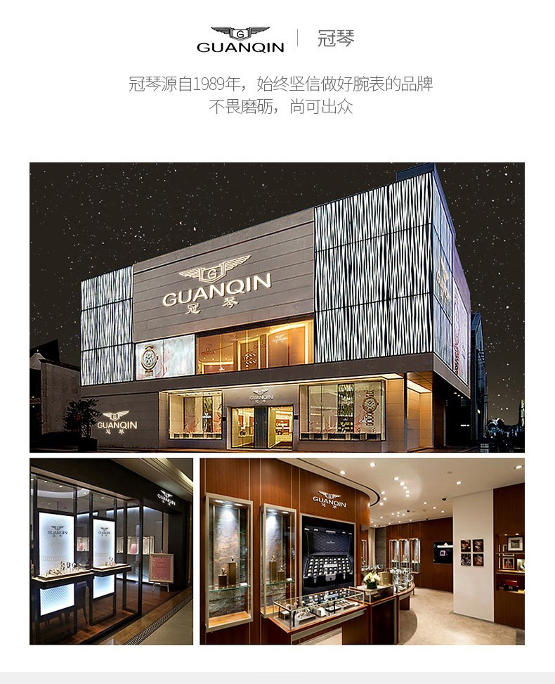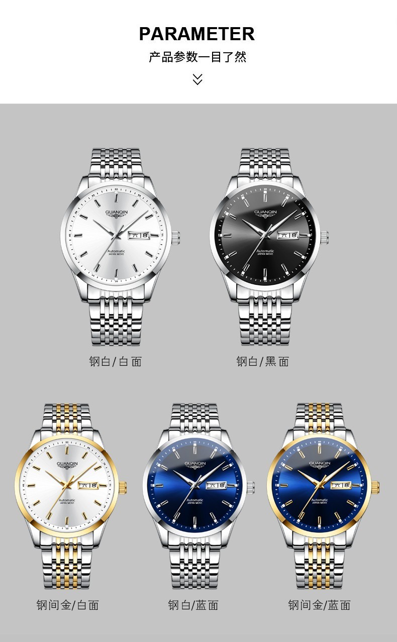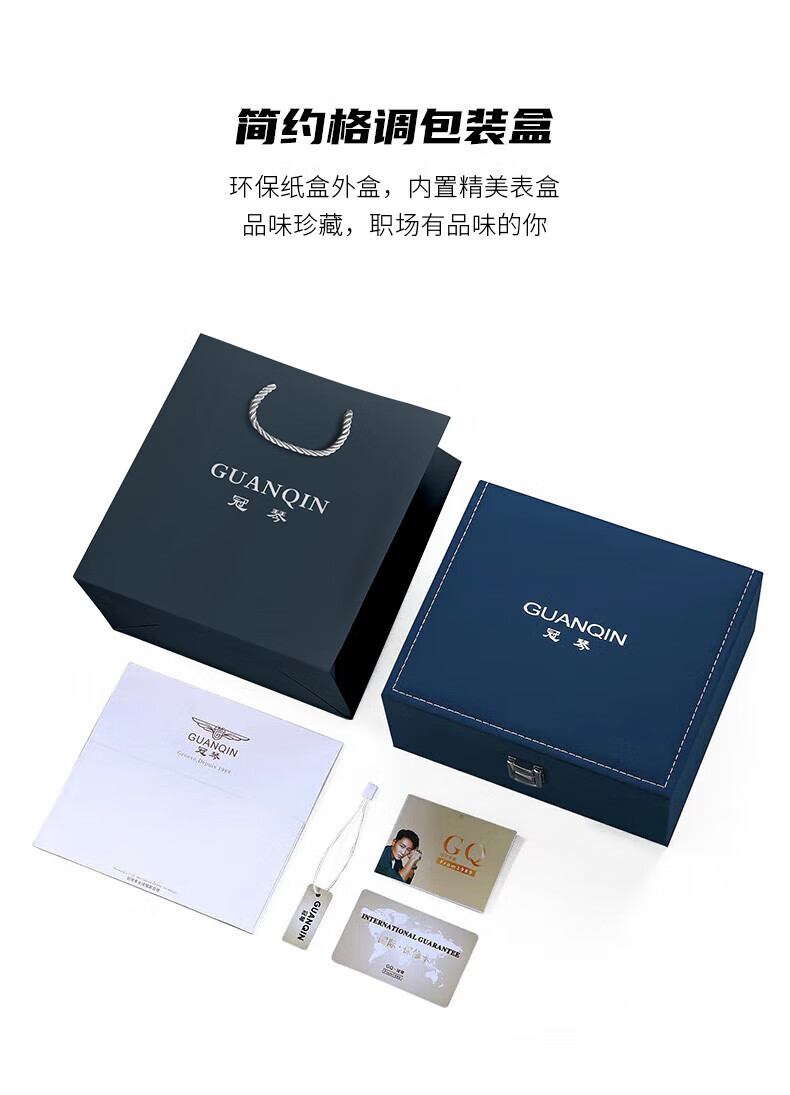 冠琴(GUANQIN)十大品牌手表男士进口机芯全自动机械表双日历夜光防水男表 全黑蓝面【进口机芯】16217