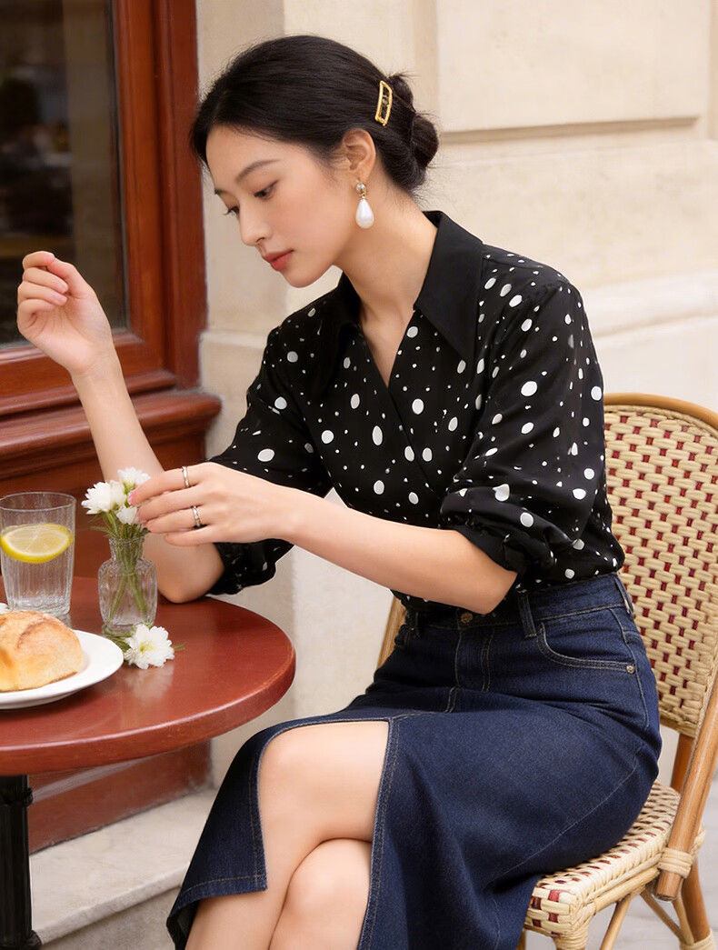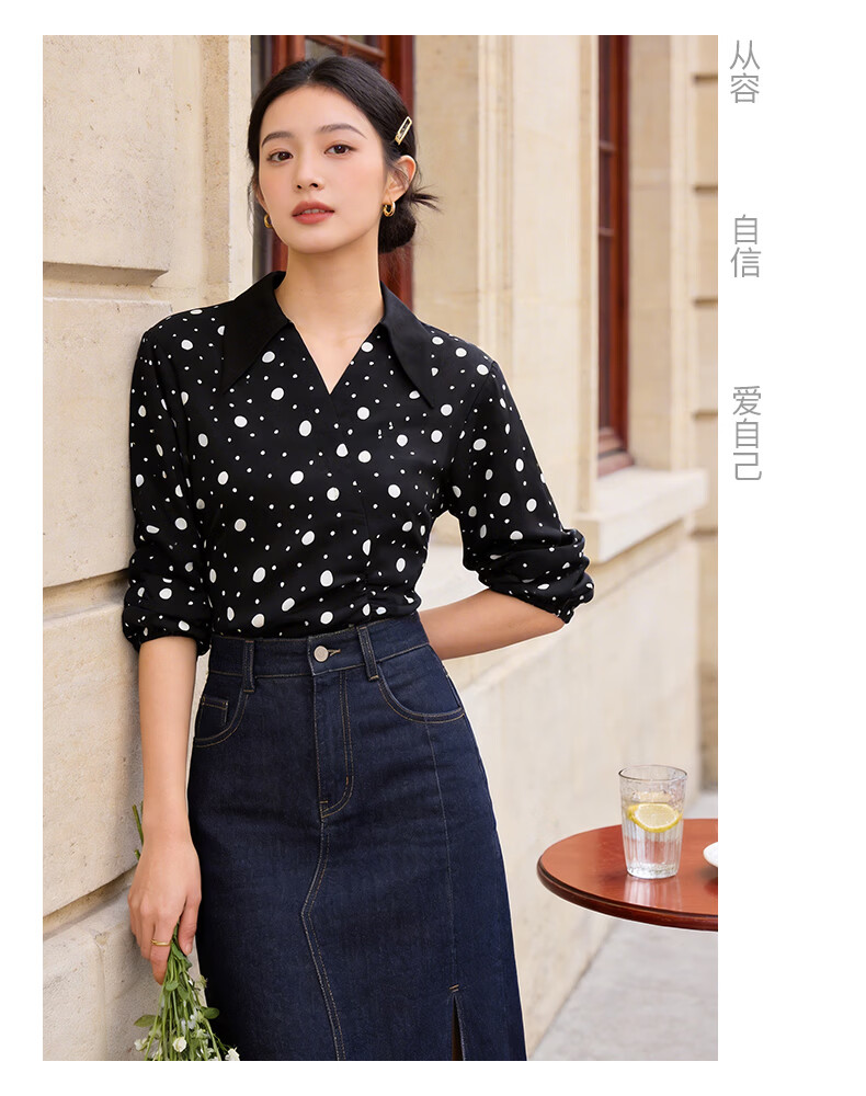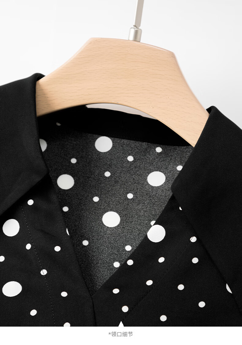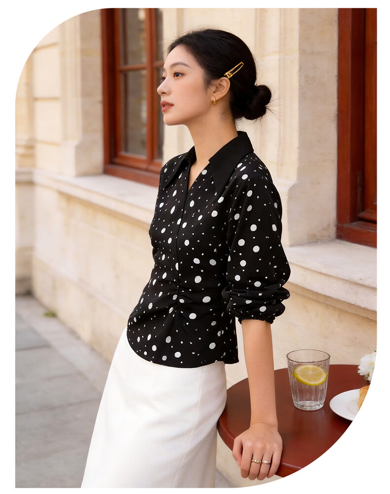 晚白2026年春款经典复古波点翻领上衣轻薄垂顺利落通勤设计感衬衫女 黑色 L