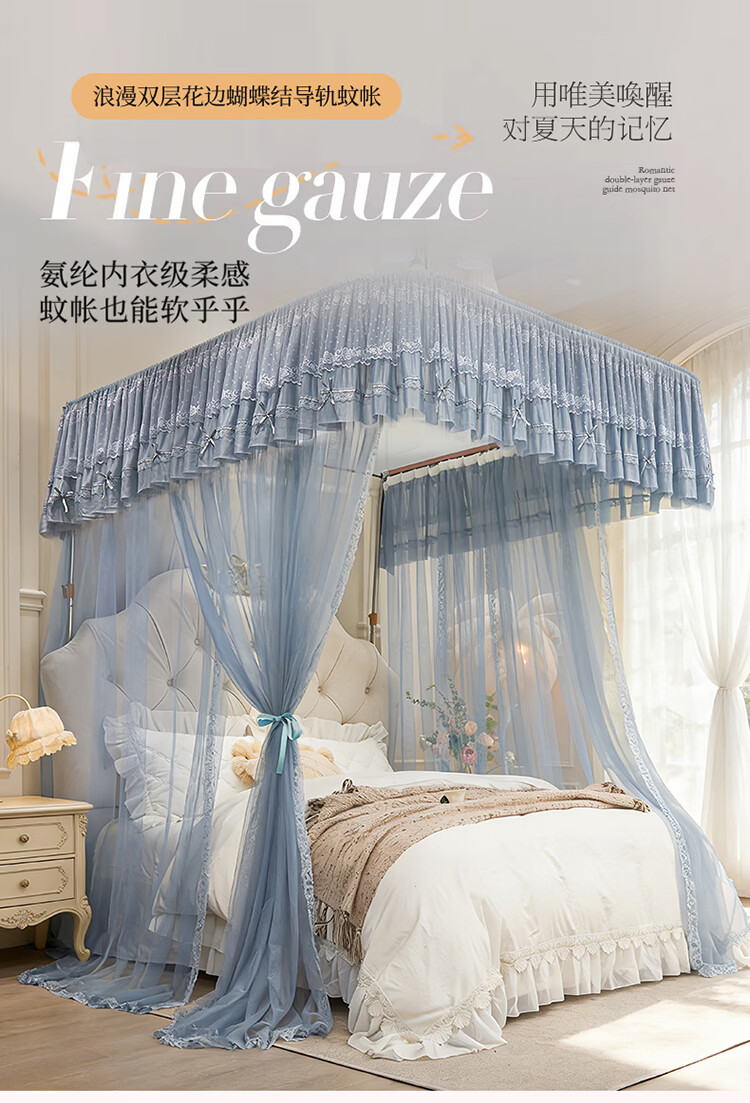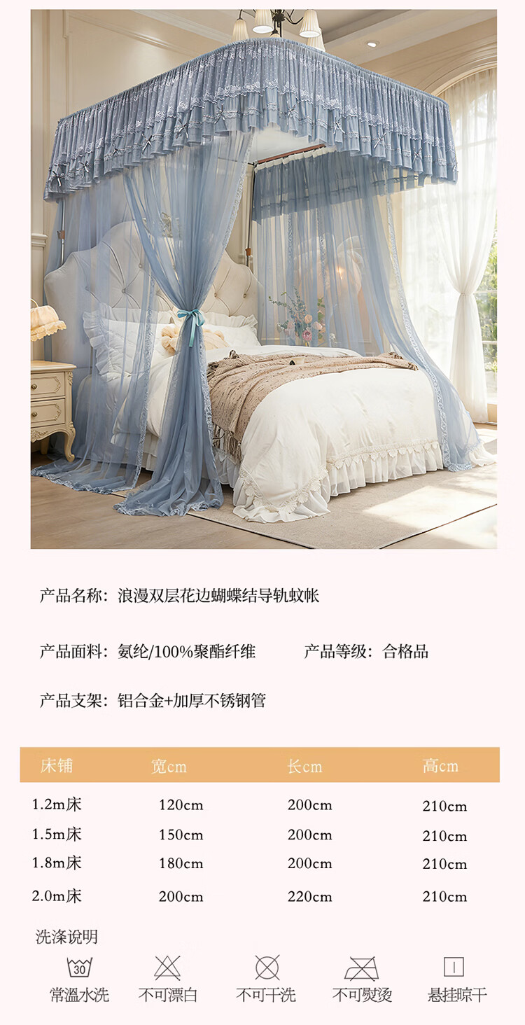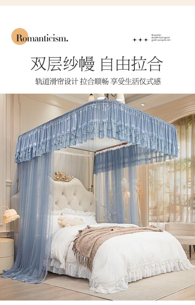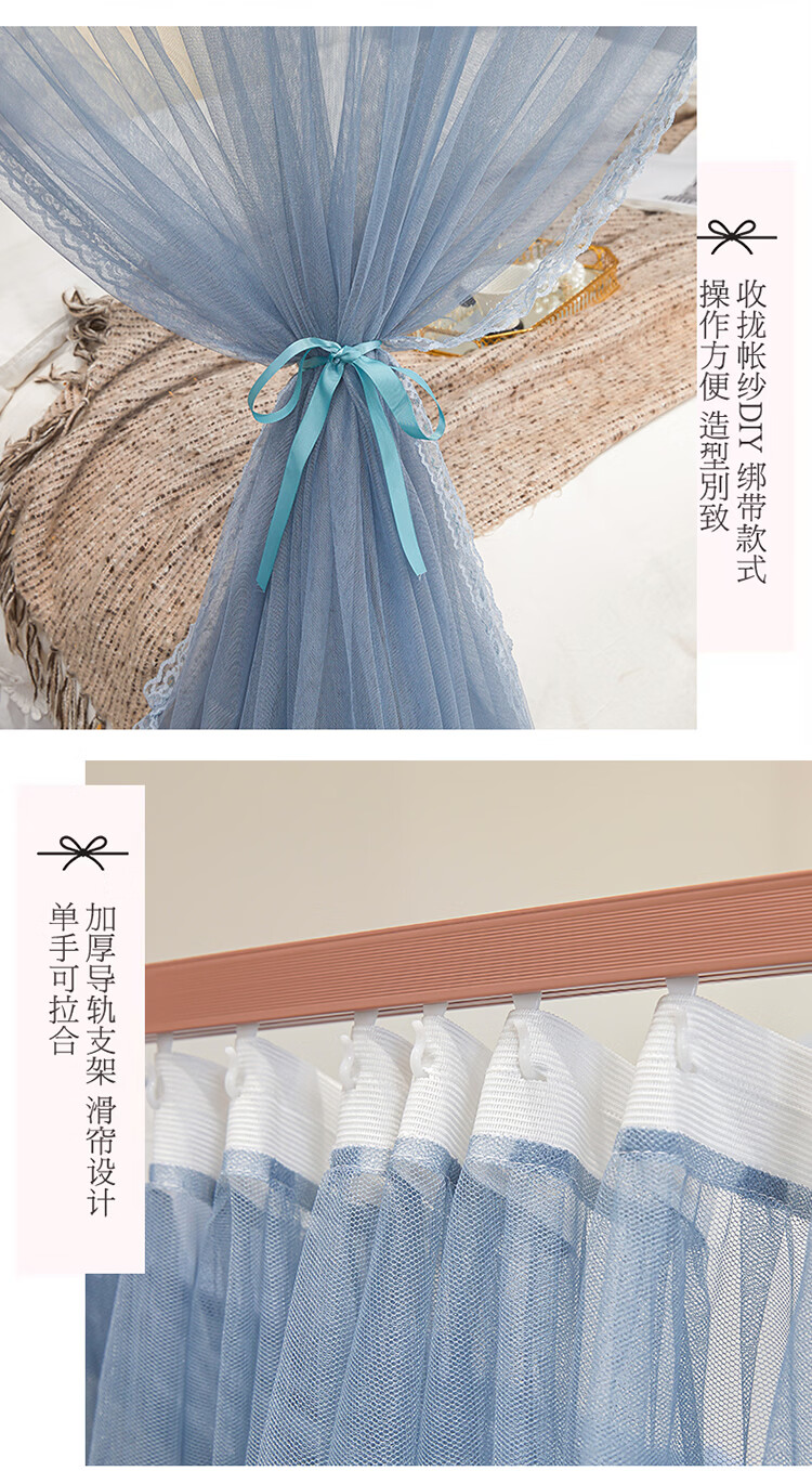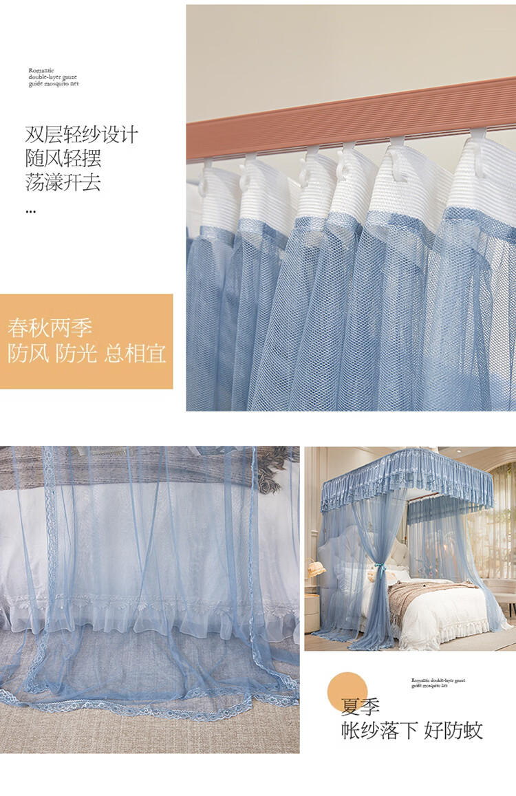 无印良品u型导轨蚊帐1.8x2米家用免安装2026新款蕾丝落地全包围防蚊一体式 花香其乐-蓝灰【随意调高度 滑轮不卡顿】 120cm*200cm*210cm 【加粗支架 铝合金导轨】