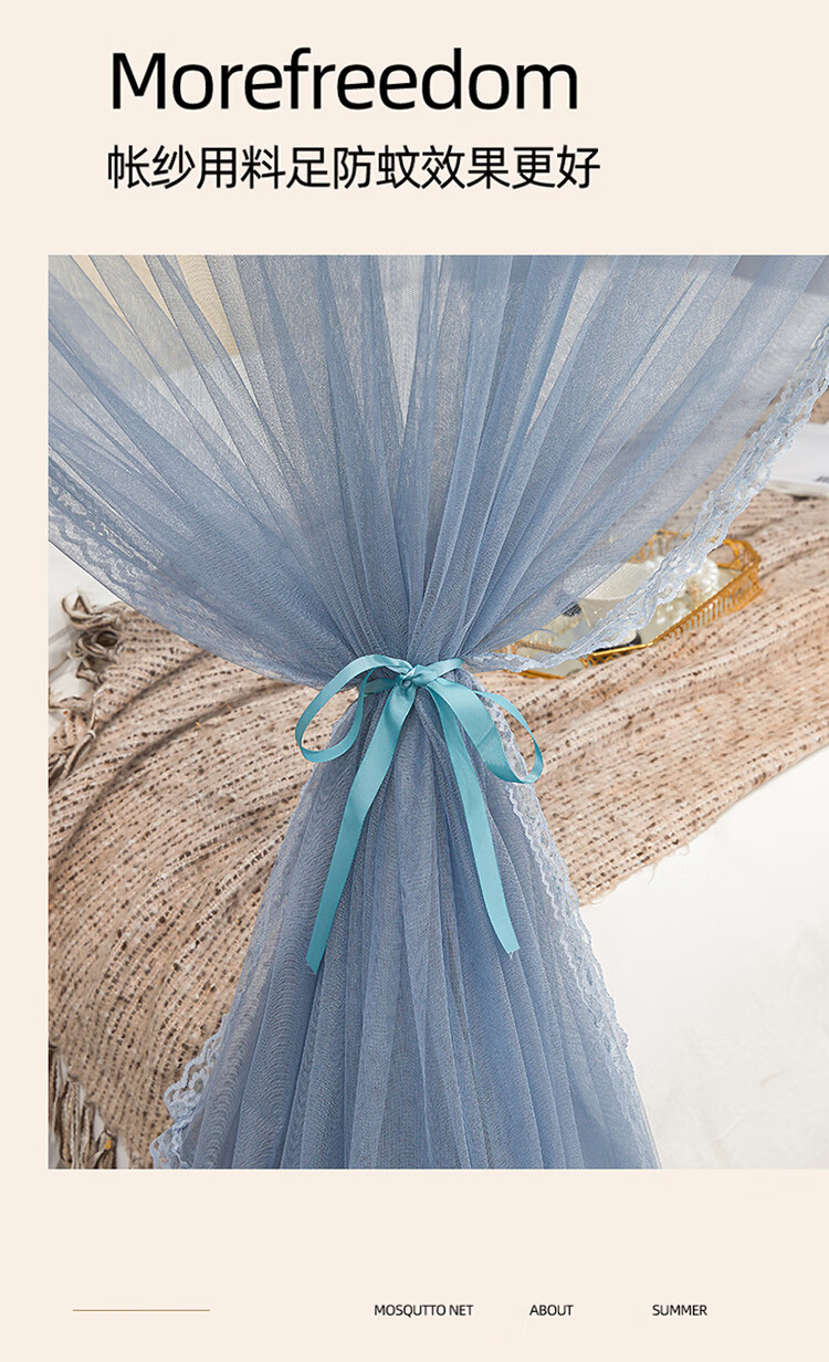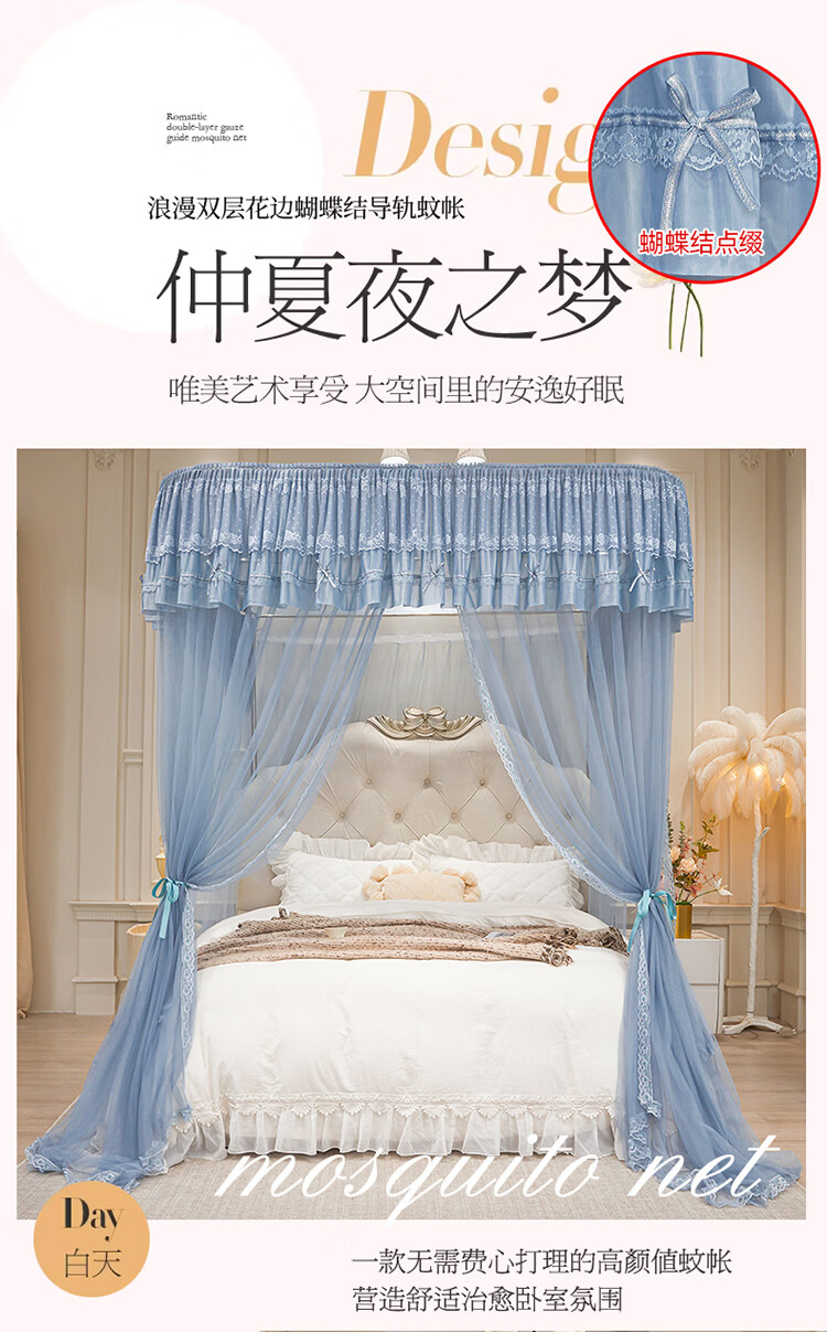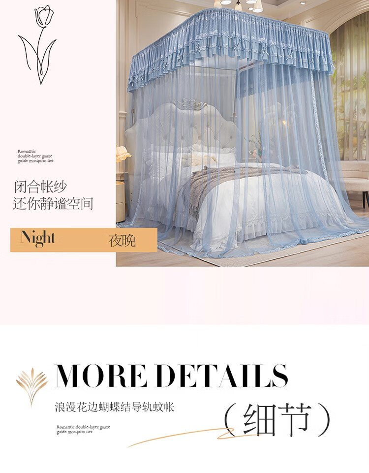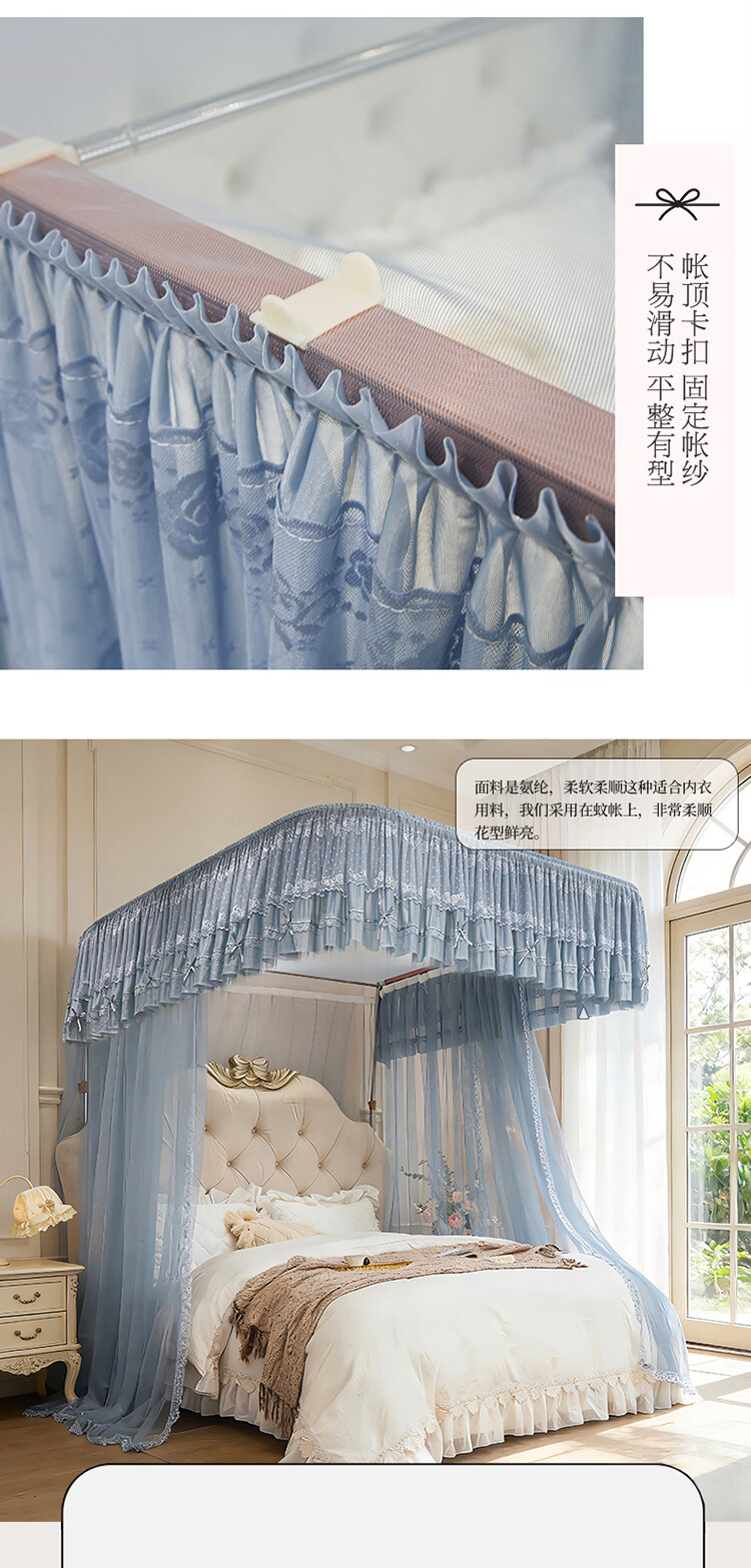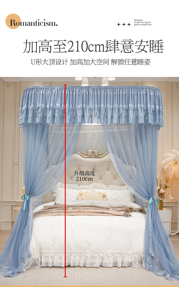 无印良品u型导轨蚊帐1.8x2米家用免安装2026新款蕾丝落地全包围防蚊一体式 花香其乐-蓝灰【随意调高度 滑轮不卡顿】 120cm*200cm*210cm 【加粗支架 铝合金导轨】